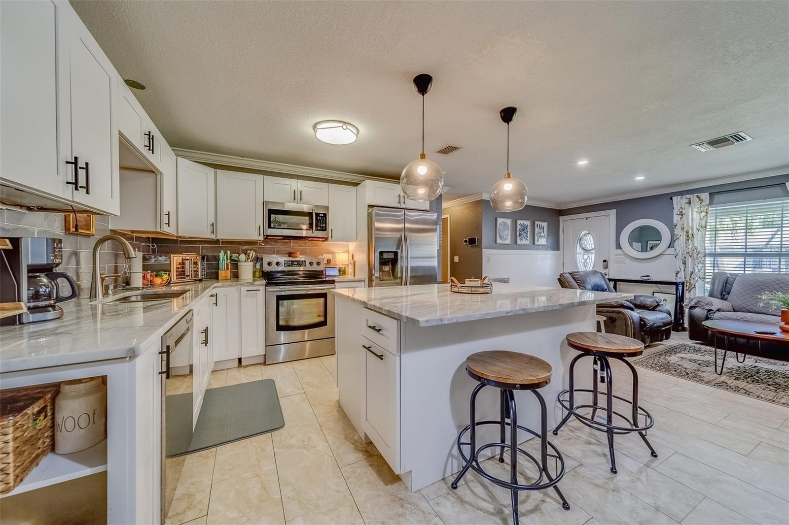 Bem-vindo à casa dos seus sonhos em 7838 Avenal Loop! Esta encantadora residência de 3 quartos e 2 banheiros está situada em um bairro tranquilo, a poucos minutos do Mitchell Ranch Plaza, onde uma variedade de restaurantes e lojas o aguardam. Desfrute da combinação perfeita de conveniência e serenidade. Entre para descobrir uma planta aberta convidativa, acentuada por elegantes azulejos de cerâmica por toda parte. O fluxo contínuo entre a sala de estar, a sala de estar e a cozinha cria um espaço ideal para a vida cotidiana e o entretenimento. O coração da casa é a cozinha espaçosa, com armários brancos modernos, bancadas de quartzo elegantes e eletrodomésticos de aço inoxidável - perfeita para aventuras culinárias e reuniões. Retire-se para a suíte principal, completa com banheiro privativo com box amplo e bancadas de granito. Esta planta dividida cuidadosamente projetada oferece dois quartos adicionais de bom tamanho, um localizado na frente e outro na parte de trás da casa, proporcionando flexibilidade para a família ou convidados, juntamente com um segundo banheiro convenientemente posicionado. Meticulosamente mantida e pronta para morar, esta casa também oferece a vantagem de não ter taxas de HOA! O quintal é igualmente atractivo, com um alpendre junto ao terceiro quarto, ideal para tomar o seu café da manhã enquanto desfruta do ar puro. O quintal totalmente cercado apresenta a tela perfeita para criar seu oásis privado. Os destaques adicionais incluem um sistema HVAC instalado em 2017, um telhado substituído em 2015, um aquecedor de água atualizado em 2020 e reformas de cozinha concluídas em 2020. Com belas praias próximas e os principais aeroportos de fácil acesso, sua nova casa oferece conveniência incomparável. Não perca a oportunidade de fazer do 7838 Avenal Loop o seu novo santuário!