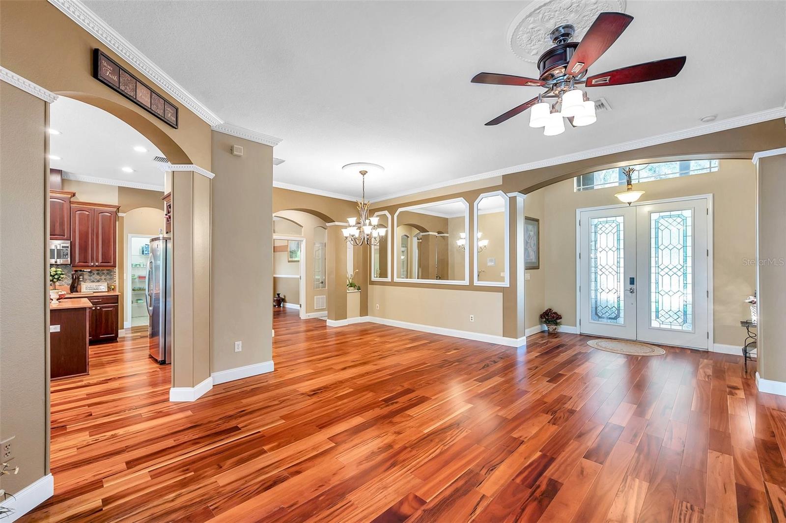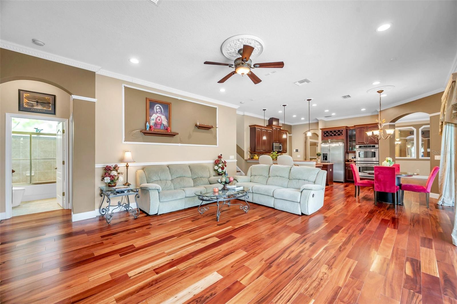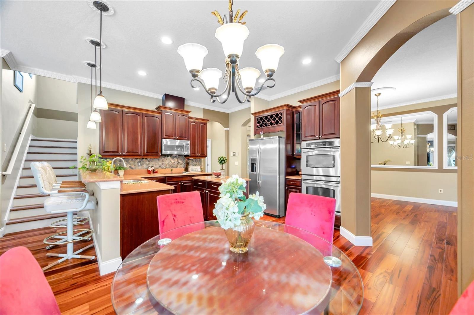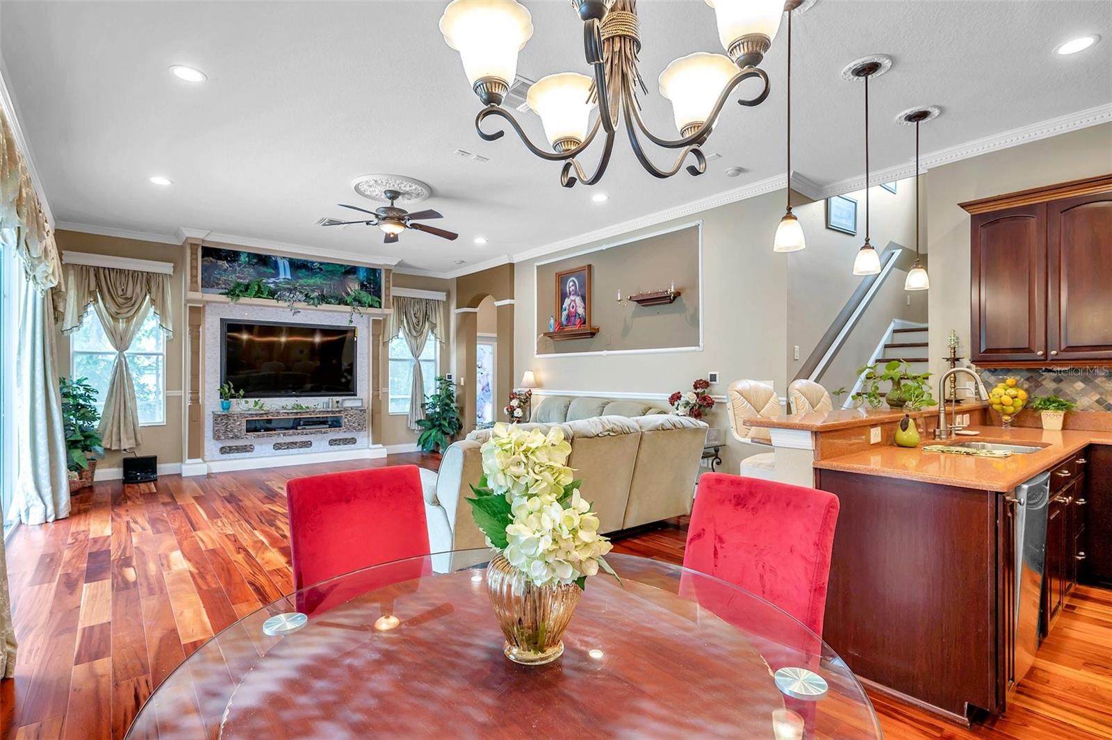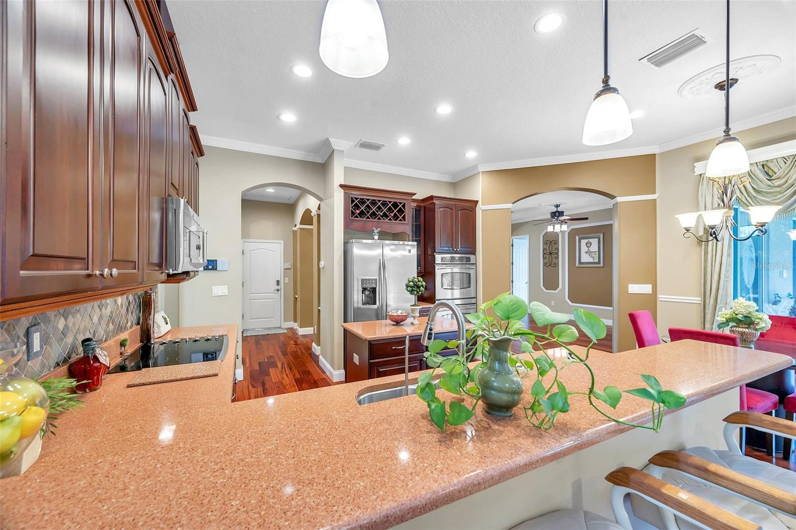 BEM-VINDO À SUA CASA EXECUTIVA em 9124 Topneck St, New Port Richey, FL, no sofisticado condomínio fechado de Waters Edge. Este modelo POPULAR Barrington possui 5 quartos + escritório + loft/bônus, 4 banheiros e garagem para 3 carros com quase 3.600 pés quadrados aquecidos e pouco menos de 4.600 pés quadrados no total. Esta casa fica em um lote GRANDE de 0,27 acres ou quase 12.000 pés quadrados com vista para o lago no quintal. Você vai adorar a PISCINA COM SPA SPILLOVER contida em uma ENORME varanda com tela e pavimentada. Há uma COZINHA EXTERIOR PERSONALIZADA IMPRESSIONANTE completa com frigobar, fogão a gás propano, churrasqueira, micro-ondas, pia dupla, armários de aço inoxidável, balcões de granito e backsplash de mosaico. Esta casa INCRÍVEL foi feita para ENTRETENIMENTO INTERIOR-EXTERIOR, já que a varanda e o quintal são acessíveis através de várias portas deslizantes de vidro do quarto principal, sala de estar, sala de jantar, sala de família e banheiro de piscina/suíte de quarto de hóspedes. MARAVILHOSAS características exteriores são NOVO TELHADO DE TELHA (1/2024), pedras empilhadas com estuque, paisagismo tropical, iluminação de realce, calhas de chuva, ampla entrada de automóveis e pátio frontal. Ao entrar pelas MARAVILHOSAS portas duplas de vidro francês, você se apaixonará pela planta aberta, lindos pisos de madeira e tetos altos. A planta aberta consiste em hall de entrada, cozinha, sala de jantar, sala de estar, jantar e salas familiares. A cozinha GOURMET possui balcões Corian, eletrodomésticos em aço inox (fogão, forno duplo, micro-ondas, lava-louças, descarte), luminárias suspensas sobre a bancada do café da manhã, ilha central, backsplash de azulejos, armários de madeira PREMIUM com moldura superior e ferragens e DESPENSA WALK-IN . Crie memórias familiares durante o jantar na sala de jantar formal com lustre EXQUISITO ou relaxe na sala familiar com uma PAREDE DE MÍDIA DE PEDRA empilhada com TV incluída! Retire-se para a SUÍTE DE QUARTO PRIMÁRIO NO PRIMEIRO ANDAR com teto falso, closets duplos e banheiro privativo. O banheiro principal RELAXANTE consiste em pias duplas, balcões de pedra, armários combinando, banheira de imersão de jardim WHIRLPOOL/SPA, chuveiro separado, banco de chuveiro, box de vidro e armário de banheiro privativo. Na ala oposta da casa há um quarto de hóspedes com banheiro combinado com chuveiro/banheira (banheira de piscina). Você trabalha em casa? O escritório DEDICADO com portas francesas duplas está localizado ao lado da cozinha. Para resumir, o primeiro nível consiste nas seguintes salas: hall de entrada, cozinha, despensa, sala de estar, jantar, sala de jantar, escritório, quarto principal e banheiro, quarto de hóspedes e banheiro e lavanderia. No segundo nível, você encontrará a sala/loft bônus, mais 3 quartos, mais 2 banheiros completos e um armário de armazenamento com 2 conjuntos de sistemas HVAC. Todos os quartos podem acomodar confortavelmente móveis king size. O terceiro banheiro no andar de cima possui balcões de Corian e uma porta de bolso para separar a penteadeira do vaso sanitário e da banheira/chuveiro para maior privacidade. O 4º banheiro (atualização do construtor) é uma adição bem-vinda a esta casa. MAIS DETALHES para adorar esta casa: muitos ventiladores para fazer circular a brisa fresca, medalhões de teto, sancas em todo o 1º nível, detalhes em madeira em toda a casa (moldagem de cadeiras, paredes com detalhes acentuados, molduras de espelhos na sala de jantar), cores quentes complementares , entradas em arco, iluminação embutida e TRATAMENTOS PERSONALIZADOS em janelas e portas de vidro deslizantes. A taxa HOA inclui irrigação recuperada, lixo 2 vezes por semana com reciclagem, TV a cabo Spectrum e internet, segurança e comodidades como piscina, splashpad, academia, clubhouse, quadras de basquete/pickleball e píer/doca de pesca. FAÇA DESTA SUA FUTURA CASA!