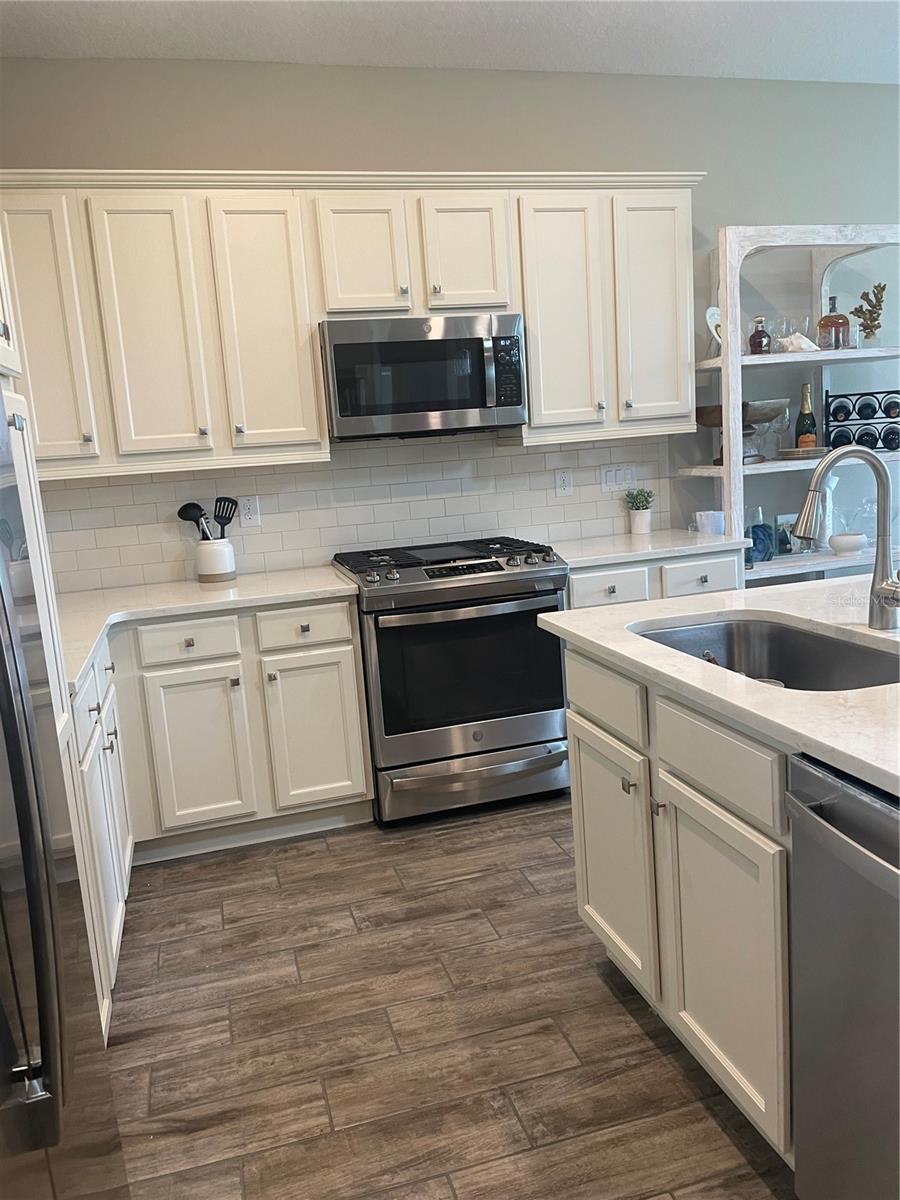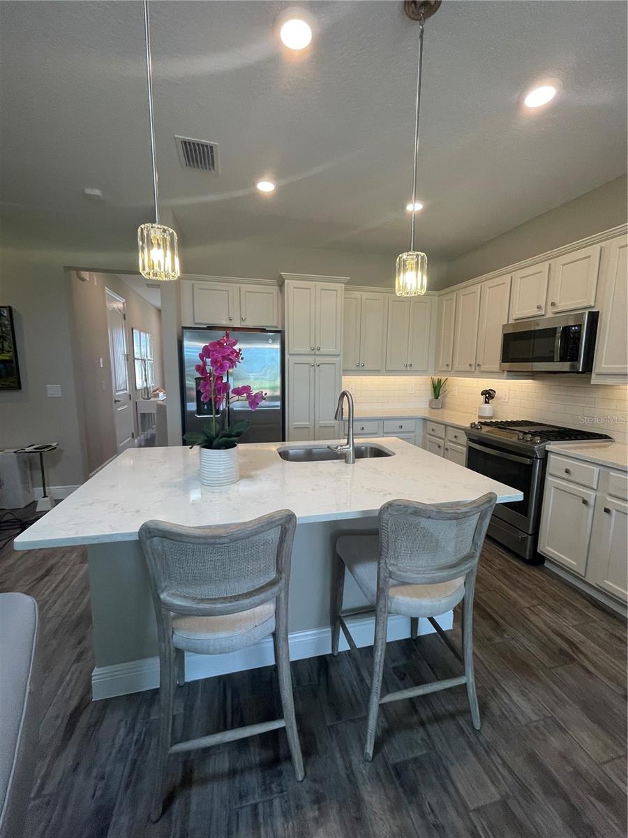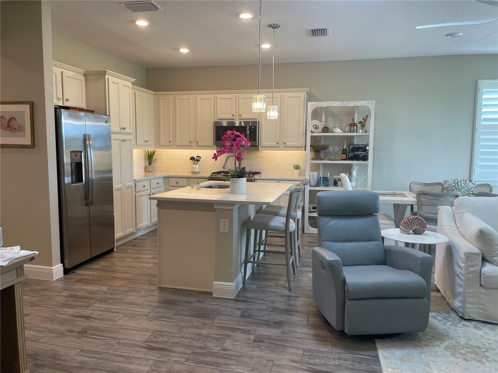 Casa requintada localizada em Ocala Preserve no campo de golfe, incluindo acesso total a todas as comodidades e desconto em restaurantes. A vila Aria foi totalmente atualizada, incluindo lindas bancadas de quartzo na cozinha e nos banheiros, porcelanato com aparência de pranchas de madeira, venezianas, rodapés de 5 1/4 ", prateleiras personalizadas em todos os armários, incluindo um closet personalizado no quarto principal, portas internas atualizadas de 8', clarabóia de tubo solar para muita iluminação natural e porta de chuveiro com banheira no segundo banheiro. A cozinha está bem equipada com eletrodomésticos de aço inoxidável, incluindo fogão a gás, forno de convecção, micro-ondas grande, lava-louças, geladeira e pia. Há uma grande ilha de cozinha com balcão de café da manhã e mesa de jantar. As atualizações de cozinha incluem pia grande, iluminação sob o armário, luzes pendentes de vidro, backsplash de azulejos de metrô, dobradiças e deslizamentos suaves e forno de convecção.