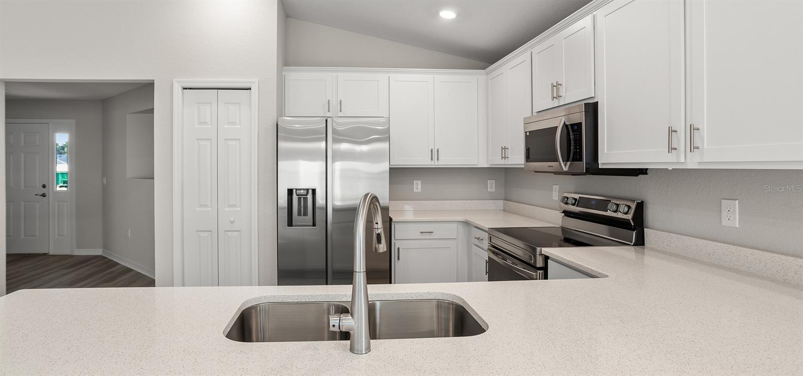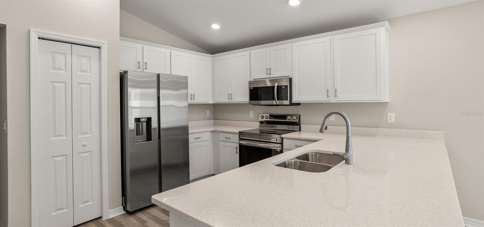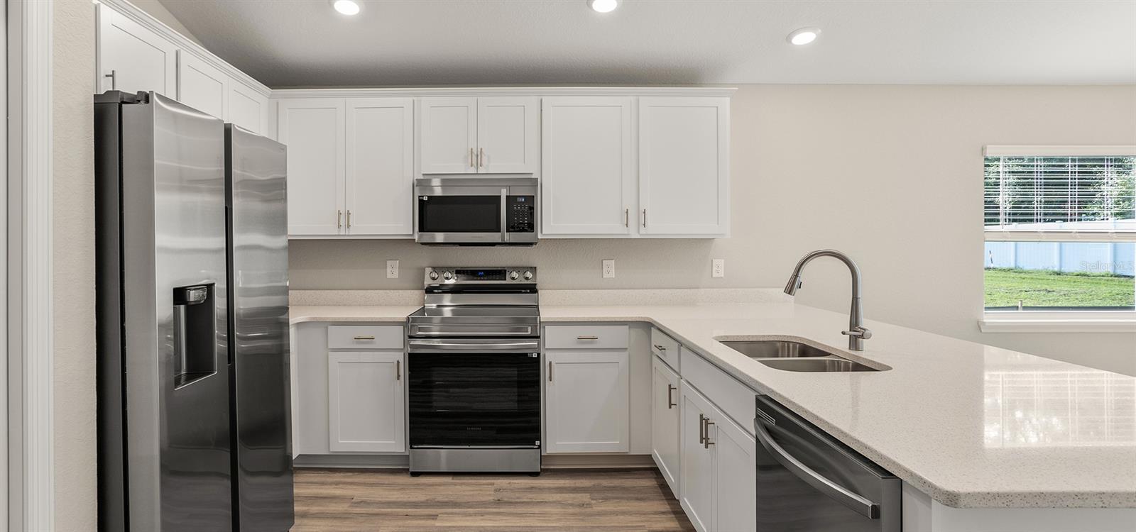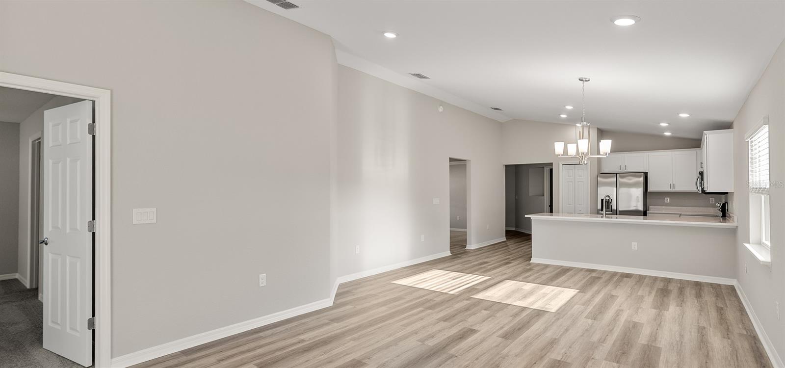 Nova casa de construção com 1.479 pés quadrados em um andar, incluindo 3 quartos, 2 banheiros e uma área de estar aberta. Desfrute de uma cozinha aberta com bancadas de quartzo, utensílios de aço inoxidável Samsung, despensa e uma espaçosa barra de altura do balcão, totalmente aberta ao café e sala de jantar. A área de estar, a lavanderia e os banhos incluem piso de tábua de vinil de madeira de luxo, com tapete resistente a manchas nos quartos. A suíte do seu proprietário é completa com um guarda-roupa e um banheiro privativo com um chuveiro e um armário de linho. Além disso, desfrute de um lanai coberto, garagem de 2 carros, persianas de janelas personalizadas, telhas arquitetônicas, isolamento e janelas com eficiência energética e uma garantia completa do construtor. Observe que a turnê virtual/fotos mostra o layout doméstico; Cores e opções de design em casa real para venda podem diferir. Móveis e decoração não transmitem.