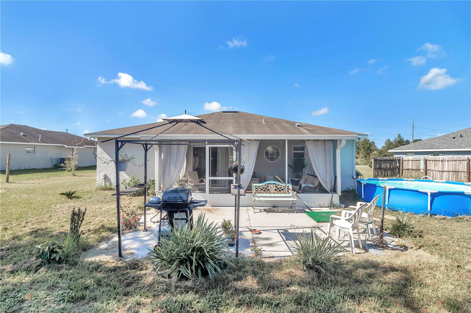 CASA DE ESTUQUE DE BLOCO DE CONCRETO 2006 SEM HOA! PLANTA ABERTA ESPAÇOSA COM LANAI TELA E COBERTA COM VISTA PARA QUINTAL COM PISCINA ACIMA DO SOLO. ENTRE PELA PORTA DA FRENTE E SEJA RECEBIDO PELA PRANCHA DE VINIL DE LUXO COM ARCO. À ESQUERDA ESTÃO OS 2º E 3º QUARTOS COM 2º BANHO COMPARTILHADO COM BANHEIRA COMBINADA E CHUVEIRO COM PISO LVP. ESTA ÁREA LEVA A UMA GRANDE SALA DE ESTAR COM TETOS ABOBADOS E PRATELEIRAS. O QUARTO PRIMÁRIO FICA FORA DESTA ÁREA E OFERECE UM LUGAR PARA DESCANSAR E O BANHO PRIMÁRIO TEM BANHEIRA DE IMERSÃO, DUCHE COM PORTA DE VIDRO E BANHO DUPLO. DE VOLTA PELA SALA DE ESTAR E LEVA À SEGUNDA SALA DE FAMÍLIA E SALA DE JANTAR COM VISTA PARA A COZINHA COM PENÍNSULA COM MUITO ESPAÇO PARA BANCOS DE BAR. A ÁREA DA SALA DE PEQUENO ALMOÇO TAMBÉM É UM ESPAÇO EXTRA PARA JANTAR. ESTA ÁREA LEVA AO INTERIOR DA LAVANDERIA COM PRATELEIRAS. GARAGEM PARA 2 CARROS. SAINDO DA SEGUNDA SALA DE ESTAR PARA TRIAGEM EM LANAI COM CORTINAS DE PRIVACIDADE. ESTA ÁREA DE TELA LEVA A BAKYARD PRIVADO COM PISCINA!