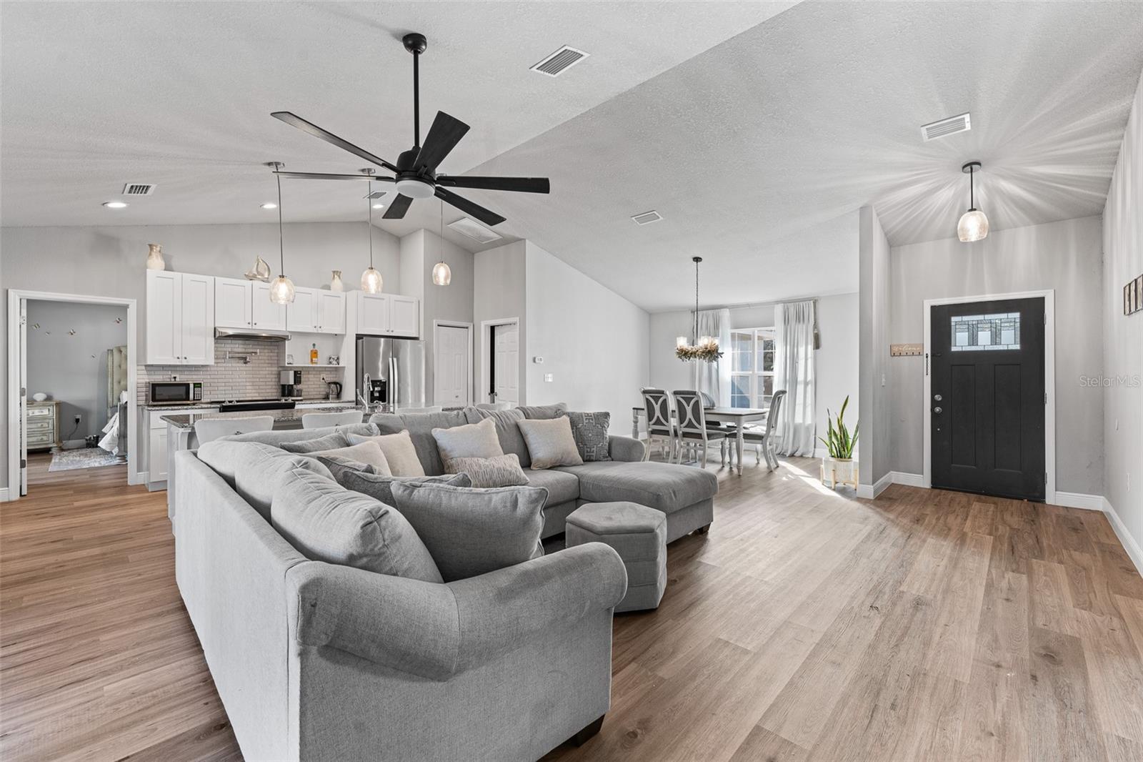 Venda a descoberto. Bem-vindo ao seu retiro dos sonhos em Marion Oaks! VENDEDORES MOTIVADOS!!!! Entre nesta casa deslumbrante e quase nova e sinta uma sensação instantânea de calor e elegância. Com apenas 1,5 anos de idade, esta beleza recebe você com uma entrada longa e convidativa, detalhes em pedra atraentes e uma linda porta da frente com uma janela decorativa que dá o tom ao que está dentro. Ao passar pela porta, esteja preparado para se apaixonar pela planta aberta e arejada que flui sem esforço sob o brilho das luminárias atualizadas e da abundante luz natural que flui através das grandes janelas. Não há tapete aqui! O lindo piso de pranchas de vinil é executado por toda parte, adicionando estilo e fácil manutenção. No coração da casa, a cozinha dos sonhos do chef está pronta para impressionar! Uma ilha espaçosa de 2,7 metros é o local de encontro perfeito, enquanto bancadas de granito, uma elegante pia de granito, armários atualizados, backsplash de azulejos elegantes e eletrodomésticos Whirlpool de aço inoxidável (incluindo um elegante fogão deslizante e exaustor) criam um espaço de parar o show. E sim, há até um enchimento de panela para maior comodidade! As atualizações cuidadosas continuam em toda a casa, desde rodapés aparados de 6 polegadas até ventiladores de teto atualizados e charmosas portas francesas que levam ao quintal. O luxuoso banheiro master é um verdadeiro santuário, com box amplo com vidro requintado e detalhes decorativos em azulejos. Não, HOA! Aproveite a liberdade de ser proprietário de uma casa sem taxas adicionais enquanto aproveita a quadra de basquete, shuffleboard, vôlei de praia e playground do Marion Oaks Community Center.