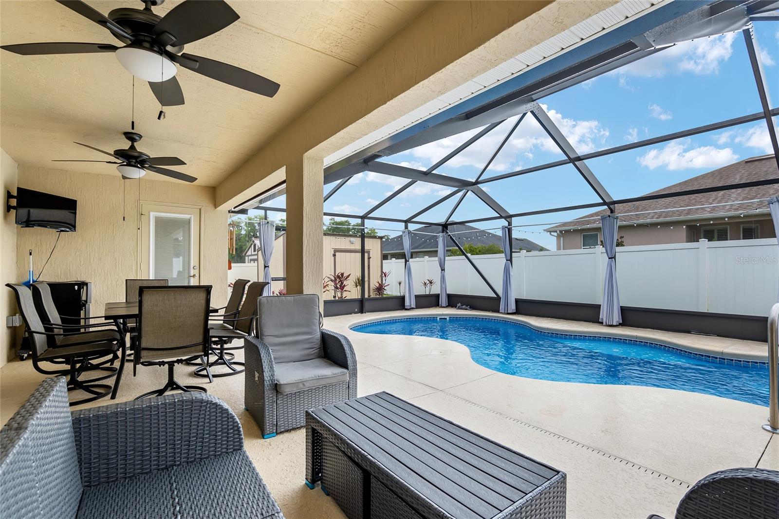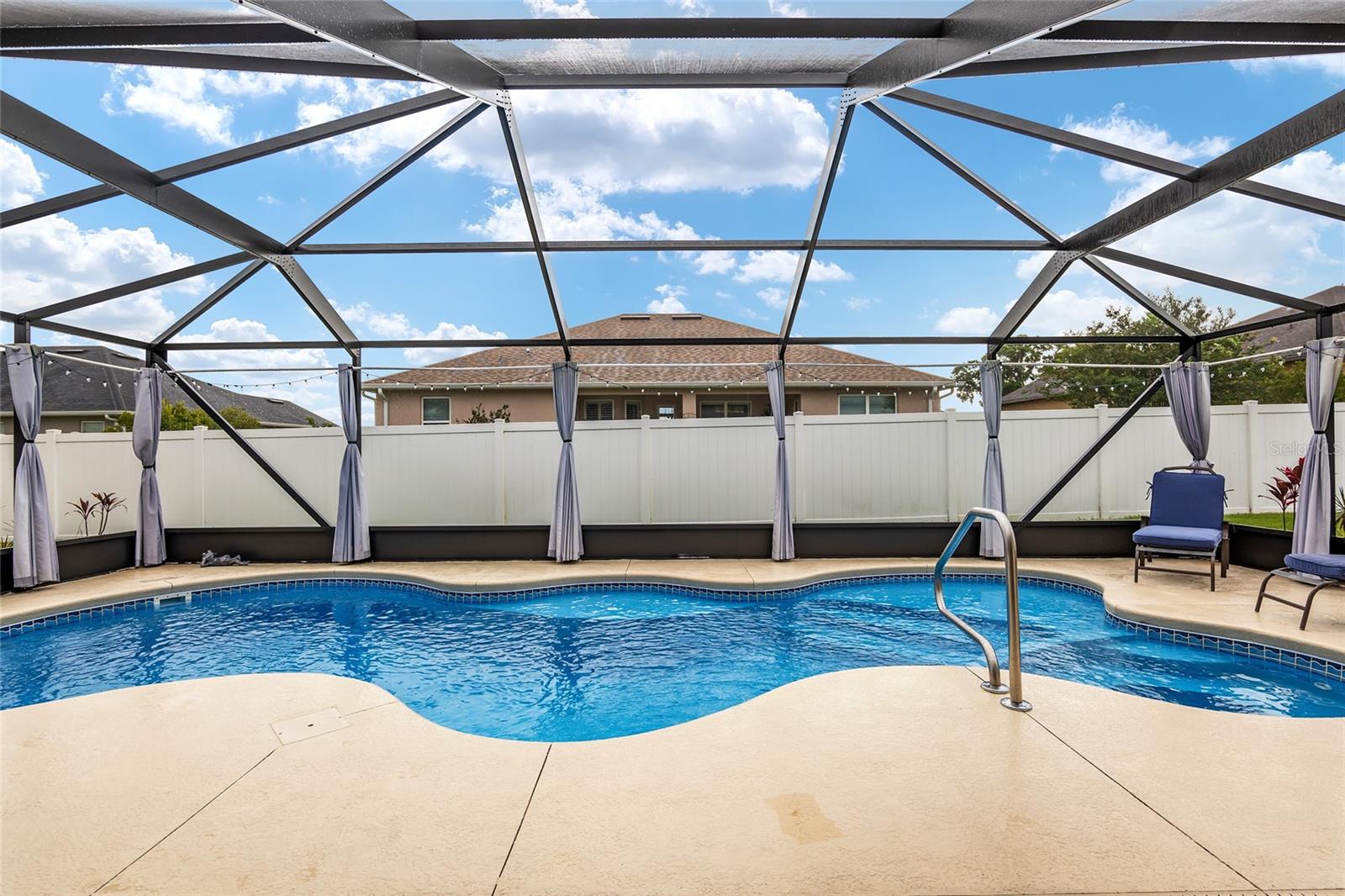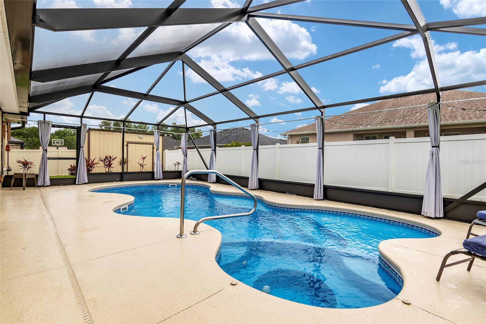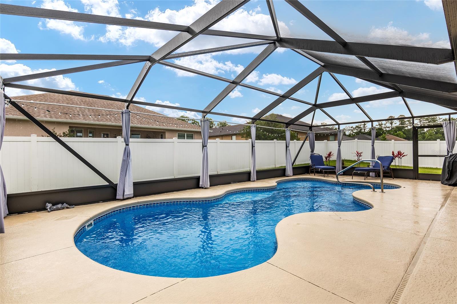 Bem-vindo ao St James Park, condomínio fechado em Ocala. PISCINA EM CASA! Espaçosa casa QUASE NOVA com 4 quartos e 3 banheiros com planta tripla dividida. Decorados com bom gosto em toda a casa com acessórios atualizados. Planta aberta e tetos de 10 pés. A cozinha tem bancadas em granito, despensa, balcão para café da manhã e área para refeições casuais. Ampla sala de estar e área de jantar formal. Escritório/escritório/sala flexível para necessidades de estilo de vida pessoal. O quarto principal possui 2 closets, banheiro com banheira, chuveiro separado, vaso sanitário privativo e duas pias. Há uma porta que leva à varanda e à piscina do quarto principal. Varanda coberta para entretenimento e piscina. Galpão para permanecer. Quintal cercado de vinil. Painéis solares para energia verde e eficiência. Vendedores se mudando. Ótima casa com tantos extras.