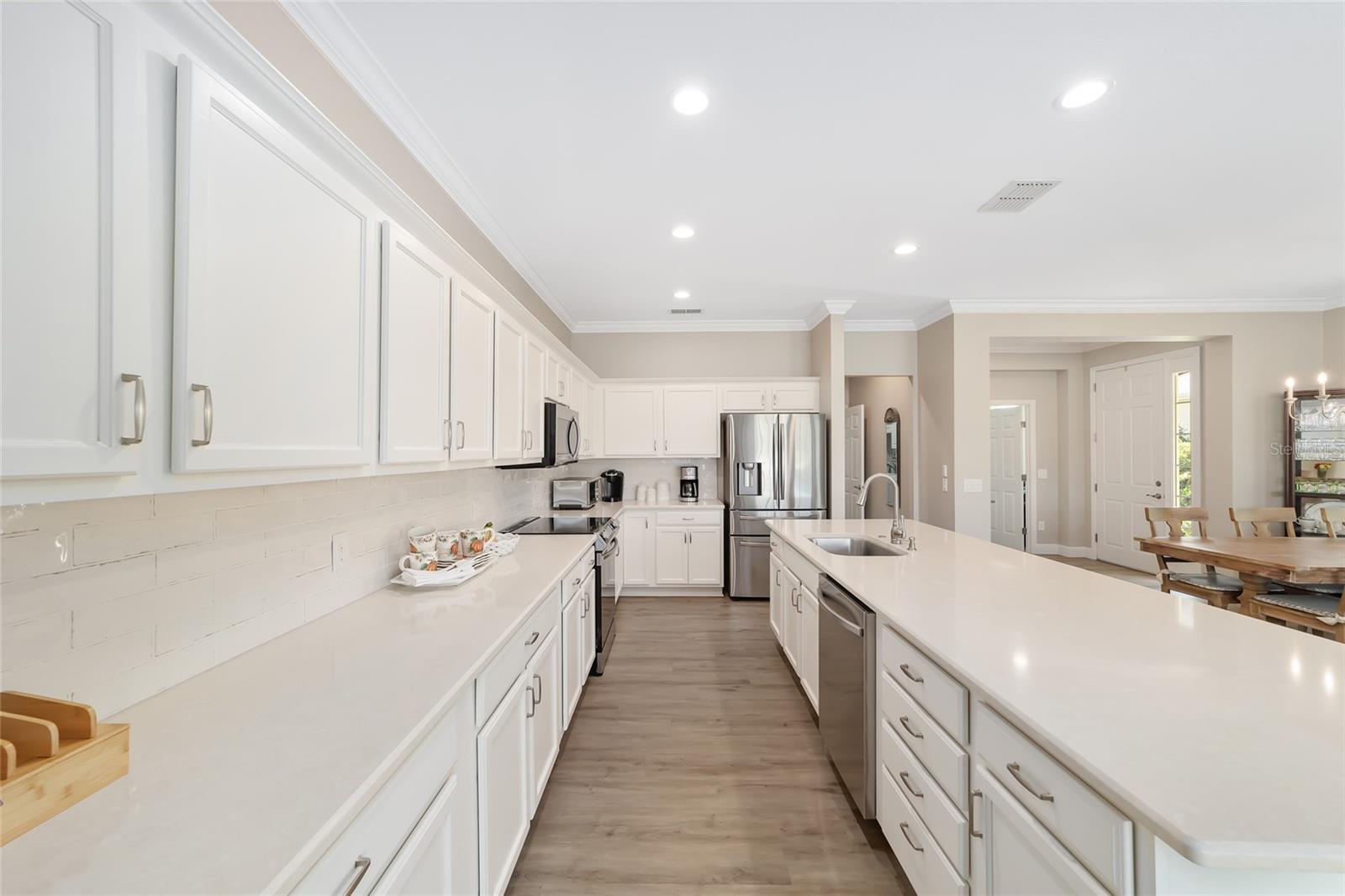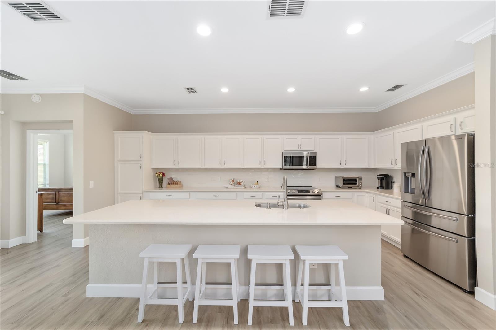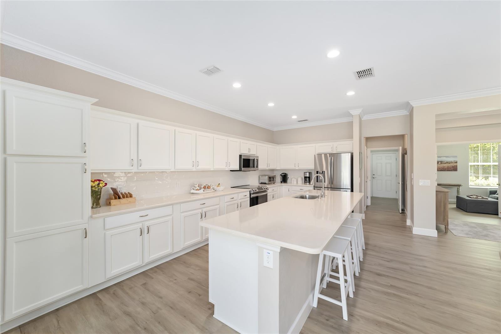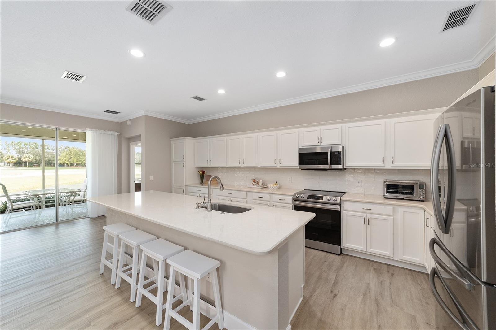 Villa LINDA sem manutenção, completamente reformada, 2bd/2ba, quarto flexível e garagem para 2 carros localizada em Stone Creek por Del Webb. Esta casa possui piso de vinil luxuoso, sancas, placas de base mais altas e persianas por toda parte. A cozinha tem uma grande ilha, armários recém-pintados, eletrodomésticos de aço inoxidável atualizados, bancadas de quartzo, backsplash e iluminação embutida. Área de jantar de tamanho perfeito. A sala possui ventilador de teto e linda vista para o campo de golfe e lago. O quarto principal possui ventilador de teto e closet. O banheiro principal possui chuveiro personalizado com porta e bancada de vidro sem moldura, bancadas de quartzo, espelhos e iluminação atualizados. Quarto de hóspedes espaçoso com ventilador de teto. O banheiro de hóspedes possui chuveiro personalizado com porta de vidro sem moldura e bancadas de quartzo. A lavanderia possui armários superiores e inferiores e pia embutida. Vistas deslumbrantes da varanda com vista para o campo de golfe e o lago. Aquecedor elétrico de água sem tanque. Novo A/C em 2022, Novo Telhado em 2024. Não há absolutamente nada para fazer nesta linda casa a não ser mudar-se!