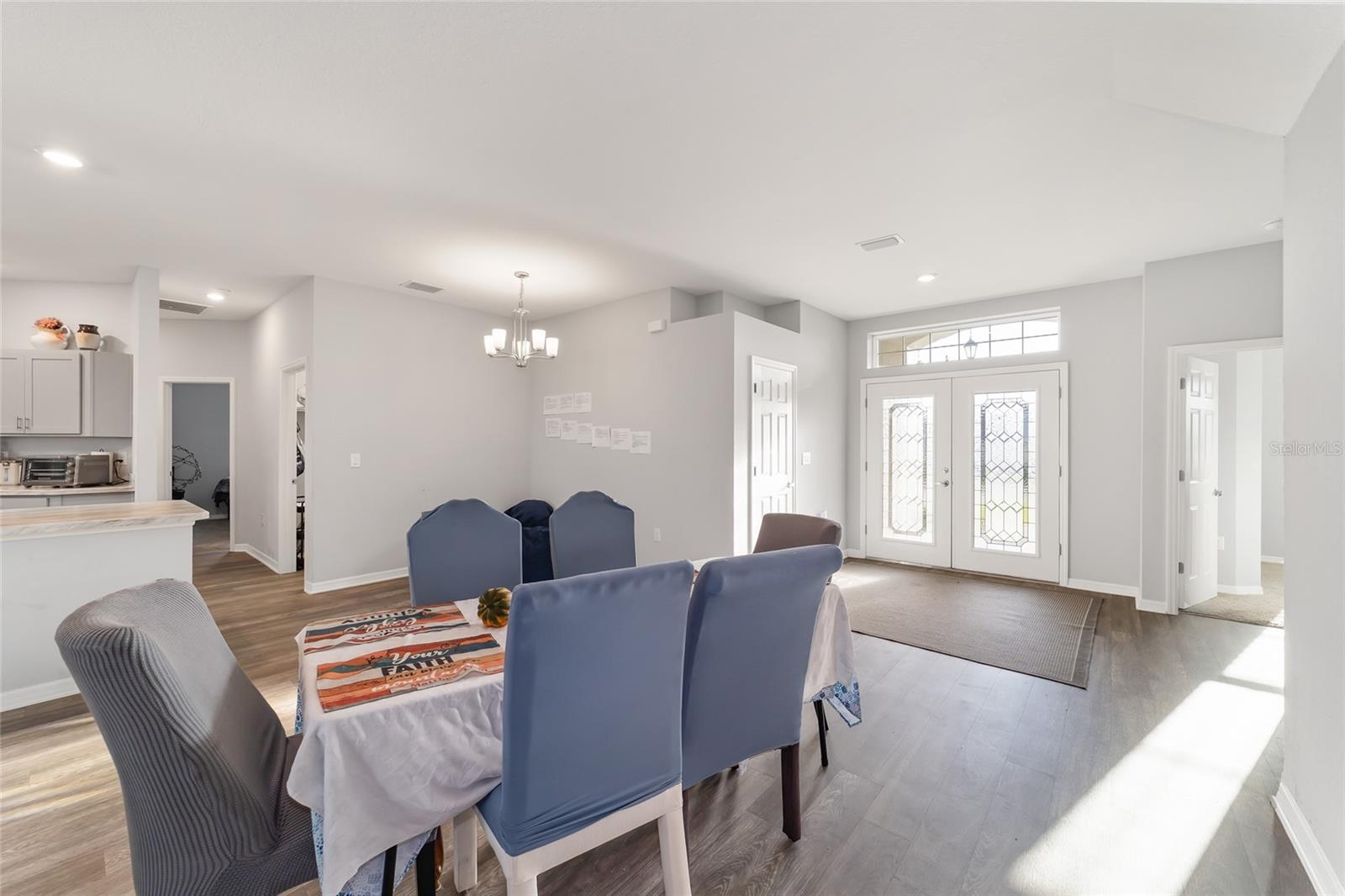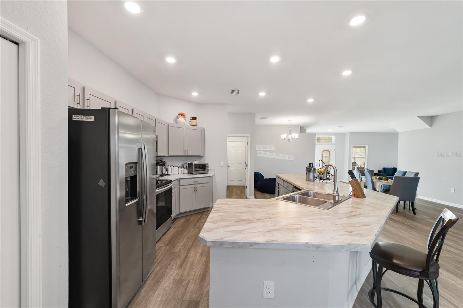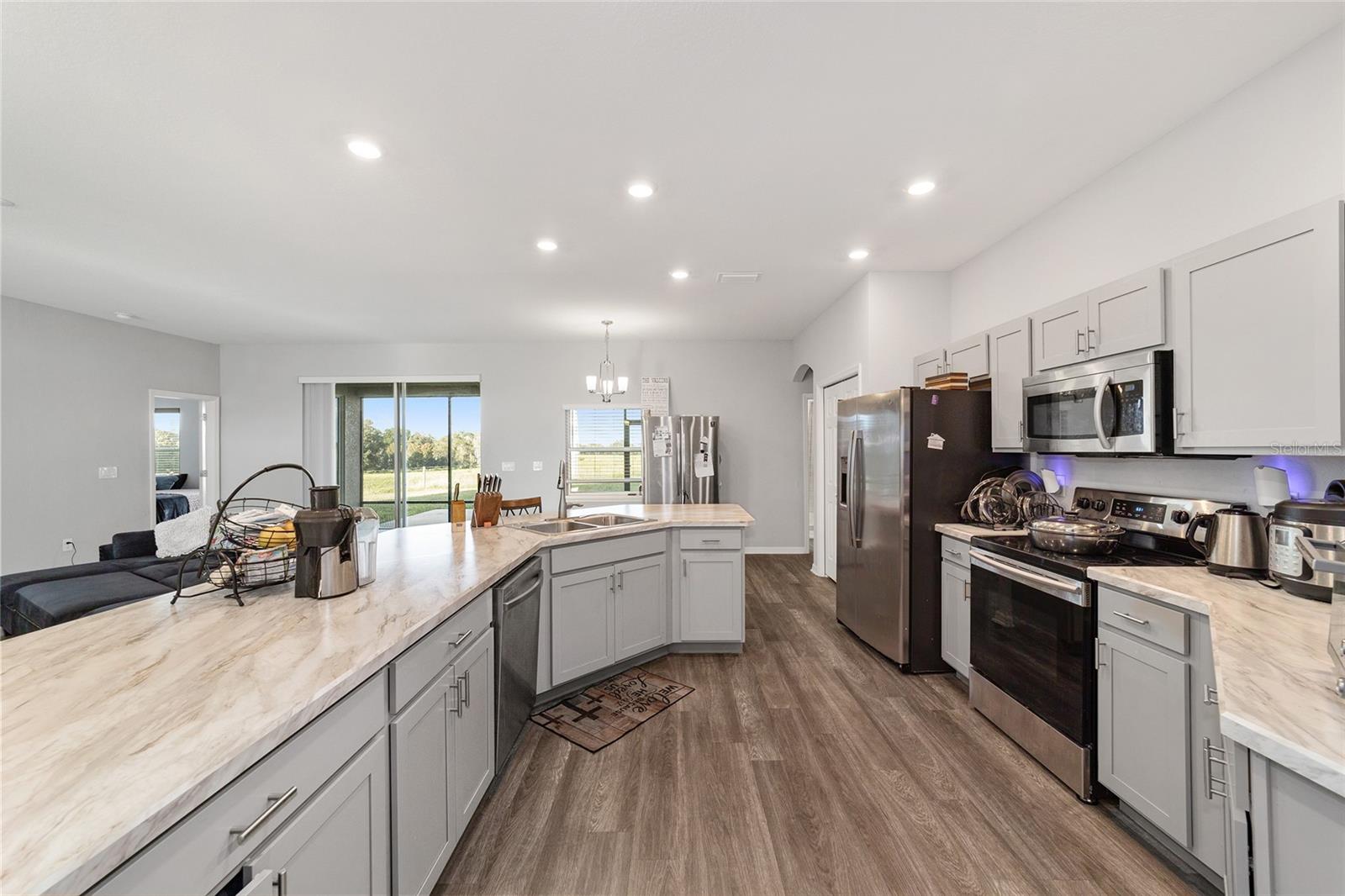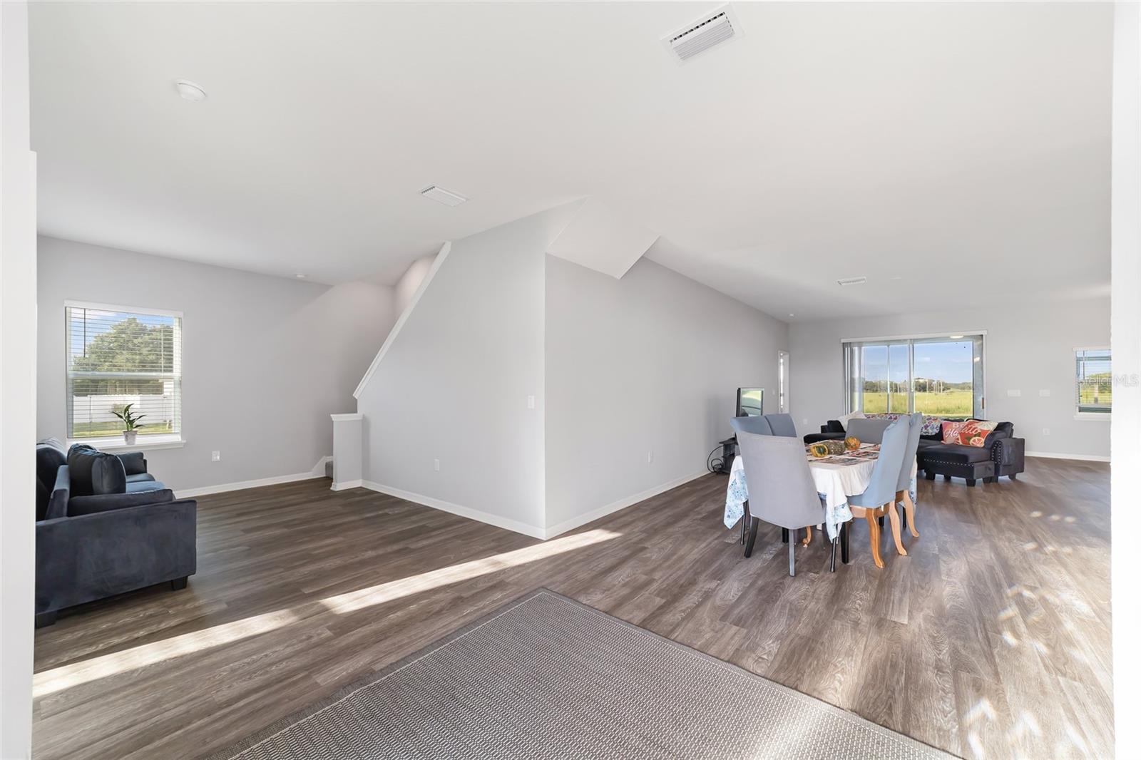 Localizada em um lote de esquina Premium com vista para terras agrícolas, sem vizinhos de um lado e atrás desta casa tripla dividida com 5 quartos/3,5 banheiros, oferece todo o espaço extra que você está procurando. Esta casa quase nova de dois andares apresenta uma entrada com detalhes em pedra e uma porta frontal embutida em vidro que se abre para uma paleta de cores neutras claras e brilhantes, com tetos altos e uma planta aberta perfeita para entretenimento. O nível principal desta casa oferece uma grande cozinha com iluminação embutida, muitos armários e balcão, uma despensa para necessidades extras de armazenamento e assentos na altura do bar para refeições casuais. A cozinha tem vista para a espaçosa sala de reuniões, oferecendo controles deslizantes convenientemente posicionados e abertos para uma sala com tela na Flórida, perfeita para entretenimento ao ar livre ou relaxamento enquanto desfruta de vistas tranquilas do pasto. A suíte do proprietário no 1º andar oferece mais vistas excelentes e acesso direto ao exterior, um grande closet e um banheiro privativo com pia dupla e box amplo com azulejos de vidro e janela de popa para excelente iluminação natural. A vida no primeiro andar também oferece três quartos de hóspedes, mais dois banheiros completos e um espaço flexível que pode ser usado como área de estar casual ou escritório doméstico. No andar de cima, você encontrará uma área de estar bônus no loft com um lavabo conveniente, permitindo um espaço extra fantástico para uma sala de jogos, escritório ou sala de mídia. Como benefício adicional, você pode desfrutar de um sistema solar para toda a casa que aproveita a energia do sol para que você possa reduzir seu consumo de energia e desfrutar de economias significativas em suas contas de energia. A comunidade também oferece uma excelente localização com acesso conveniente a lojas, restaurantes, parques públicos, instalações médicas e a uma curta distância de carro de The Villages. Os entusiastas do ar livre também poderão desfrutar de uma variedade de comodidades e atrações de fácil acesso, como Santos Trails, um destino popular para caminhadas e ciclismo, e o Campo de Golfe Baseline, a pouco mais de 1,6 km de distância.