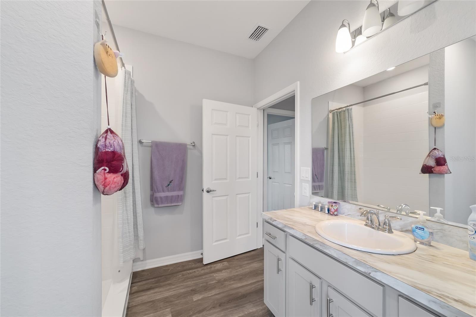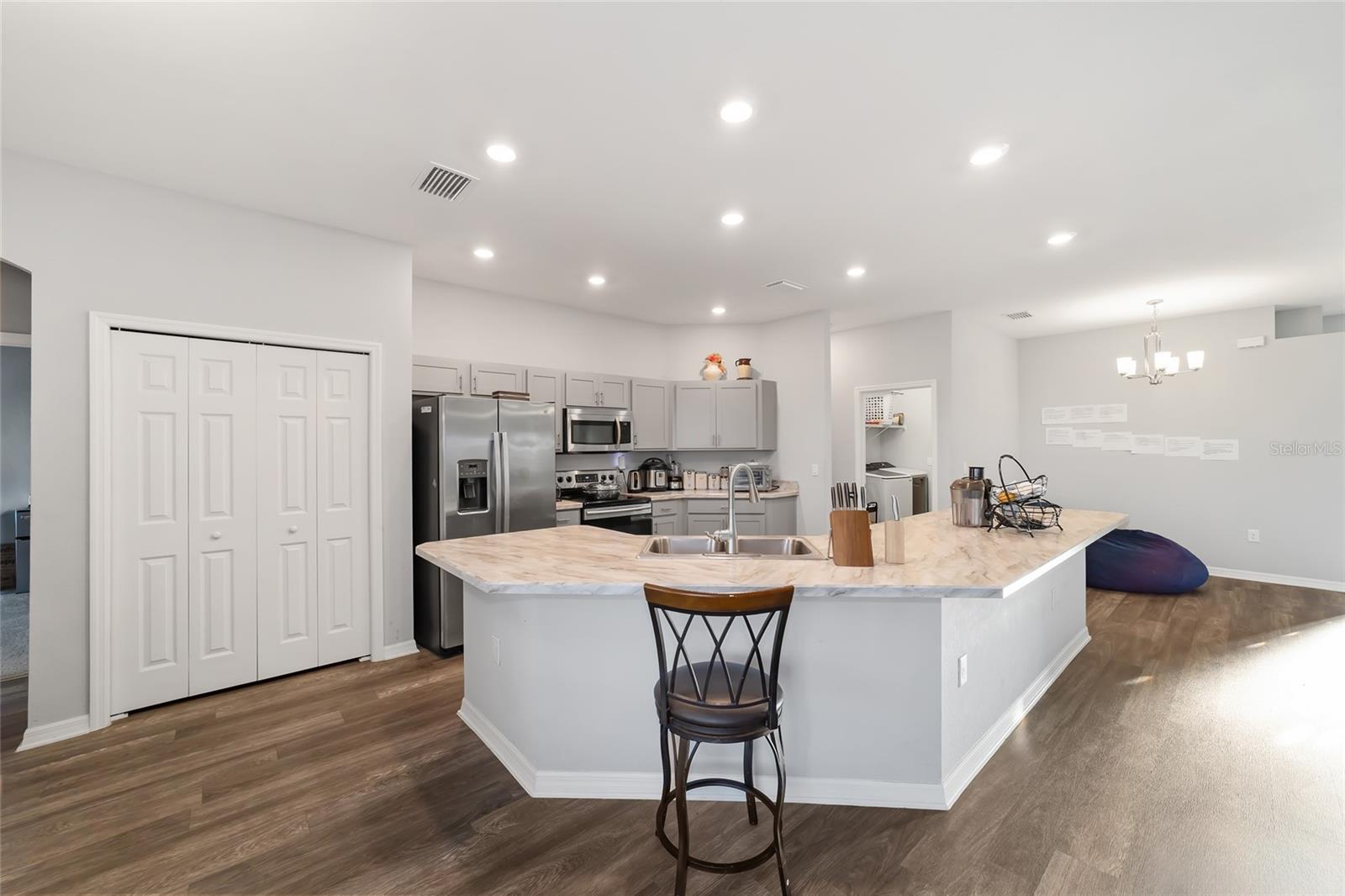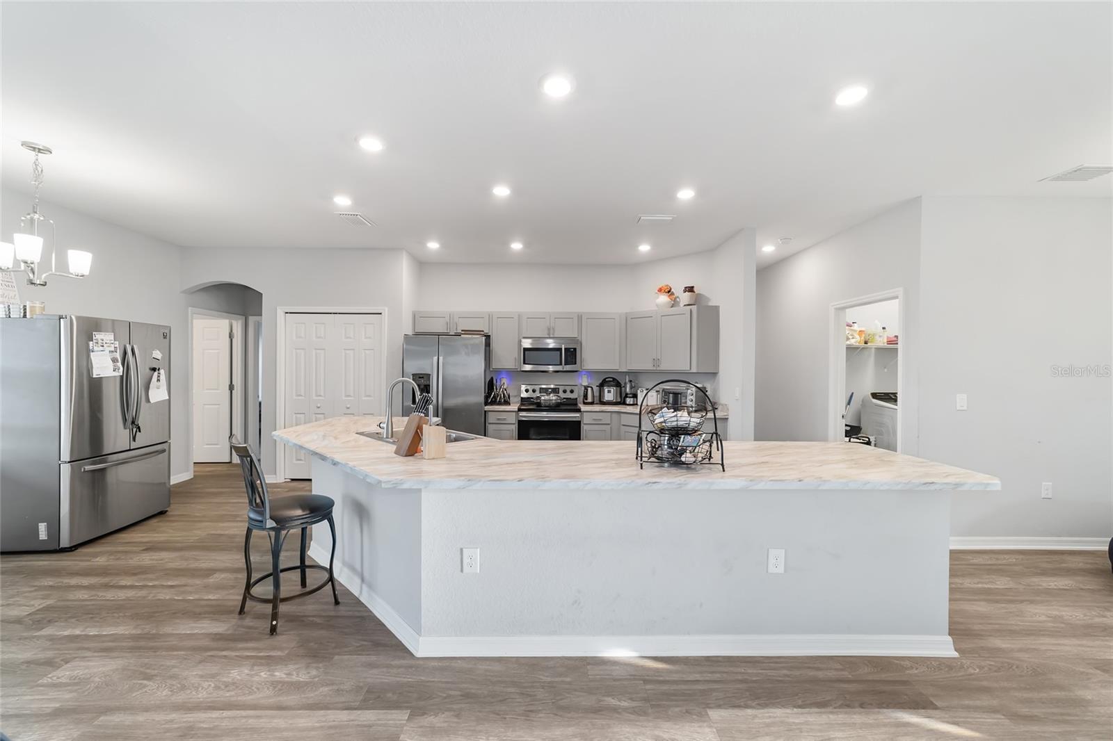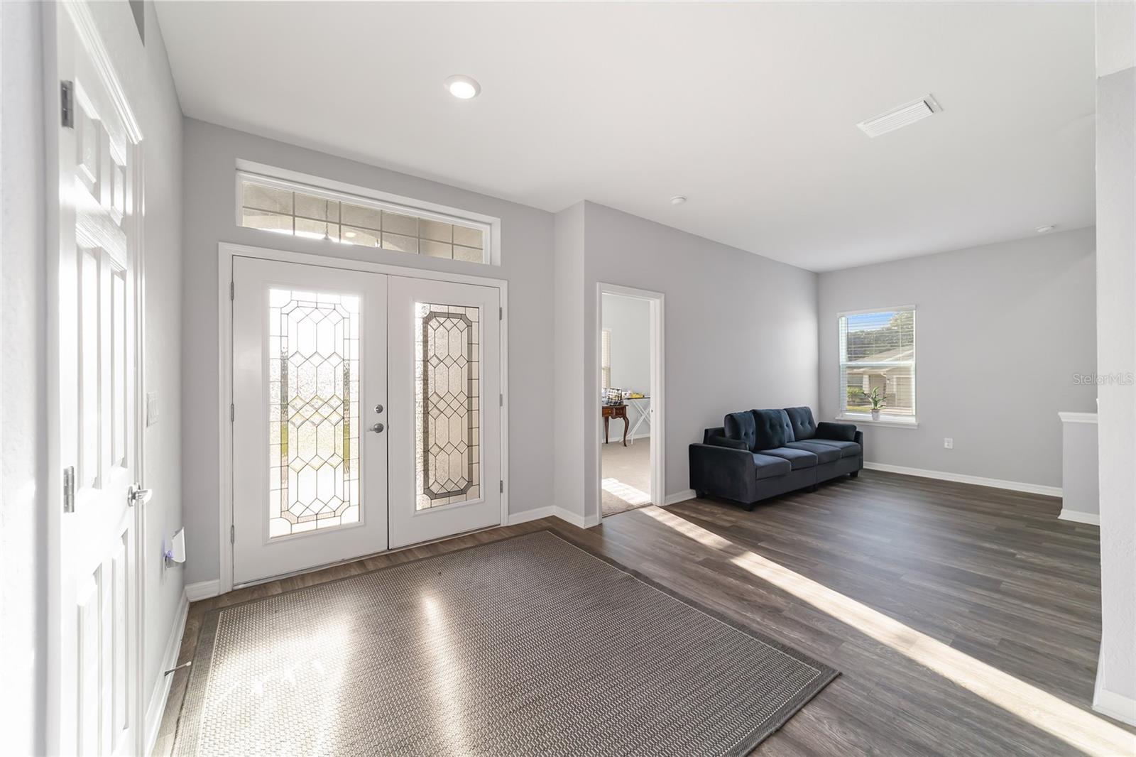Localizada em um lote de esquina Premium com vista para terras agrícolas, sem vizinhos de um lado e atrás desta casa tripla dividida com 5 quartos/3,5 banheiros, oferece todo o espaço extra que você está procurando. Esta casa quase nova de dois andares apresenta uma entrada com detalhes em pedra e uma porta frontal embutida em vidro que se abre para uma paleta de cores neutras claras e brilhantes, com tetos altos e uma planta aberta perfeita para entretenimento. O nível principal desta casa oferece uma grande cozinha com iluminação embutida, muitos armários e balcão, uma despensa para necessidades extras de armazenamento e assentos na altura do bar para refeições casuais. A cozinha tem vista para a espaçosa sala de reuniões, oferecendo controles deslizantes convenientemente posicionados e abertos para uma sala com tela na Flórida, perfeita para entretenimento ao ar livre ou relaxamento enquanto desfruta de vistas tranquilas do pasto. A suíte do proprietário no 1º andar oferece mais vistas excelentes e acesso direto ao exterior, um grande closet e um banheiro privativo com pia dupla e box amplo com azulejos de vidro e janela de popa para excelente iluminação natural. A vida no primeiro andar também oferece três quartos de hóspedes, mais dois banheiros completos e um espaço flexível que pode ser usado como área de estar casual ou escritório doméstico. No andar de cima, você encontrará uma área de estar bônus no loft com um lavabo conveniente, permitindo um espaço extra fantástico para uma sala de jogos, escritório ou sala de mídia. Como benefício adicional, você pode desfrutar de um sistema solar para toda a casa que aproveita a energia do sol para que você possa reduzir seu consumo de energia e desfrutar de economias significativas em suas contas de energia. A comunidade também oferece uma excelente localização com acesso conveniente a lojas, restaurantes, parques públicos, instalações médicas e a uma curta distância de carro de The Villages. Os entusiastas do ar livre também poderão desfrutar de uma variedade de comodidades e atrações de fácil acesso, como Santos Trails, um destino popular para caminhadas e ciclismo, e o Campo de Golfe Baseline, a pouco mais de 1,6 km de distância.