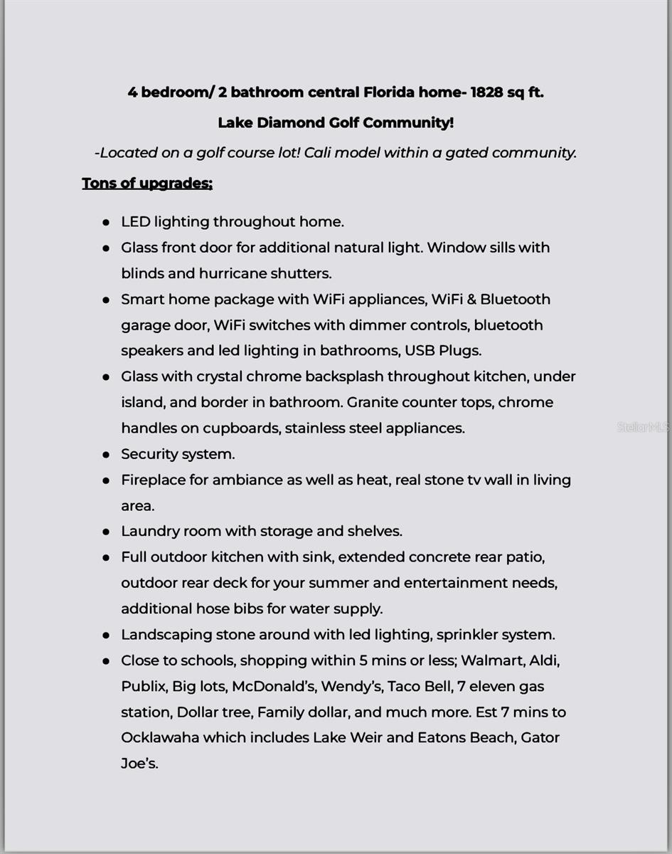 Bem-vindo a esta bela casa de 4 quartos e 2 banheiros localizada na comunidade Lake Diamond, Silver Springs Shores, a poucos minutos de escritórios, escolas, hospitais, restaurantes e shopping centers. Desfrute de cozinhar nesta cozinha enorme com backsplash de vidro e cristal cromado em toda a cozinha, sob a ilha e na borda do banheiro, bancadas de granito, elegantes puxadores de armário cromados e eletrodomésticos de aço inoxidável de última geração. Espaços elegantes: Desfrute do ambiente de uma verdadeira parede de pedra na sala, com uma lareira elétrica que oferece calor e estilo. Recursos de casa inteligente: Experimente a vida moderna com iluminação LED por toda parte, incluindo luminárias atualizadas que adicionam um toque de elegância a todos os cômodos. O pacote de casa inteligente inclui aparelhos Wi-Fi, porta de garagem habilitada para Wi-Fi e Bluetooth, interruptores e dimmers inteligentes, alto-falantes Bluetooth e plugues USB. Suíte Master luxuosa: O banheiro master de grandes dimensões é um refúgio à parte, completo com armários duplos e detalhes em vidro e cristal cromado, enquanto o generoso closet garante amplo armazenamento. Conveniência moderna: a casa está equipada com persianas, persianas e um sistema de segurança em toda a casa para maior tranquilidade. A lavanderia possui armazenamento e prateleiras convenientes. Oásis ao ar livre: A propriedade possui uma cozinha externa completa com pia, um pátio traseiro estendido perfeito para entretenimento, paisagismo maduro, irrigação e iluminação LED. Não perca a oportunidade de possuir esta casa meticulosamente atualizada, combinando elegância com tecnologia de ponta e charme ao ar livre. Agende suas exibições hoje mesmo!!