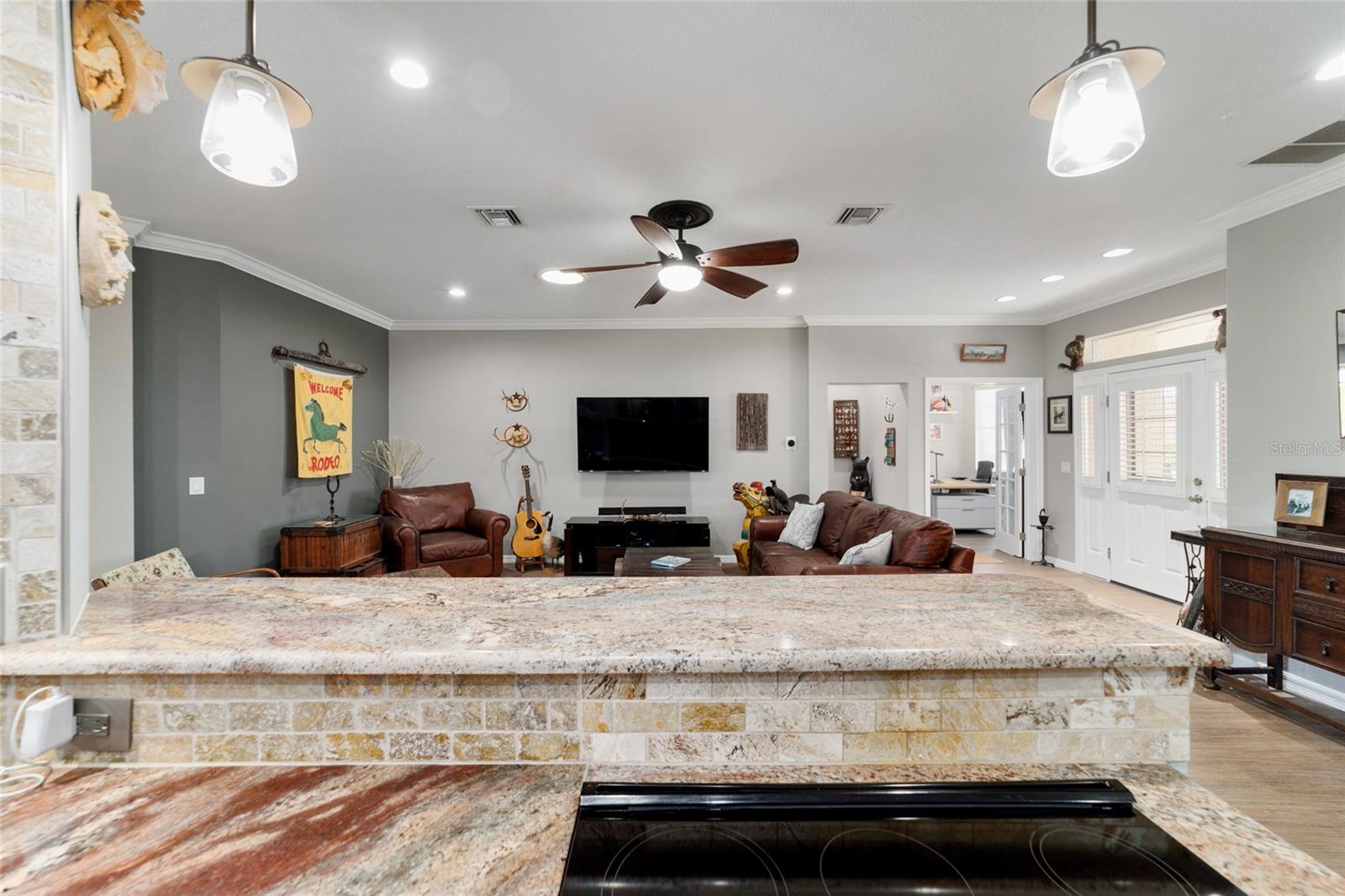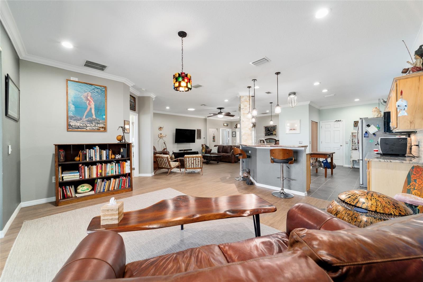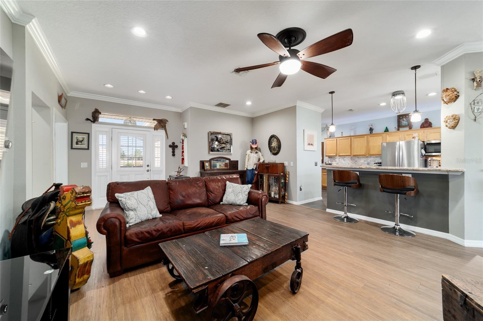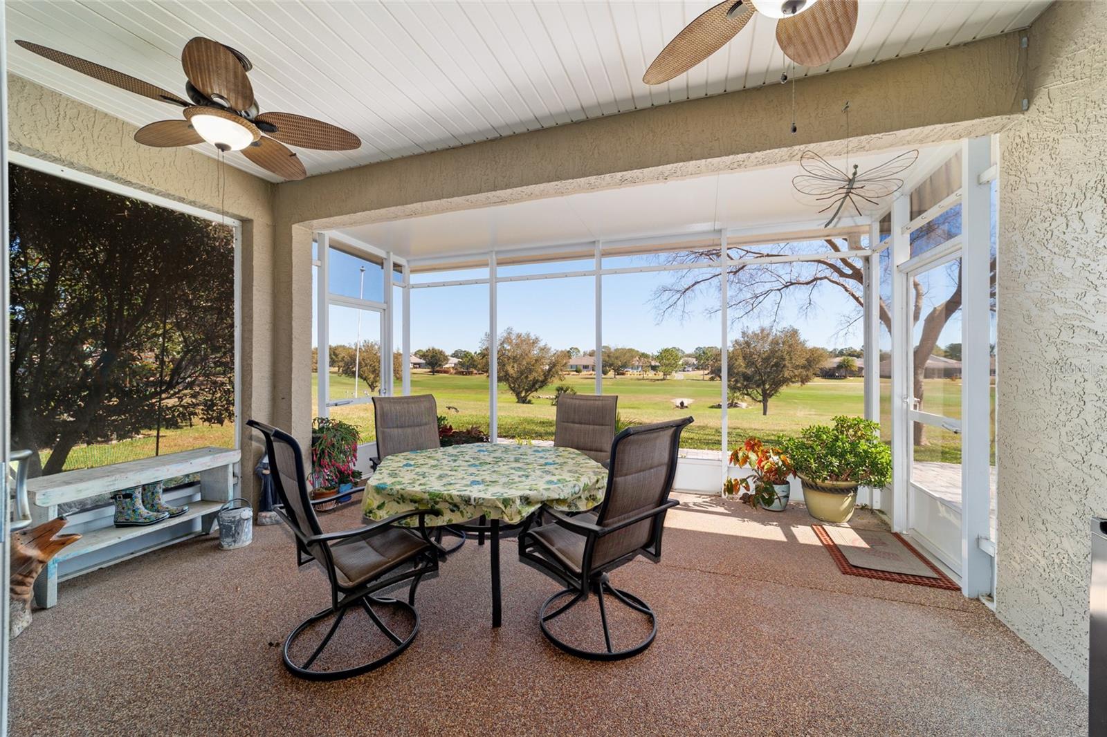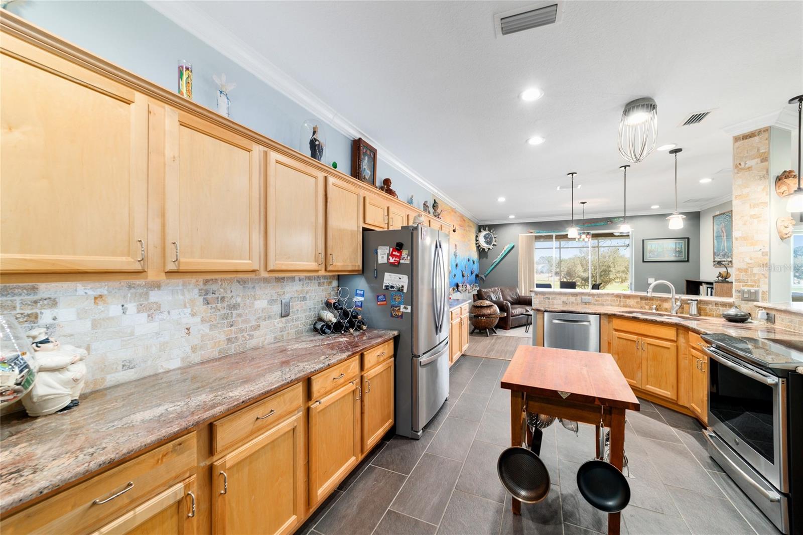 Campo de golfe: Este Kingston personalizado não deve ser desperdiçado! Este conceito aberto de 2 quartos, 2 banheiros, a casa tem uma sala flexível e foi remodelada e apresenta pisos de vinil de luxo e molduras de coroa por toda parte. A parede entre a cozinha e o espaço foi aberta para mostrar uma linda cozinha com armários atualizados, balcões de granito, utensílios de aço inoxidável mais recentes, incluindo fogão de indução, iluminação excessiva e undercabinet e um traseiro de pedra travertino. O espaçoso quarto primário possui um armário de grandes dimensões com organizador de armário de contêineres personalizado e embutido em segurança. Desfrute de vistas da tartaruga e do 9º fairway da lebre do lanai estendido ou do pátio, que tem uma fantástica exposição oriental. Muitas atualizações tornam esta casa realmente especial, incluindo o sistema de filtragem de água da House Aquasana com iluminação UV. Esta casa foi cuidadosamente mantida e se aproximam da chave (opcional) e também inclui um crédito de telhado de US $ 11.500 para tranquilidade. Esta casa está convenientemente localizada em Avalon, no topo do mundo, a principal comunidade de campo de golfe de mais de 55 anos de Ocala com acesso a carrinho de golfe a compras, entretenimento, bancos, restaurantes, saúde e beleza.