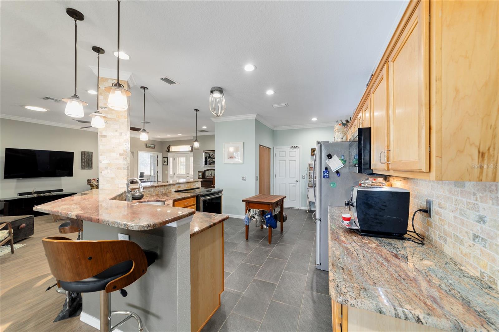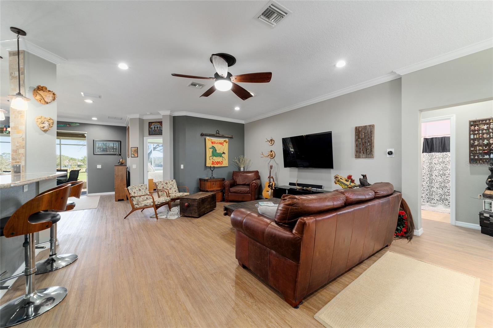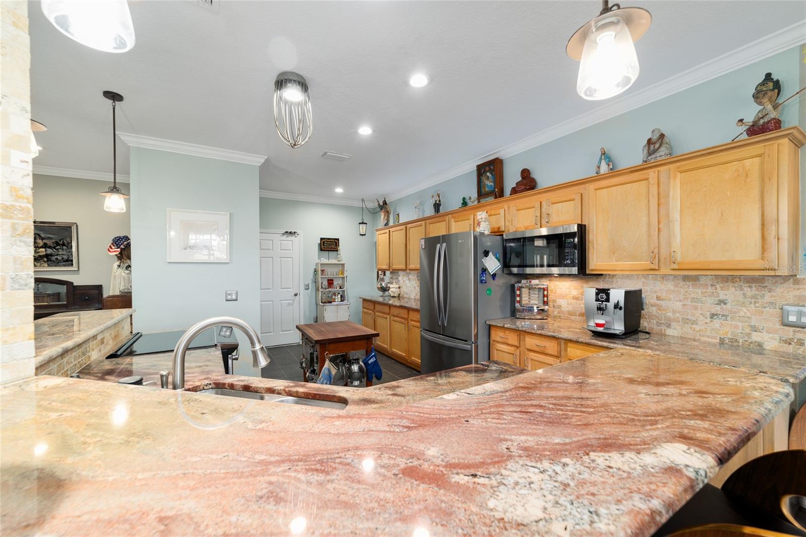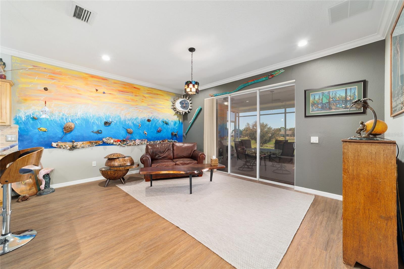 Campo de golfe: Este Kingston personalizado não deve ser desperdiçado! Este conceito aberto de 2 quartos, 2 banheiros, a casa tem uma sala flexível e foi remodelada e apresenta pisos de vinil de luxo e molduras de coroa por toda parte. A parede entre a cozinha e o espaço foi aberta para mostrar uma linda cozinha com armários atualizados, balcões de granito, utensílios de aço inoxidável mais recentes, incluindo fogão de indução, iluminação excessiva e undercabinet e um traseiro de pedra travertino. O espaçoso quarto primário possui um armário de grandes dimensões com organizador de armário de contêineres personalizado e embutido em segurança. Desfrute de vistas da tartaruga e do 9º fairway da lebre do lanai estendido ou do pátio, que tem uma fantástica exposição oriental. Muitas atualizações tornam esta casa realmente especial, incluindo o sistema de filtragem de água da House Aquasana com iluminação UV. Esta casa foi cuidadosamente mantida e se aproximam da chave (opcional) e também inclui um crédito de telhado de US $ 11.500 para tranquilidade. Esta casa está convenientemente localizada em Avalon, no topo do mundo, a principal comunidade de campo de golfe de mais de 55 anos de Ocala com acesso a carrinho de golfe a compras, entretenimento, bancos, restaurantes, saúde e beleza.