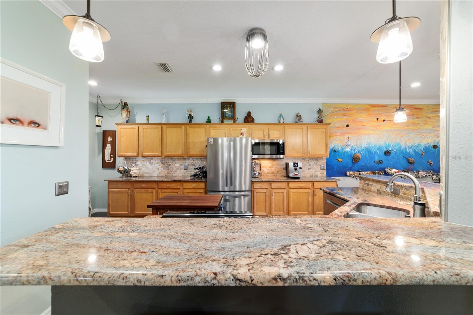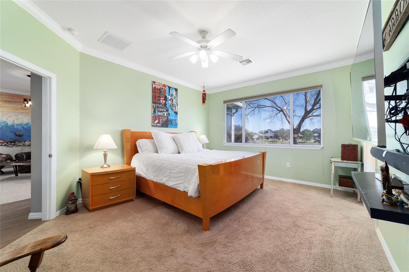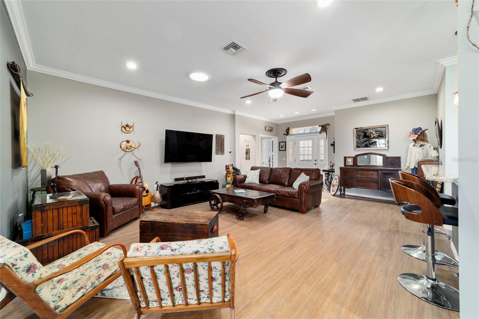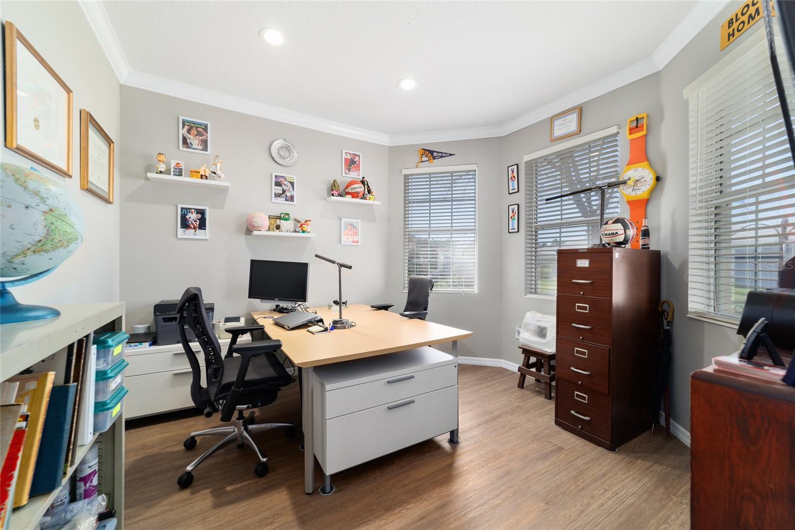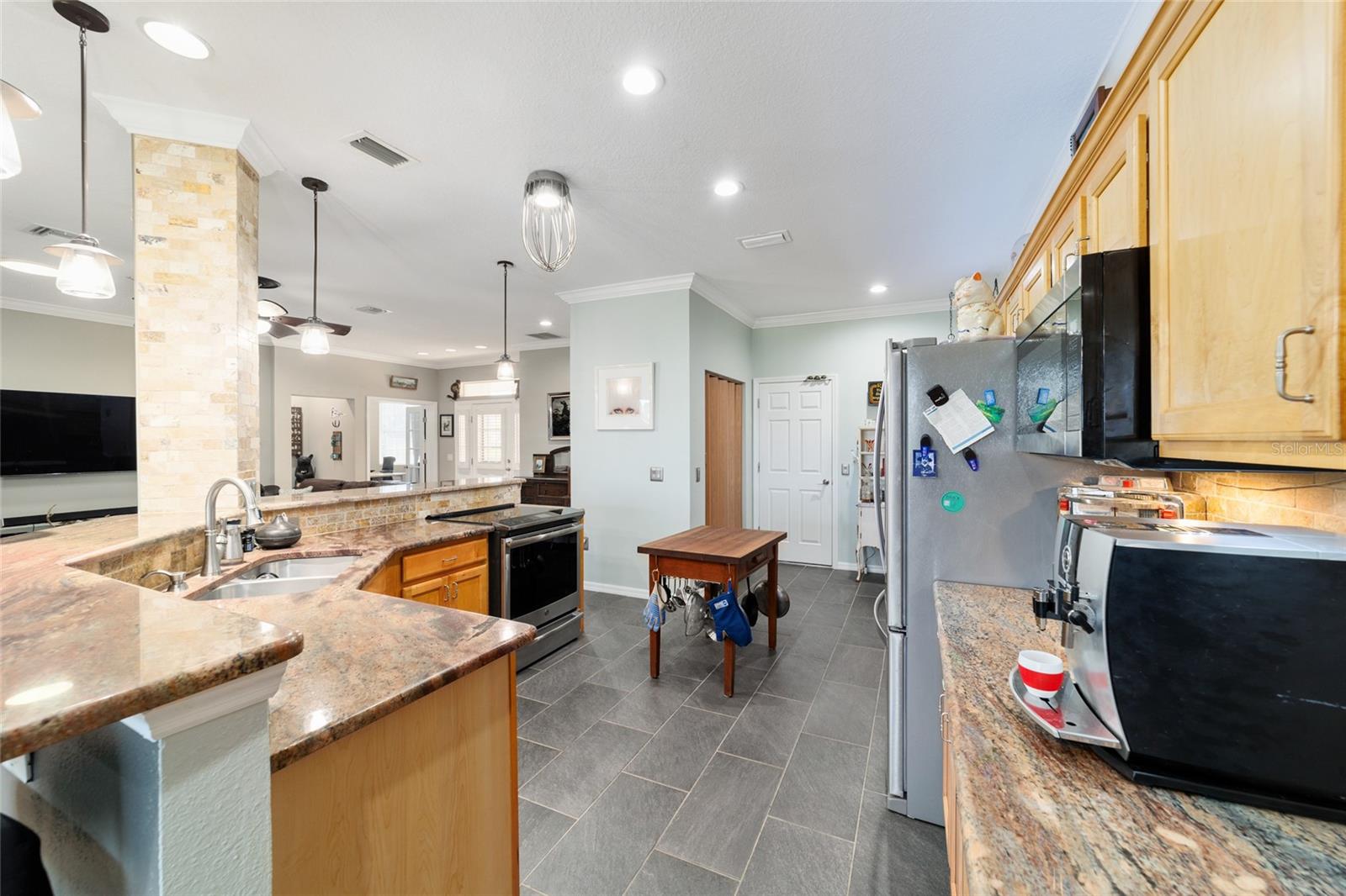 Campo de golfe: Este Kingston personalizado não deve ser desperdiçado! Este conceito aberto de 2 quartos, 2 banheiros, a casa tem uma sala flexível e foi remodelada e apresenta pisos de vinil de luxo e molduras de coroa por toda parte. A parede entre a cozinha e o espaço foi aberta para mostrar uma linda cozinha com armários atualizados, balcões de granito, utensílios de aço inoxidável mais recentes, incluindo fogão de indução, iluminação excessiva e undercabinet e um traseiro de pedra travertino. O espaçoso quarto primário possui um armário de grandes dimensões com organizador de armário de contêineres personalizado e embutido em segurança. Desfrute de vistas da tartaruga e do 9º fairway da lebre do lanai estendido ou do pátio, que tem uma fantástica exposição oriental. Muitas atualizações tornam esta casa realmente especial, incluindo o sistema de filtragem de água da House Aquasana com iluminação UV. Esta casa foi cuidadosamente mantida e se aproximam da chave (opcional) e também inclui um crédito de telhado de US $ 11.500 para tranquilidade. Esta casa está convenientemente localizada em Avalon, no topo do mundo, a principal comunidade de campo de golfe de mais de 55 anos de Ocala com acesso a carrinho de golfe a compras, entretenimento, bancos, restaurantes, saúde e beleza.