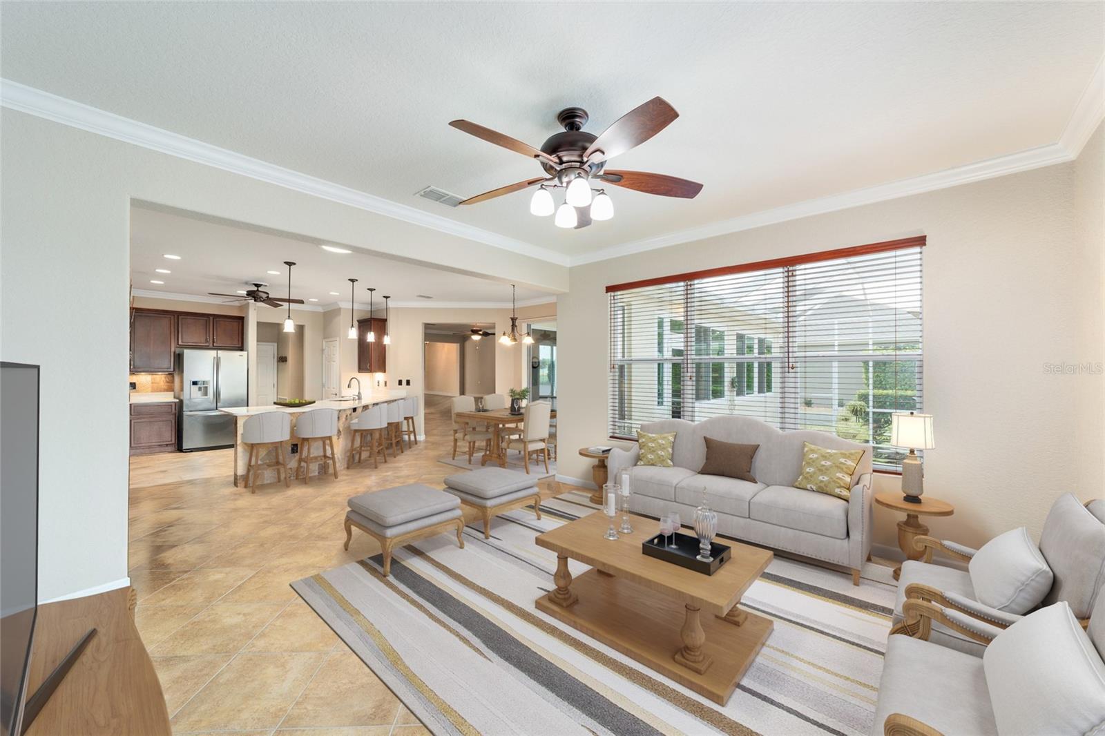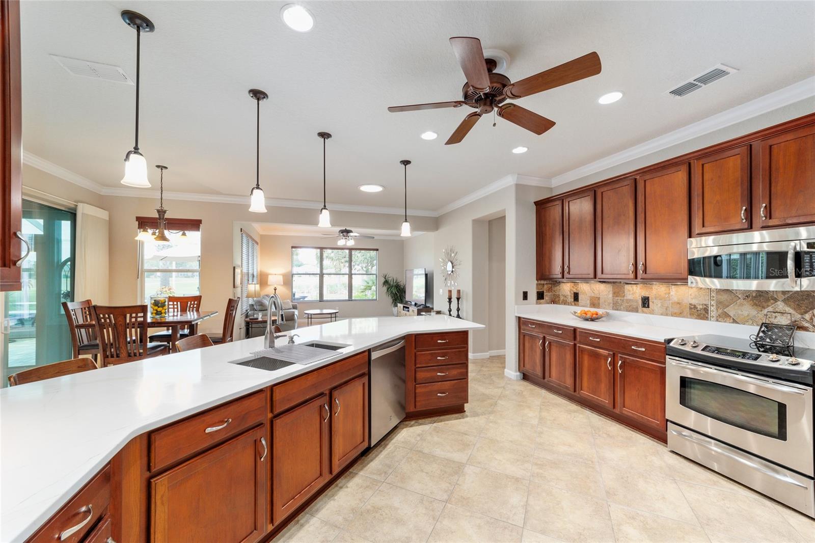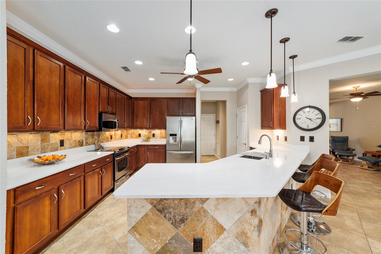 Uma ou mais fotos foram virtualmente encenadas. O modelo Kingston lindamente conservado oferece vistas deslumbrantes do campo de golfe e do lago ao longo do 5º buraco. Localizado no bairro de Arlington, em Stone Creek, em Del Webb. Na entrada frontal, a área de jantar é acentuada com lustre e persianas, enquanto sancas e piso de cerâmica percorrem os principais espaços de estar. A cozinha (atualizada em 2022) é um verdadeiro destaque com ilha península de quartzo, eletrodomésticos em aço inox, pia nova, armários escuros, backsplash de azulejos e despensa. Dois quartos adicionais oferecem piso de madeira, estantes embutidas, ventiladores de teto e persianas. O segundo banheiro inclui uma combinação de banheira/chuveiro e uma pia única. Projetada para oferecer conforto e estilo, a casa possui uma espaçosa suíte master com closet e armários embutidos, portas francesas que levam a um luxuoso banheiro com piso de cerâmica, pias duplas, armários Corian e box amplo aprimorado com quartzo. As características internas adicionais incluem uma lavanderia com pia e armários, bem como armários para roupas de cama e casacos para armazenamento extra. A sala de estar aberta inclui ventilador de teto e portas de vidro deslizantes para a varanda fechada, criando um fluxo contínuo entre a vida interna e externa. A vida ao ar livre é um destaque com uma ampla varanda fechada com pavimentação, 3 portas deslizantes, 3 janelas deslizantes, 2 ventiladores de teto e várias luzes e tomadas. Um pátio em gaiola com pavimentação amplia o espaço, perfeito para desfrutar das vistas serenas. A casa também oferece uma entrada frontal com tela e paisagismo detalhado com detalhes em rock. As atualizações recentes incluem um novo telhado (2023), um novo aquecedor de água e um filtro de linha para toda a casa. A garagem para 2,5 carros inclui uma tela e uma chave de transferência do gerador. Melhorias adicionais incluem telas de trampolim na parte traseira da casa, alarmes de fumaça de 10 anos e pavimentação recém-vedada em 2024 na entrada frontal e na varanda. Esta casa é a combinação perfeita de elegância, praticidade e vida tranquila no campo de golfe. Experimente uma atmosfera de clube de campo adaptada para todos os níveis de atividade, com uma área de ferradura, jogos cornhole, quadras de pickleball, tênis e basquete, piscinas internas e externas, luxuosas instalações de spa, uma sala de ginástica totalmente equipada, quilômetros de trilhas multiuso e um conveniente restaurante e churrascaria no local. Não perca a oportunidade de fazer desta linda casa o seu novo lar!