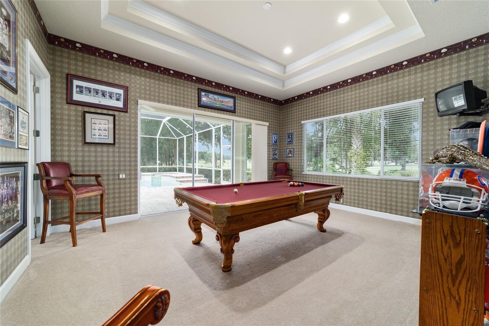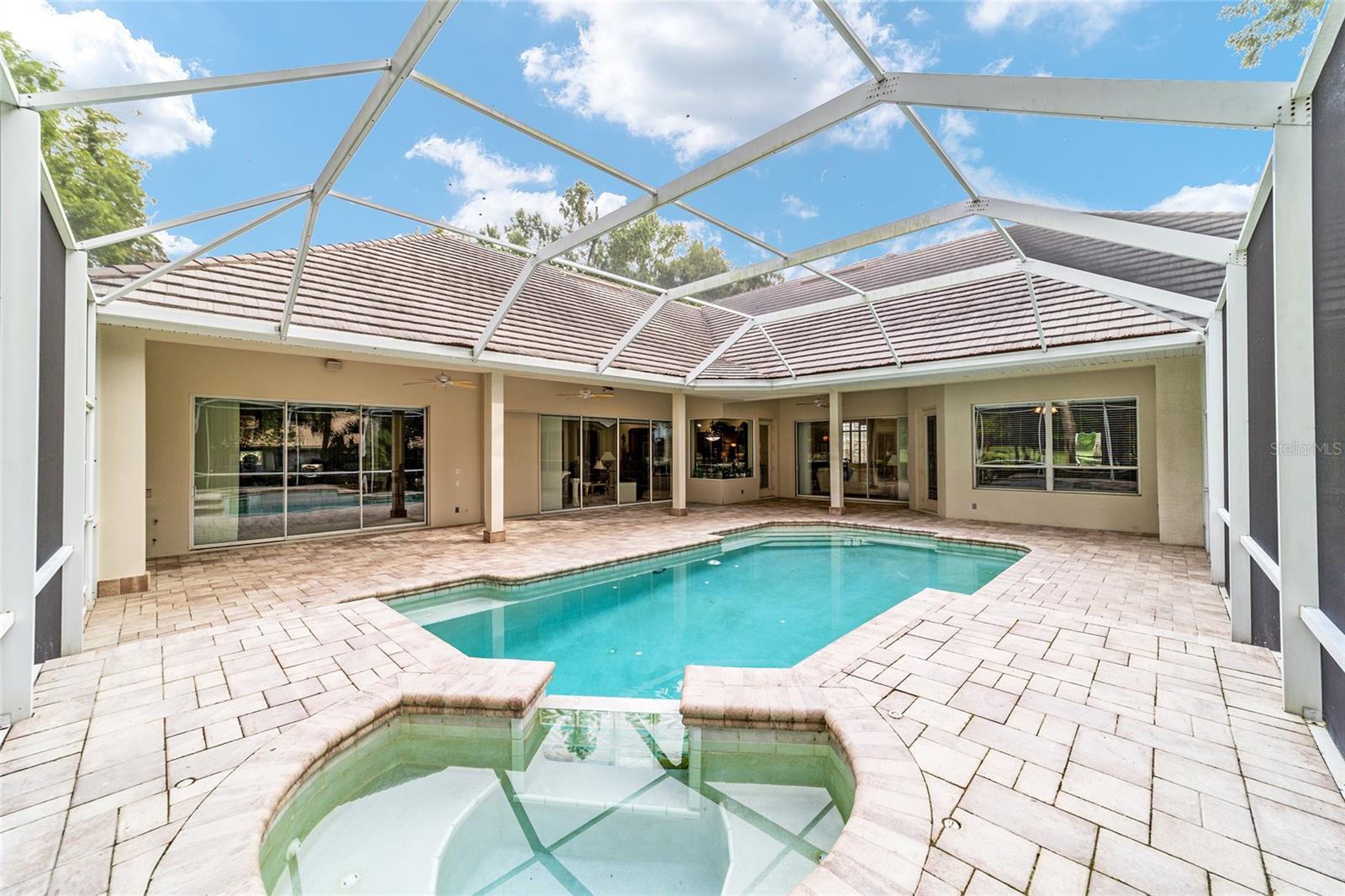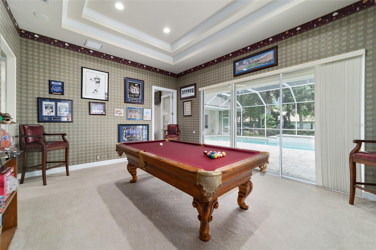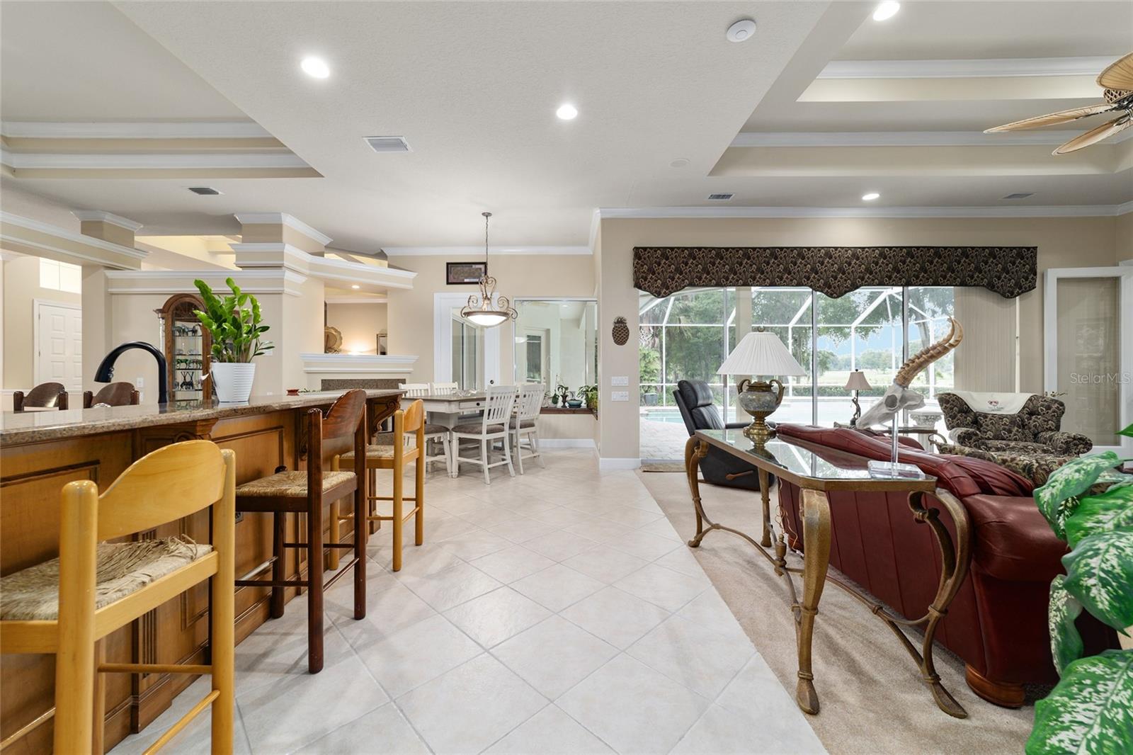 Bem-vindo a esta impressionante casa de 4 quartos/3 banheiros Rutenberg, com 4.614 pés quadrados de metragem quadrada e situada em um condomínio fechado com belas vistas do 18º buraco. Entre para encontrar uma planta tríplice bem planejada que inclui salas de vida e jantar formais, um escritório particular e uma espaçosa sala de bônus/jogo com controles deslizantes que se abrem para a piscina. Desfrute de noites de cinema em sua própria sala de teatro - perfeita para entreter hóspedes ou relaxar com a família. O coração da casa é a cozinha expansiva, com armários abundantes e uma grande ilha central completa com bancadas em granito. Uma sala de café da manhã aconchegante compartilha lareira de dupla face com sala de estar formal e tem uma janela de vidro com mitered com vista para a piscina e a Lanai. A sala da família, com embutidos também se abre para a área da piscina com portas de vidro deslizantes, criando um fluxo sem interior de interior. A espaçosa suíte primária tem grandes armários e um banho de spa. O quarto 2 tem seu próprio banheiro privativo, enquanto os quartos 3 e 4 compartilham um conveniente layout Jack and Jill. Saia para o seu oásis de quintal particular! O lanai coberto de tela oferece um retiro sombreado, enquanto a piscina de água salgada é cercada por um belo deck pavimentado-perfeito por absorver o sol ou divertir amigos e familiares. Os recursos adicionais incluem uma lavanderia espaçosa, uma garagem de 3 carros anexada e uma garagem isolada para armazenamento extra ou hobbies. Com seu layout espaçoso e vistas imbatíveis do campo de golfe, você não vai querer perder este !!