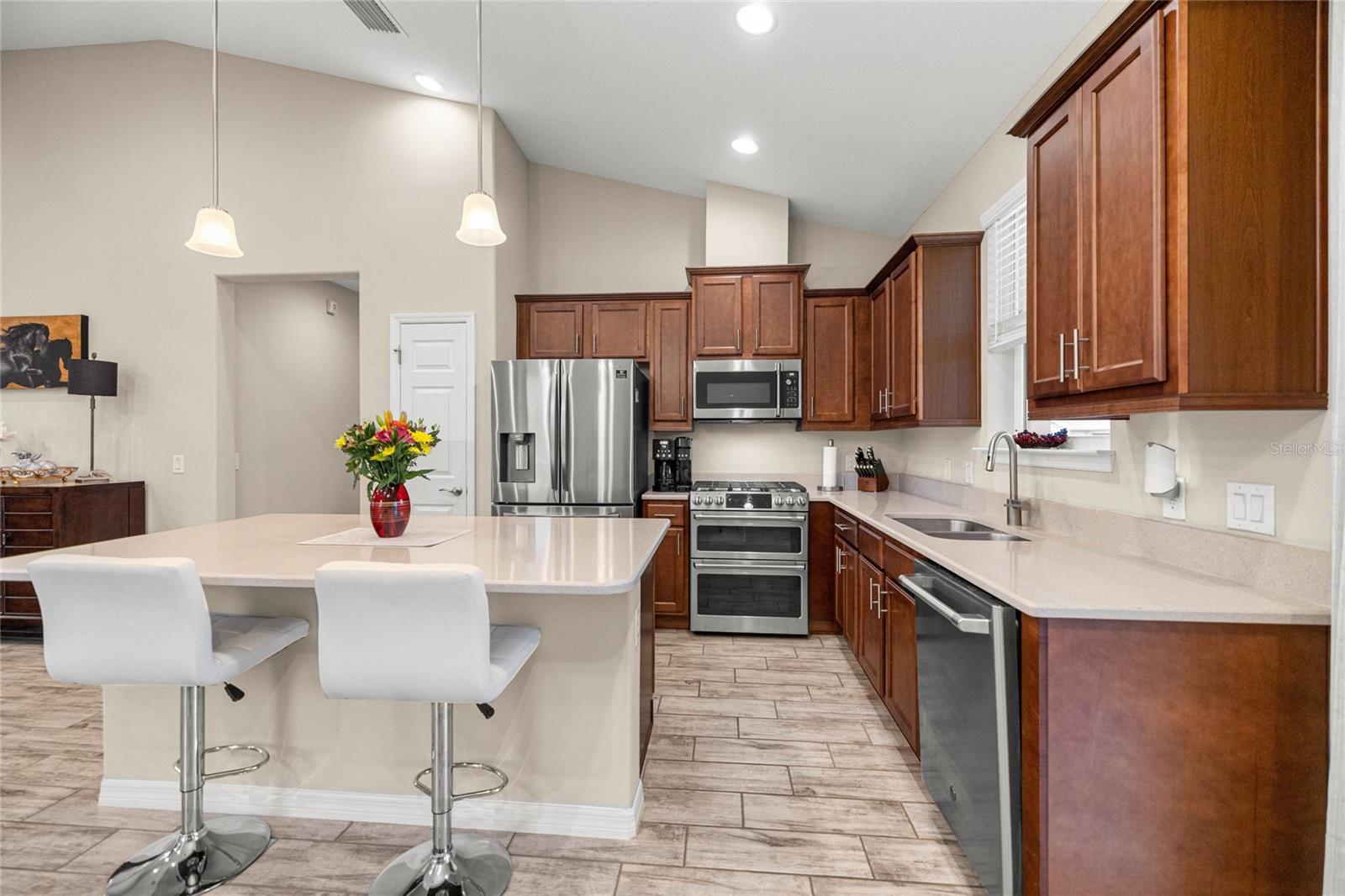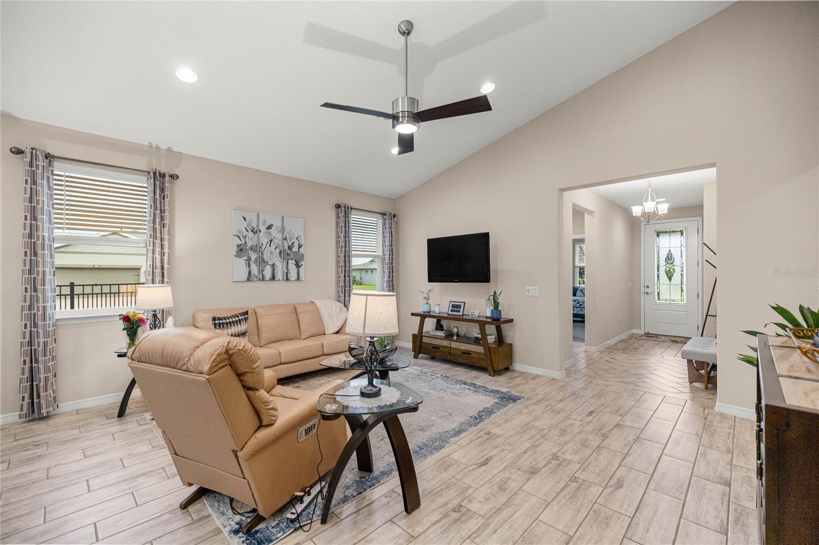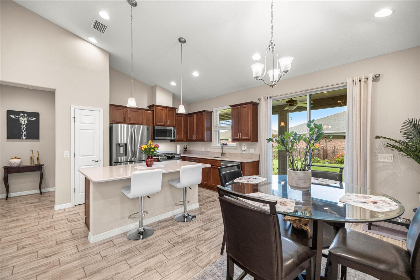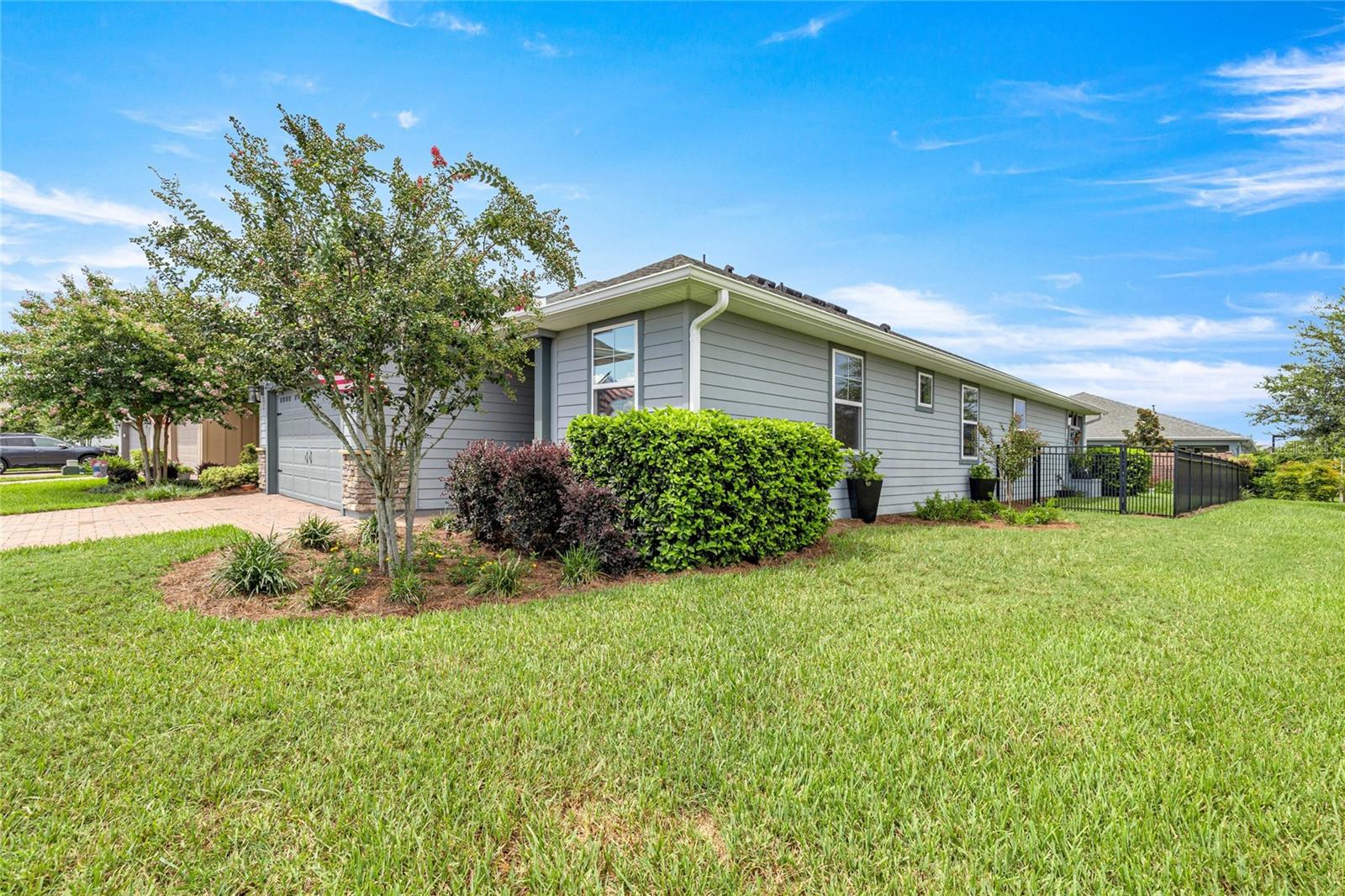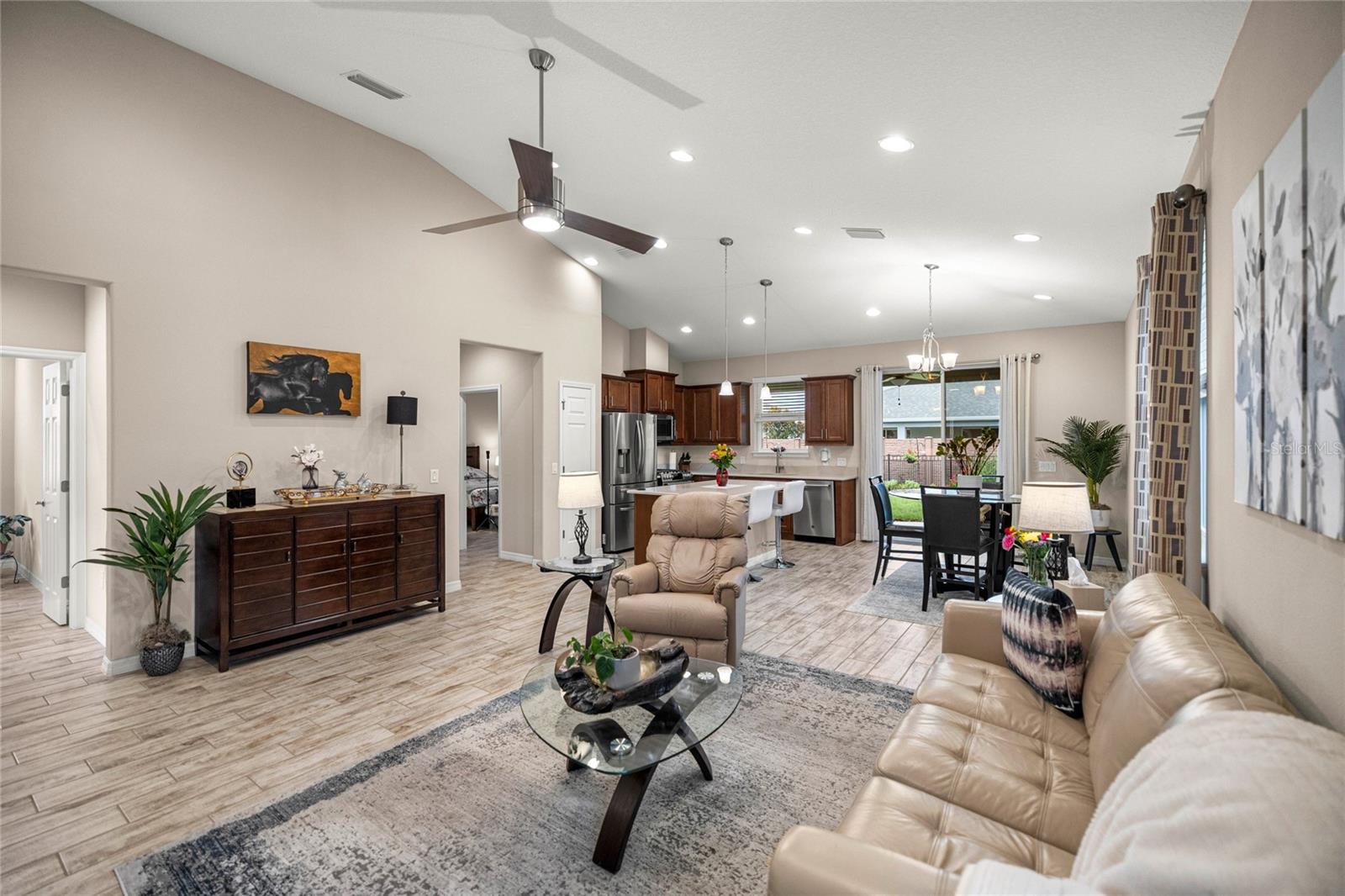 Home de Mint Condition impressionante com 2 quartos, 2 banheiros, além de uma sala flexível, situada em um grande lote de canto dentro do bem procurado fechado, comunidade de golfe no estilo resort da Ocala Reserve. Sem CDD! Construído por Shea Homes, esse modelo de Roma combina o design contemporâneo com recursos eficientes em termos de energia e acesso a comodidades de classe mundial, oferecendo um estilo de vida excepcional, por dentro e por fora. O piso plano aberto mostra tetos abobadados, abundantes pisos de ladrilhos de cerâmica de luz natural e com aparência de madeira no estilo de prancha nas principais áreas de estar. A cozinha do chef é funcional e elegante, com utensílios de aço inoxidável de primeira linha, incluindo uma faixa de gás com ventilação externa e um forno duplo e balcões de quartzo de Silestone premium. Ele também possui armários de madeira reais escalonados com moldagem por coroa e iluminação sub-cabinete, juntamente com uma generosa ilha de cozinha e despensa para amplo armazenamento. A expansiva sala grande e espaço de jantar aberta diretamente para uma varanda prolongada de grandes dimensões, com pisos revestidos com epóxi, estendendo o comprimento da casa, com uma conexão de linha de gás para uma churrasqueira a gás, paisagismo de privacidade e um quintal cercado perfeito para animais de estimação. A suíte primária do quarto possui um armário, armário de linho, vaidades duplas com balcões de quartzo, um chuveiro entre vidro e um armário de água privado. Com um layout de quarto dividido, a privacidade do hóspede é maximizada. A sala flexível, completa com portas duplas, é perfeita como escritório em casa ou área de hóspedes adicional. Mais destaques incluem uma lavanderia com armários e pia de utilidade, lavadora e secadora sofisticada, ventiladores de teto premium e luminárias de iluminação por toda parte, e persianas em todas as janelas. A espaçosa garagem com ar-condicionado com um piso epóxi, uma área de oficina, uma saída de 240V para carrinho de golfe elétrica de alta velocidade ou carregamento de nível 2 eV (veículo elétrico ou carro híbrido), e as extensas possibilidades de armazenamento são uma verdadeira mudança de jogo! O OCALA Preserve HOA lida com a manutenção e irrigação de gramado e paisagem, fornece Internet de fibra óptica de alta velocidade e segurança fechada 24/7. Os moradores desfrutam de comodidades no estilo resort, como um campo de golfe projetado por Tom-Lehman, piscinas de resort e colo, um spa e academia de fitness, tênis, pickleball e quadras de bocha, trilhas cênicas de caminhada e ciclismo, parques de cães e uma doca de canoa/caiaque. O impressionante Clubhouse apresenta o restaurante de tijolos salgados, a pitoresca Veranda e o calçadão (em um lindo lago de sete acres) e há acesso ao carrinho de golfe em toda a comunidade! Localizado a poucos minutos do centro equestre mundial (WEC), esta casa está pronta para a mudança e com certeza impressionar!