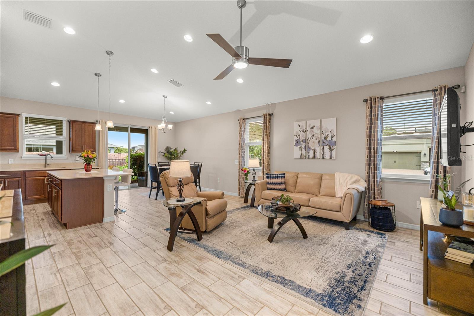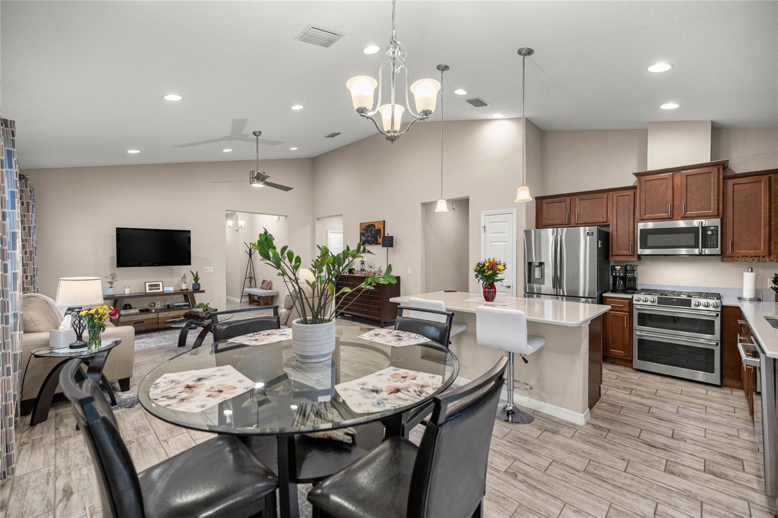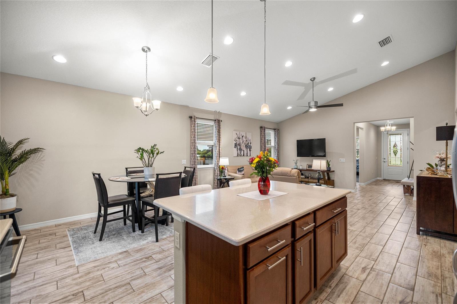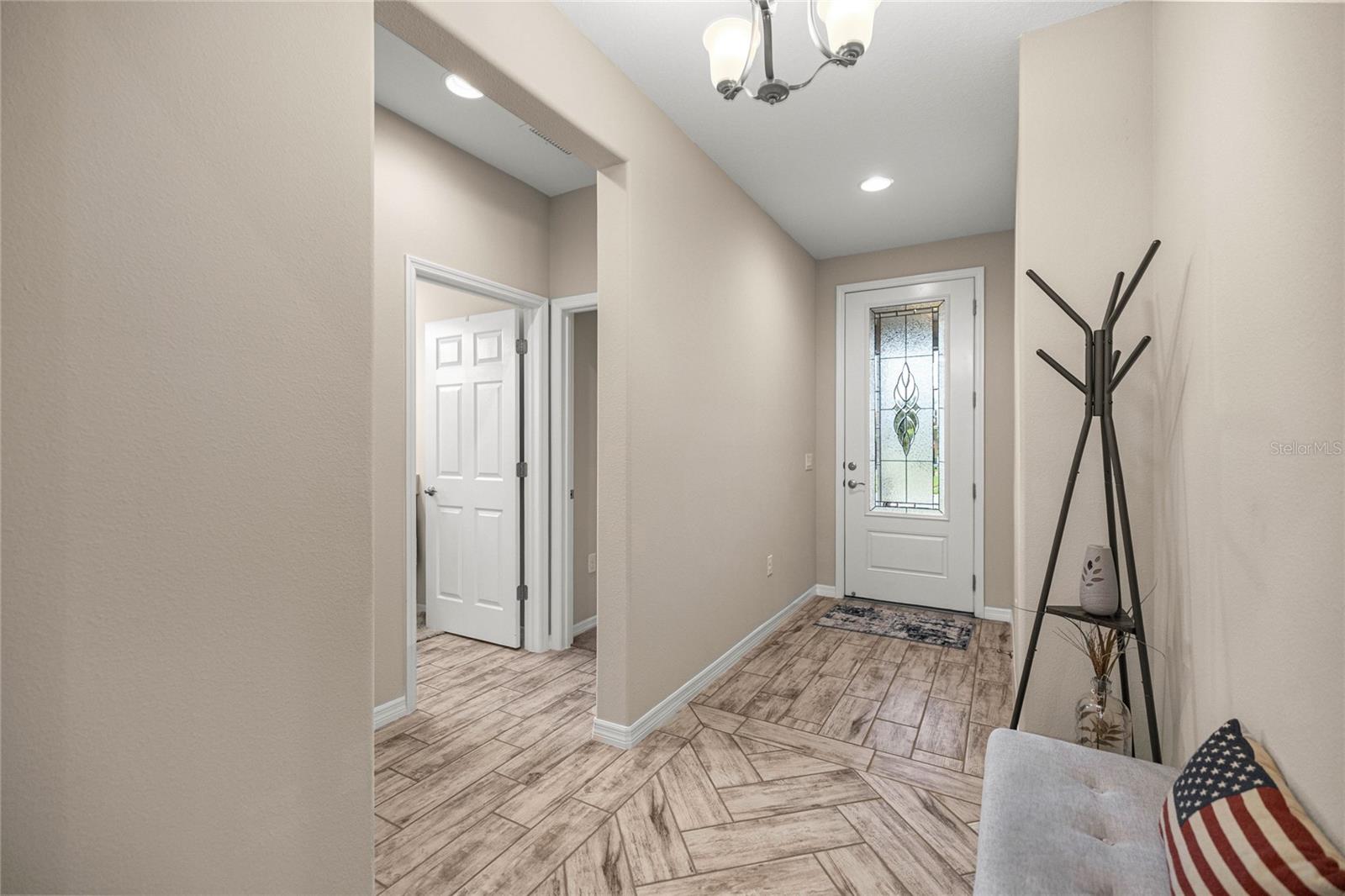 Home de Mint Condition impressionante com 2 quartos, 2 banheiros, além de uma sala flexível, situada em um grande lote de canto dentro do bem procurado fechado, comunidade de golfe no estilo resort da Ocala Reserve. Sem CDD! Construído por Shea Homes, esse modelo de Roma combina o design contemporâneo com recursos eficientes em termos de energia e acesso a comodidades de classe mundial, oferecendo um estilo de vida excepcional, por dentro e por fora. O piso plano aberto mostra tetos abobadados, abundantes pisos de ladrilhos de cerâmica de luz natural e com aparência de madeira no estilo de prancha nas principais áreas de estar. A cozinha do chef é funcional e elegante, com utensílios de aço inoxidável de primeira linha, incluindo uma faixa de gás com ventilação externa e um forno duplo e balcões de quartzo de Silestone premium. Ele também possui armários de madeira reais escalonados com moldagem por coroa e iluminação sub-cabinete, juntamente com uma generosa ilha de cozinha e despensa para amplo armazenamento. A expansiva sala grande e espaço de jantar aberta diretamente para uma varanda prolongada de grandes dimensões, com pisos revestidos com epóxi, estendendo o comprimento da casa, com uma conexão de linha de gás para uma churrasqueira a gás, paisagismo de privacidade e um quintal cercado perfeito para animais de estimação. A suíte primária do quarto possui um armário, armário de linho, vaidades duplas com balcões de quartzo, um chuveiro entre vidro e um armário de água privado. Com um layout de quarto dividido, a privacidade do hóspede é maximizada. A sala flexível, completa com portas duplas, é perfeita como escritório em casa ou área de hóspedes adicional. Mais destaques incluem uma lavanderia com armários e pia de utilidade, lavadora e secadora sofisticada, ventiladores de teto premium e luminárias de iluminação por toda parte, e persianas em todas as janelas. A espaçosa garagem com ar-condicionado com um piso epóxi, uma área de oficina, uma saída de 240V para carrinho de golfe elétrica de alta velocidade ou carregamento de nível 2 eV (veículo elétrico ou carro híbrido), e as extensas possibilidades de armazenamento são uma verdadeira mudança de jogo! O OCALA Preserve HOA lida com a manutenção e irrigação de gramado e paisagem, fornece Internet de fibra óptica de alta velocidade e segurança fechada 24/7. Os moradores desfrutam de comodidades no estilo resort, como um campo de golfe projetado por Tom-Lehman, piscinas de resort e colo, um spa e academia de fitness, tênis, pickleball e quadras de bocha, trilhas cênicas de caminhada e ciclismo, parques de cães e uma doca de canoa/caiaque. O impressionante Clubhouse apresenta o restaurante de tijolos salgados, a pitoresca Veranda e o calçadão (em um lindo lago de sete acres) e há acesso ao carrinho de golfe em toda a comunidade! Localizado a poucos minutos do centro equestre mundial (WEC), esta casa está pronta para a mudança e com certeza impressionar!