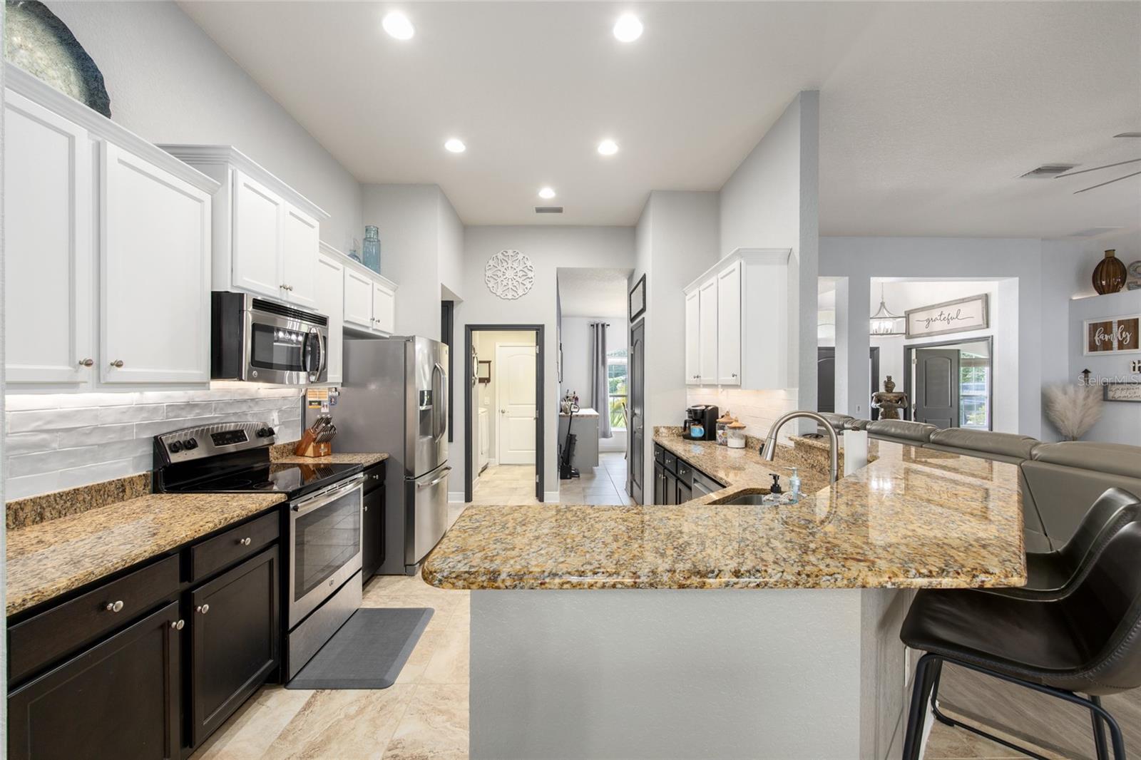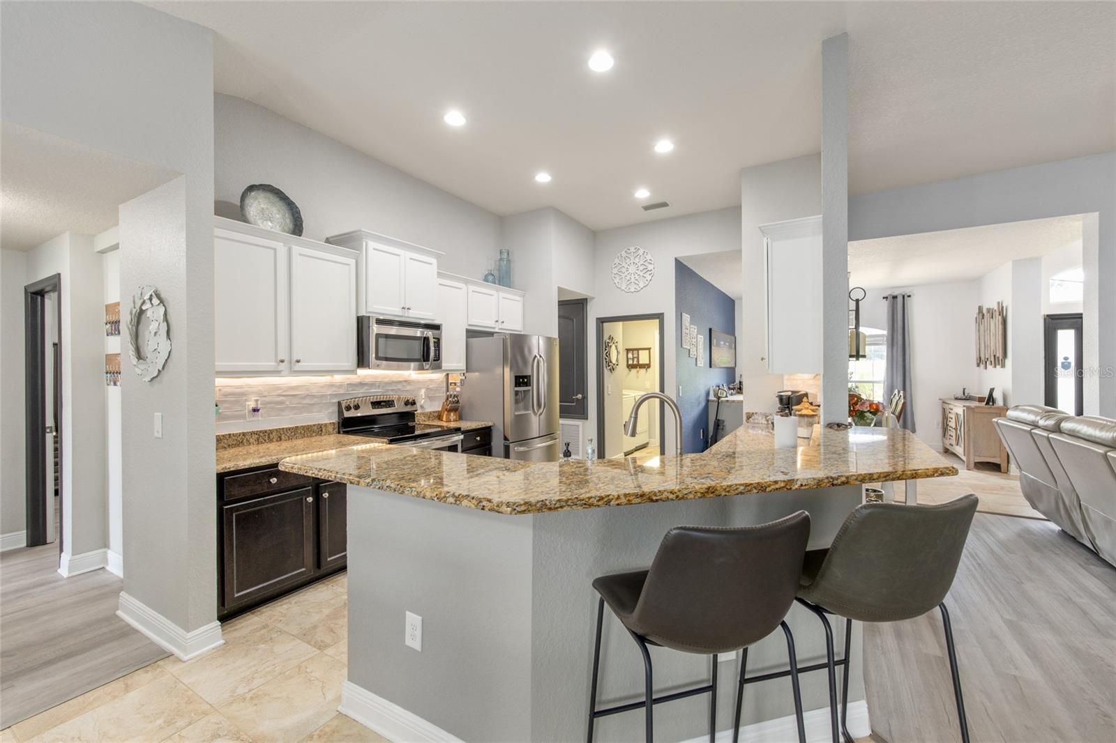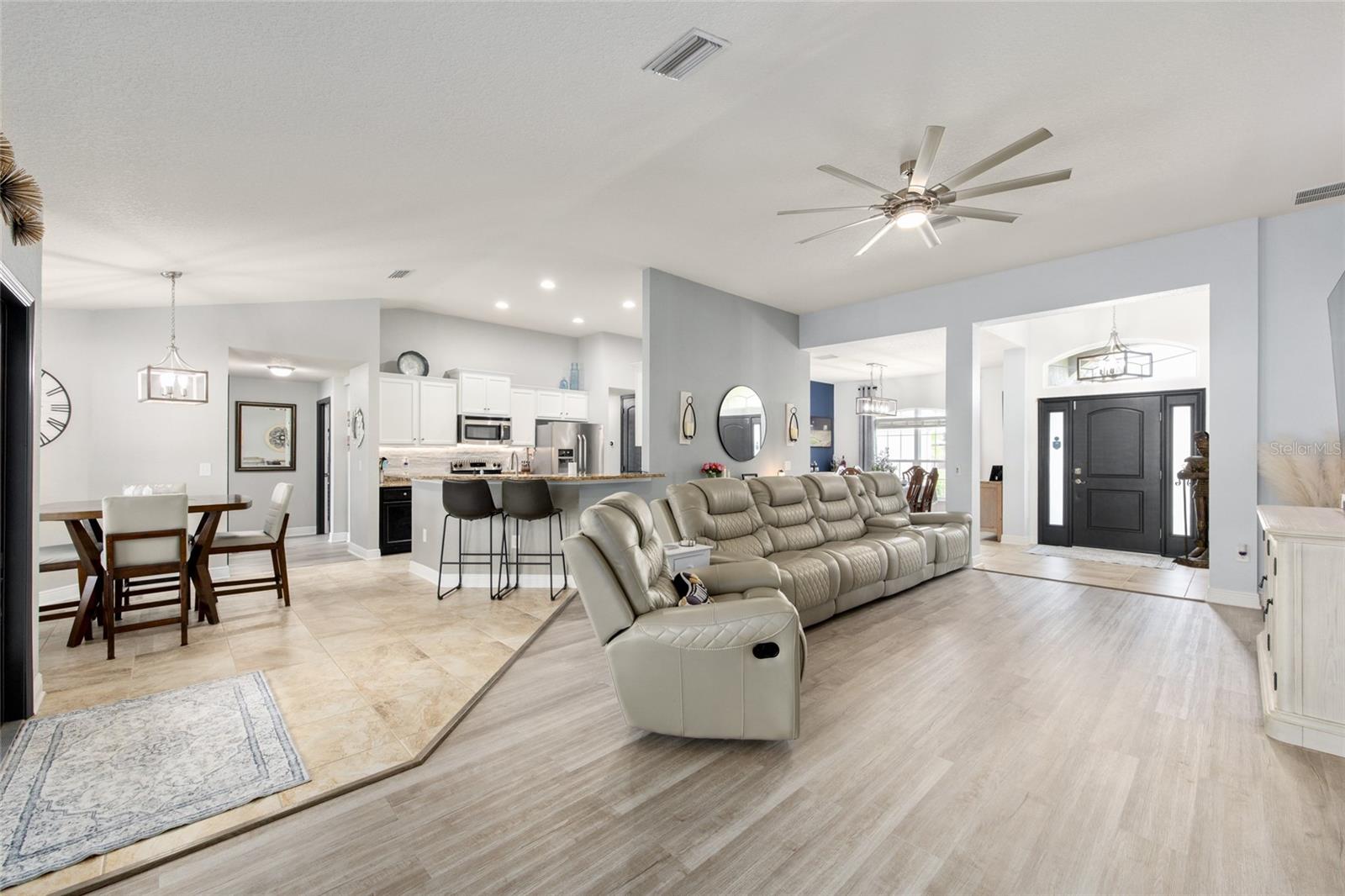 Localizada na desejável Preserve em Heath Brook, esta bela casa de 4 quartos e 2 banheiros, garagem lateral para 2 carros e versátil quarto flexível oferece um layout convidativo e funcional que você vai adorar voltar para casa. A casa possui uma espaçosa área de estar, jantar e cozinha com balcões de granito, backsplash de azulejos, armários de madeira com lixeira removível, eletrodomésticos de aço inoxidável e torneira ativada por toque. Desfrute de refeições na copa ou receba na sala de jantar formal. LVP durável e piso de cerâmica fluem por toda a casa para estilo e fácil manutenção. O layout de quarto dividido inclui uma suíte principal generosa com teto falso acentuado por sancas, closets duplos e banheiro privativo com banheira de jardim e chuveiro separado. A sala flexível oferece o espaço ideal para um escritório ou sala de jogos. Ao ar livre, relaxe em seu oásis privado com varanda coberta, pátio amplo, grande gaiola para pássaros e quintal cercado. Convenientemente localizada perto de lojas, entretenimento e cuidados de saúde, esta casa oferece conforto, estilo e conveniência em todos os detalhes.