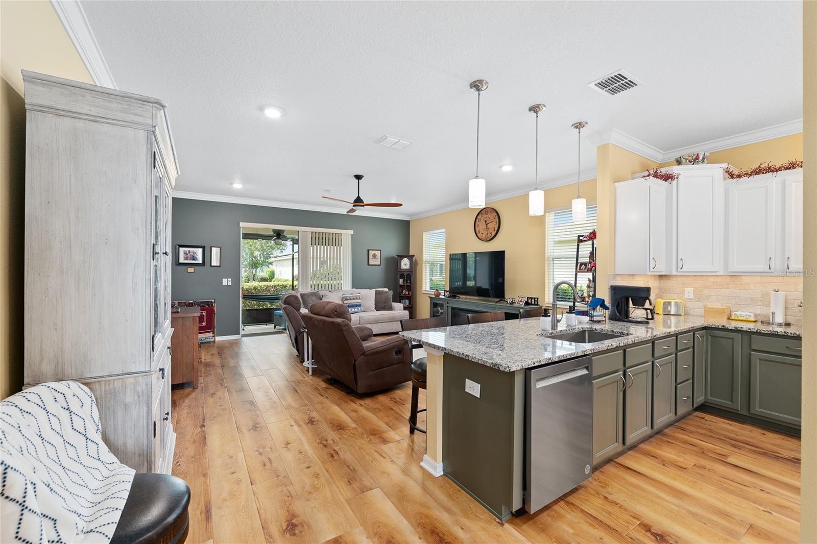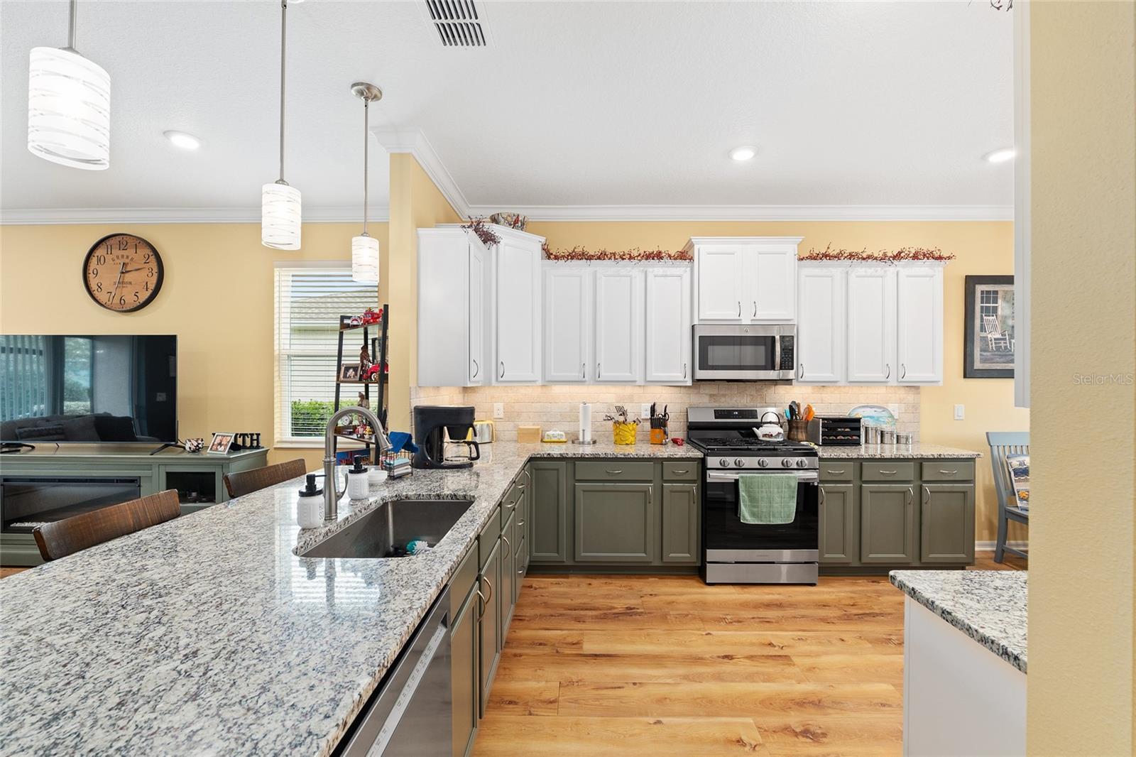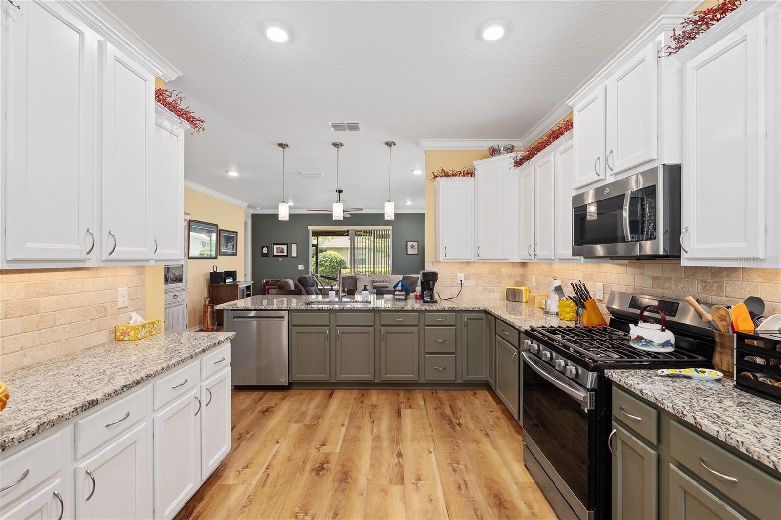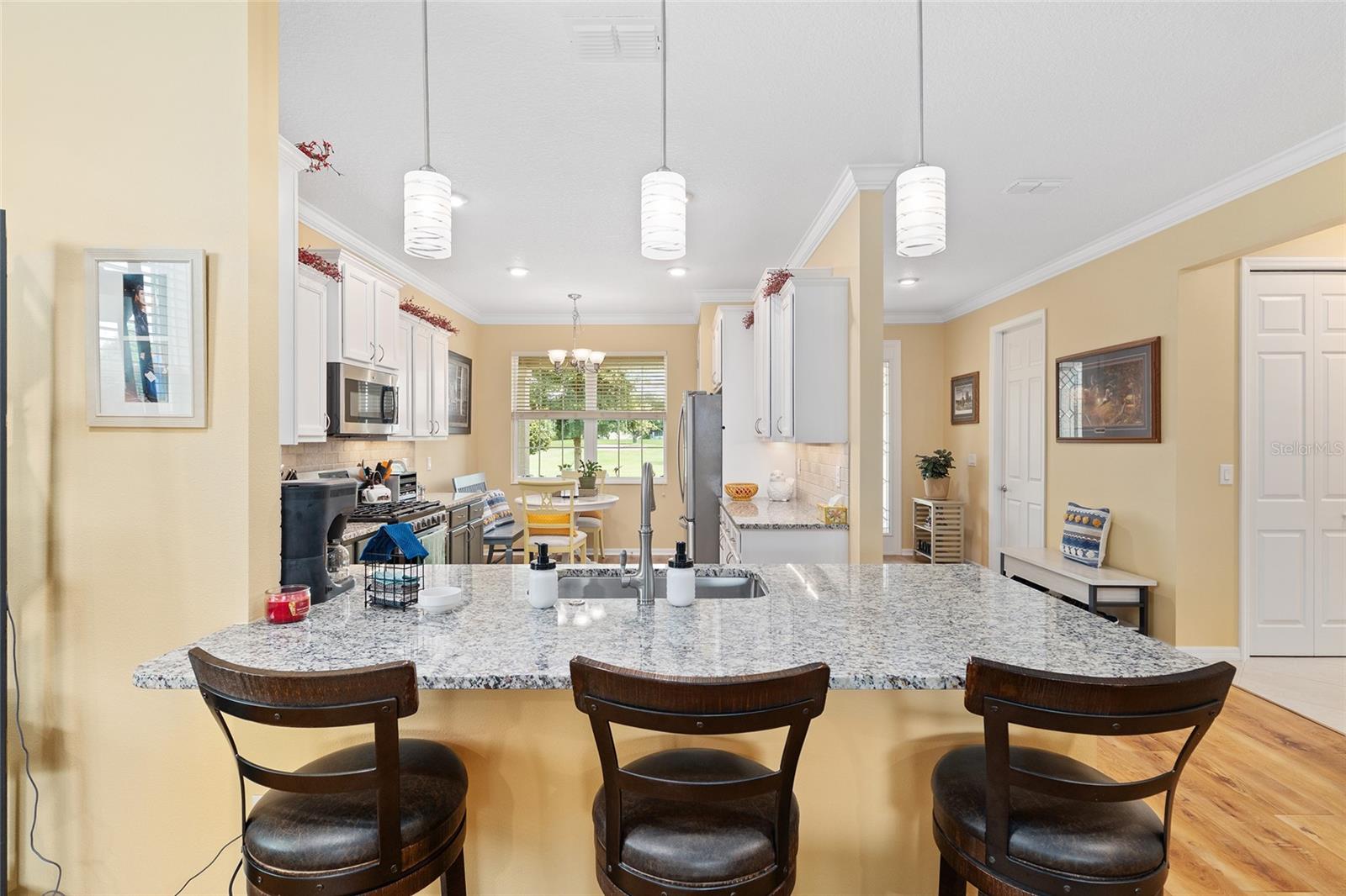 Bem -vindo a este modelo Kent lindamente mantido na comunidade Avalon 4. Esta casa de 2 quartos e 2 banheiros com uma garagem de 2 carros apresenta atualizações elegantes, acabamentos modernos e uma vista pacífica de campo de golfe sem vizinhos da frente. O layout aberto mostra o piso de tábua de vinil de luxo, moldagem por coroa, ventiladores de teto e muita luz natural. A cozinha oferece armários escalonados com tons duplos com moldagem por coroa, um backsplash de ladrilhos, bancadas de granito com iluminação pendente e utensílios inoxidáveis de hidromassagem, incluindo uma faixa de gás e microondas. Uma despensa e uma área de jantar com persianas adicionais aumentam a funcionalidade. A sala de estar abre com controles deslizantes, também equipados com persianas, a um lanai exibido com um ventilador de teto e tons de puxar, todos com vista para as sebes de privacidade paisagísticas. A suíte primária inclui um ventilador de teto, 2 janelas com persianas, um closet e um banho de suíte com um chuveiro de azulejos com bancada, pia dupla de quartzo, piso de ladrilho e um armário de linho. O quarto de hóspedes oferece uma cama Murphy com mesa embutida, armário e persianas, enquanto o segundo banho fornece uma combinação de banheira e chuveiro, pia de quartzo, armários de madeira e piso de ladrilhos. Um armário do corredor oferece armazenamento extra e o armário de lavanderia está equipado com uma lavadora e secadora de Maytag. A garagem de dois carros possui um piso revestido de epóxi, e a casa é completa com sarjetas, paisagismo curto e um ambiente privado com vistas de campo de golfe na frente e hedges de privacidade na traseira. Localizado na comunidade de 55 mais de 55 anos de Ocala, fechada e ativa, carregada de comodidades, incluindo acesso ao carrinho de golfe a 2 shopping centers.