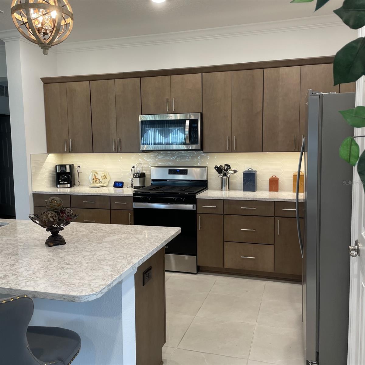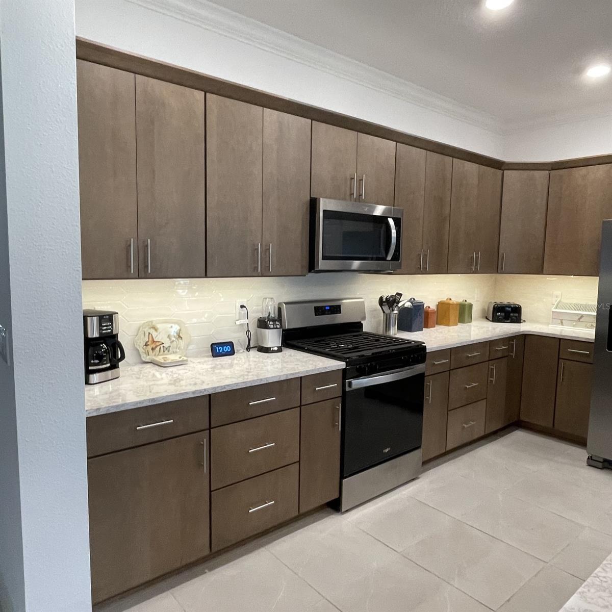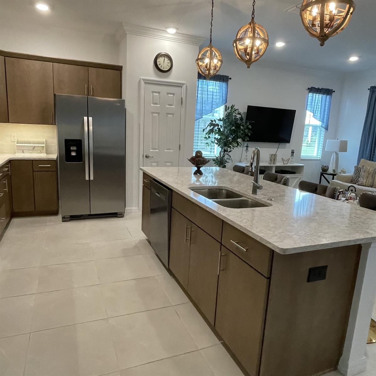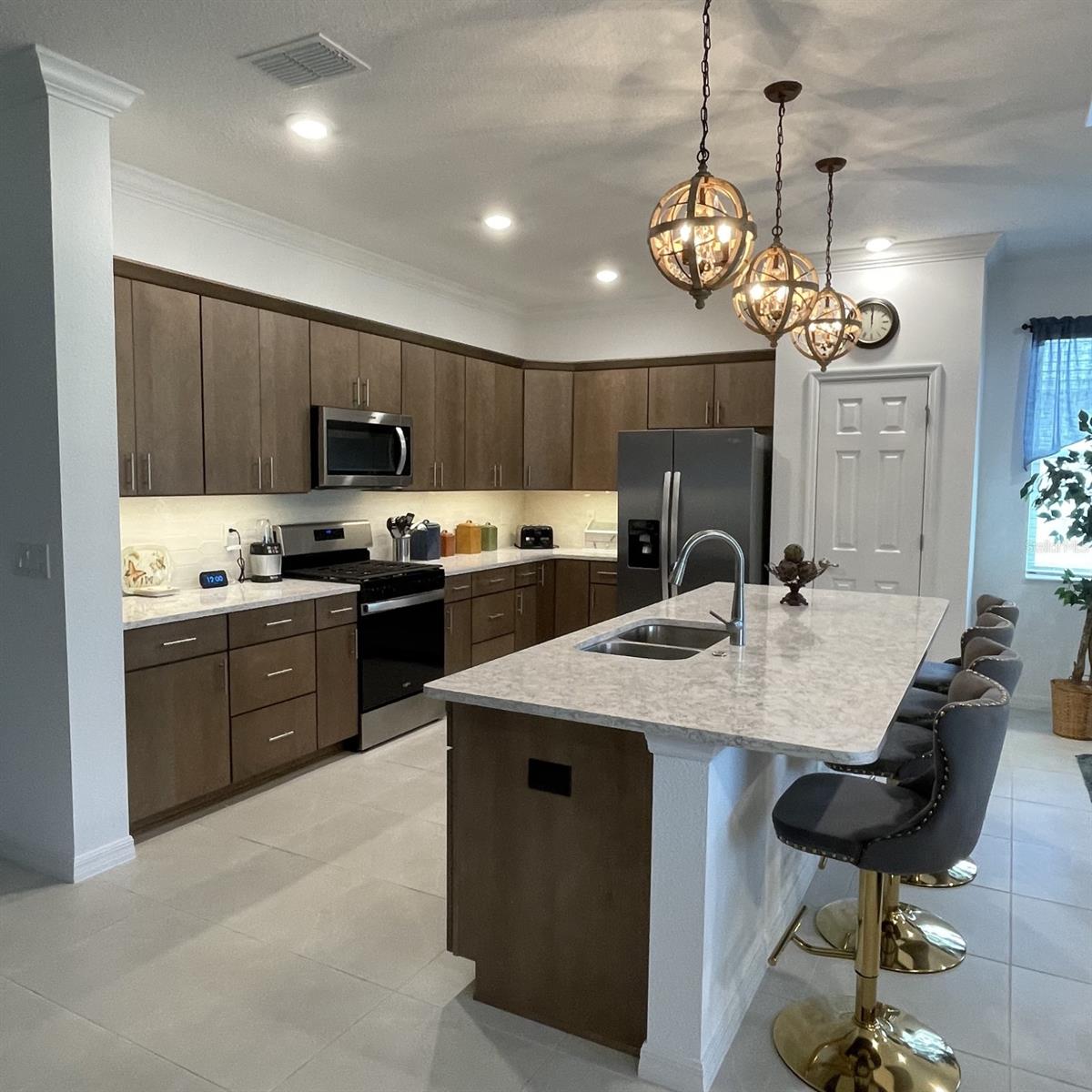 2023 Casa modelo de girassol "inteligente" em Weybourne Landing - No topo do mundo. Três quartos, 2 banheiros, garagem para 2 carros. Bancadas de quartzo, eletrodomésticos de aço inoxidável, iluminação sob o armário, armário de canto Susan preguiçoso, backsplash atualizado. Sancas interiores na cozinha/sala/hall de entrada. Azulejo cinza claro em todas as áreas de estar e carpete em todos os quartos. Closet do banheiro master com acesso à lavanderia através do closet. Banheiro privativo com pia dupla e chuveiro atualizado. Persianas por toda parte. As comodidades incluem piscina, clube, pickleball, minigolfe e buraco de milho. Com um Gateway Pass, os residentes de Weybourne podem desfrutar de todas as comodidades do On Top of the World.