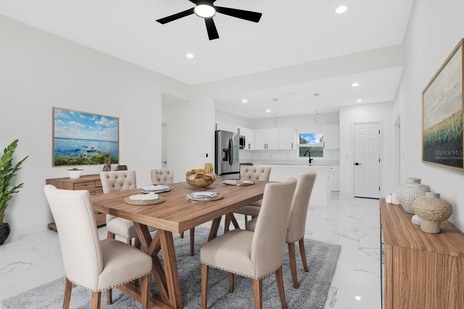 Uma ou mais fotos foram praticamente encenadas. "Em construção", seja bem-vindo a esta nova construção de 3 quartos e 2 banheiros que oferecem a vida moderna no seu melhor. Sem HOA ou CDD. A casa está completa e pronta para os novos proprietários. Localizado em um espaçoso lote de canto em Orange City, a poucos 30 minutos da praia, esta casa apresenta um layout aberto projetado para conveniência e funcionalidade. O coração da casa é a cozinha, completa com utensílios de aço inoxidável, perfeitos para preparar refeições enquanto, simultaneamente, entretenam convidados. O piso de azulejos de cerâmica adiciona um toque de elegância nas principais áreas de estar, conectando perfeitamente a cozinha, o jantar e os espaços de convivência. Cada quarto é de tamanho generoso, proporcionando amplo espaço. A casa também possui dois banheiros cuidadosamente projetados para atender às suas necessidades. O banheiro principal oferece uma vaidade de pia dupla, perfeita para espaço e conveniência compartilhados. O chuveiro oferece um toque moderno, enquanto uma sala de higiene separada garante privacidade adicional. O segundo banheiro serve a casa com uma banheira de tamanho normal, ideal para banhos relaxantes ou uso prático, e é concluído por uma única pia, oferecendo funcionalidade. Ao sair, você é recebido pela área do pátio, ideal para atividades ao ar livre ou churrascos. Com uma garagem de 2 carros, você terá muito espaço para veículos ou armazenamento adicional. Localizado em um bairro pacífico, esta casa oferece uma sensação de privacidade. A área é conhecida por parques próximos, como o Blue Spring State Park, oferecendo muitas oportunidades para atividades ao ar livre, como caiaque. Com acesso conveniente a compras, restaurantes, escolas e grandes rodovias, você desfrutará do equilíbrio perfeito da tranquilidade suburbana e conveniência urbana.