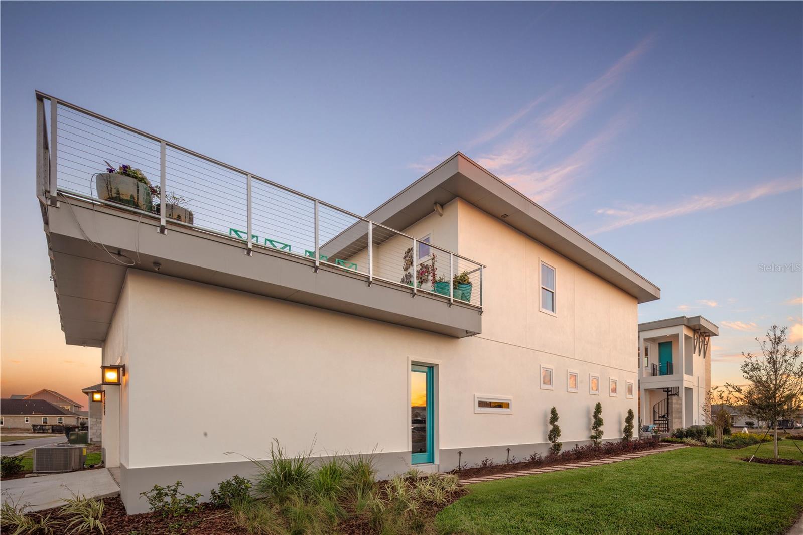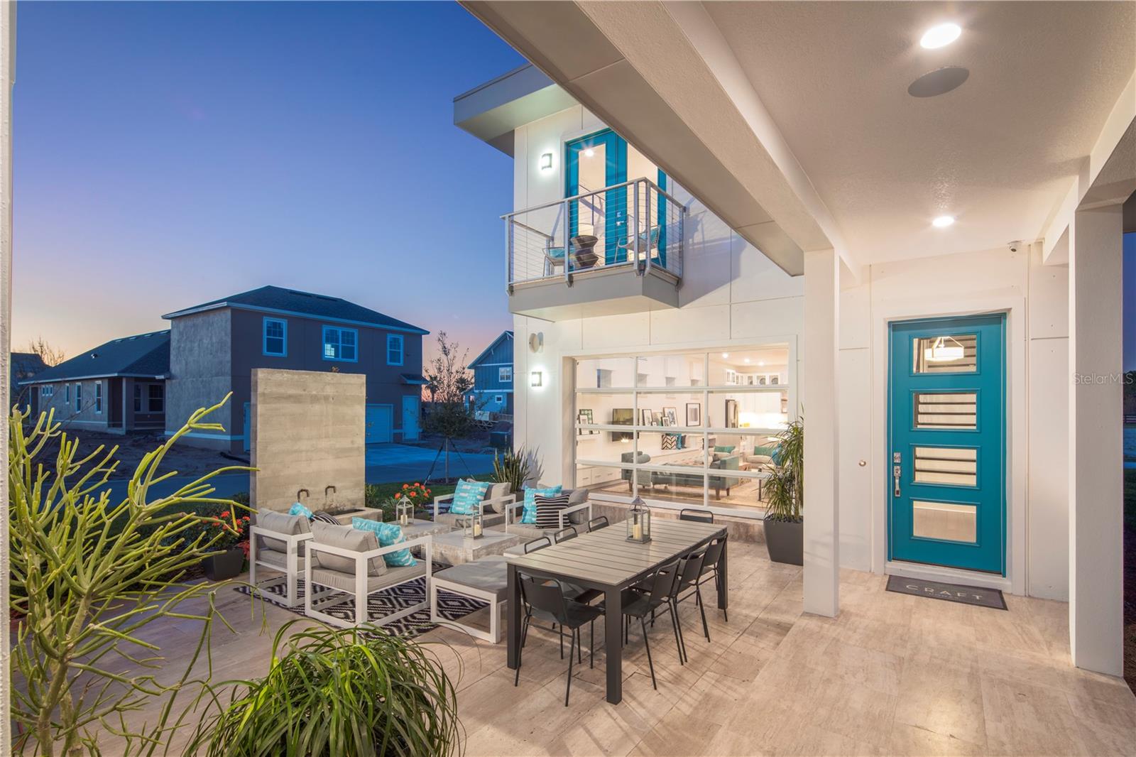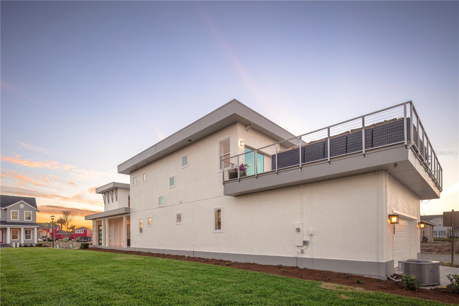 Varanda, calhas de chuva, calçada, sprinkler medido