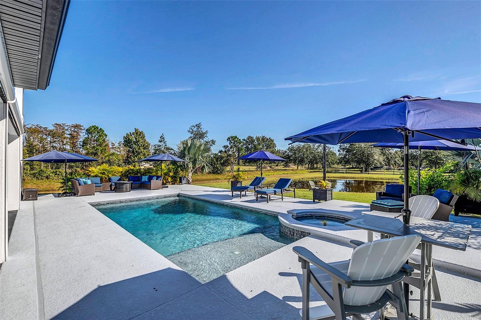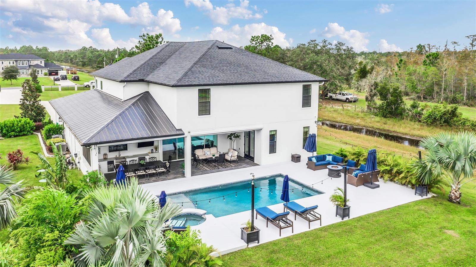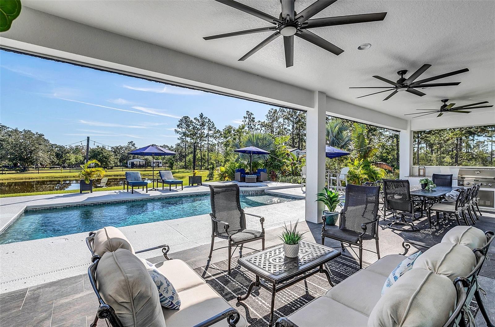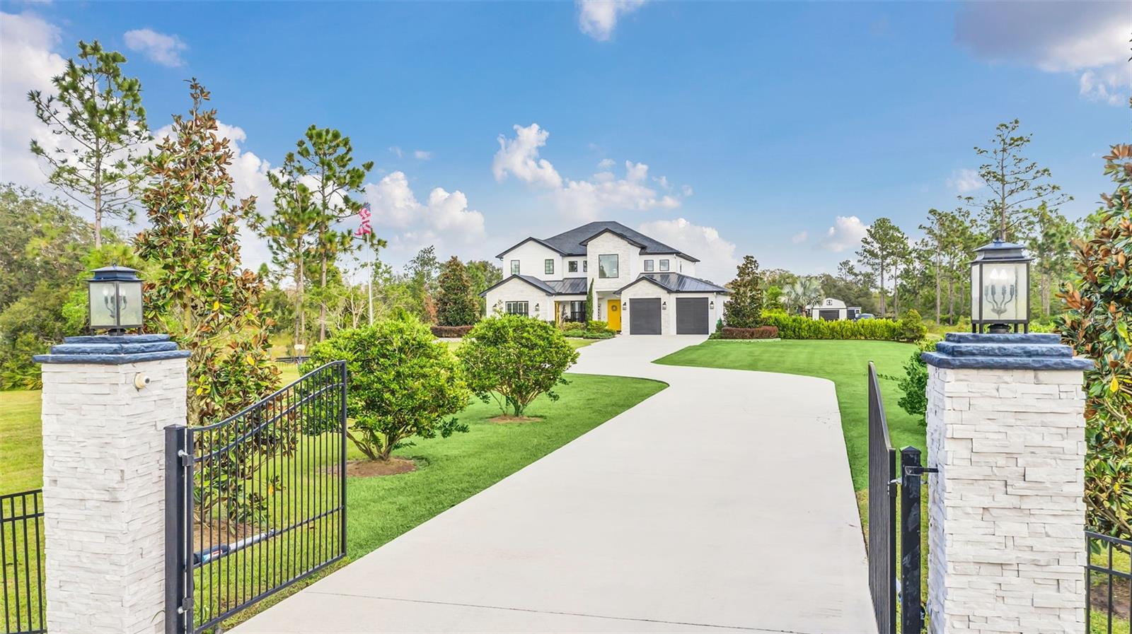 ***Crédito de credor de até $ 38.000 para cobrir os custos de fechamento do comprador se usar nosso credor preferencial!*** Esta requintada casa de fazenda moderna de 6 quartos e 4,5 banheiros fica em quase 2,5 acres de terra alta e seca com seu próprio lago! A propriedade é fechada com uma entrada estendida e possui amplas varandas frontais e traseiras, perfeitas para ver o nascer e o pôr do sol. Telas automáticas em ambas as varandas garantem conforto o ano todo. Ao entrar, você é recebido por belas portas duplas que levam a um espaço luxuoso e aberto, bem equipado para entretenimento. O andar de baixo possui uma área de estar frontal, sala de estar formal, suíte MIL ou home office com banheiro privativo, sala de jantar formal, sala de estar generosa, cozinha dos sonhos do chef com despensa, área de serviço, mudroom, lavabo e uma suíte primária digna de retiro. A suíte principal possui tetos retangulares, persianas automáticas personalizadas, paredes à prova de som e entrada privativa para a varanda. O banheiro tipo spa com vários chuveiros (incluindo chuveiro de efeito chuva) e armários customizados, equipados com central de segurança e vaporizador de roupas, agregam luxo ao espaço. A cozinha do chef possui muito espaço no balcão, armários, uma grande pia de fazenda, enchedora de panelas, adega refrigerada, despensa de mordomo com pia de vegetais e uma geladeira grande adicional. Lembrando-nos que a cozinha é o coração da casa, os assentos em estilo café criam uma atmosfera convidativa para refeições casuais ou jogos de tabuleiro. A área de serviço foi cuidadosamente projetada com pia, armários e lavabo para manter sapatos e mochilas fora da vista. Enormes portas de vidro deslizantes de 4 painéis ficam completamente atrás da parede da sala de estar, trazendo o ar livre para dentro e duplicando o espaço de entretenimento. Uma sala segura maximiza sua segurança e está disponível para visualização durante sua exibição privada. No andar de cima, uma área de estar privativa no loft, centro de jogos ou área de bilhar, home theater, home office ou academia, quatro quartos de tamanho generoso com closets (armários embutidos duplos no quarto 5), duas áreas de estudo com mesas embutidas e dois banheiros completos, e uma lavanderia adicional oferecem amplo espaço para viver e se divertir. Cinema impressionante com assentos escalonados, alto-falantes embutidos e iluminação que elevam as noites de cinema a um nível totalmente novo. A varanda tem vista para a piscina de água salgada, spa e lago privativo e possui telas automáticas na porta deslizante e na parte de trás da varanda. As comodidades adicionais incluem uma cozinha externa com churrasqueira, geladeira, máquina de fazer gelo e pia. Um curral equipado com eletricidade e água fica atrás de uma cerca separada. Pode ser facilmente convertido em um celeiro para cavalos com afluência e pasto. Estruturas adicionais incluem um galpão de armazenamento com eletricidade e um galpão menor para equipamentos de gramado. Com muito espaço para mais arrumação, estacionamento e até uma casa de hóspedes separada, esta propriedade oferece uma combinação perfeita de luxo e funcionalidade. Perfeitamente situada entre o Aeroporto Internacional de Orlando e Porto Canaveral, esta comunidade de golfe e hipismo oferece parques, trilhas, um campo de golfe de 18 buracos, calçadas e uma escola com classificação A! Não perca a oportunidade de fazer desta joia o seu novo lar doce lar!