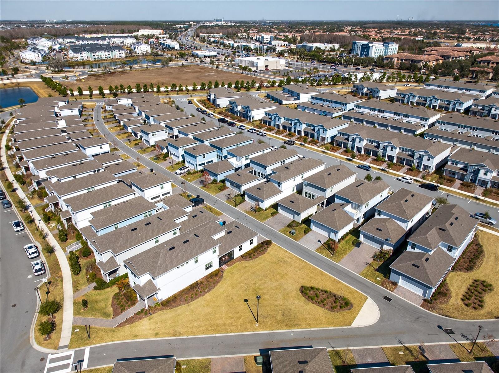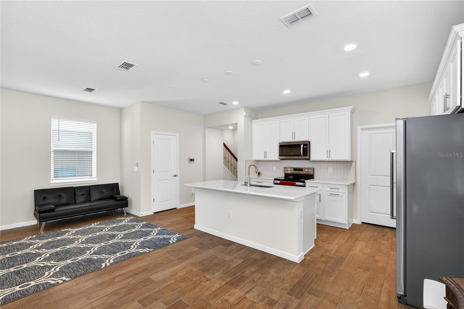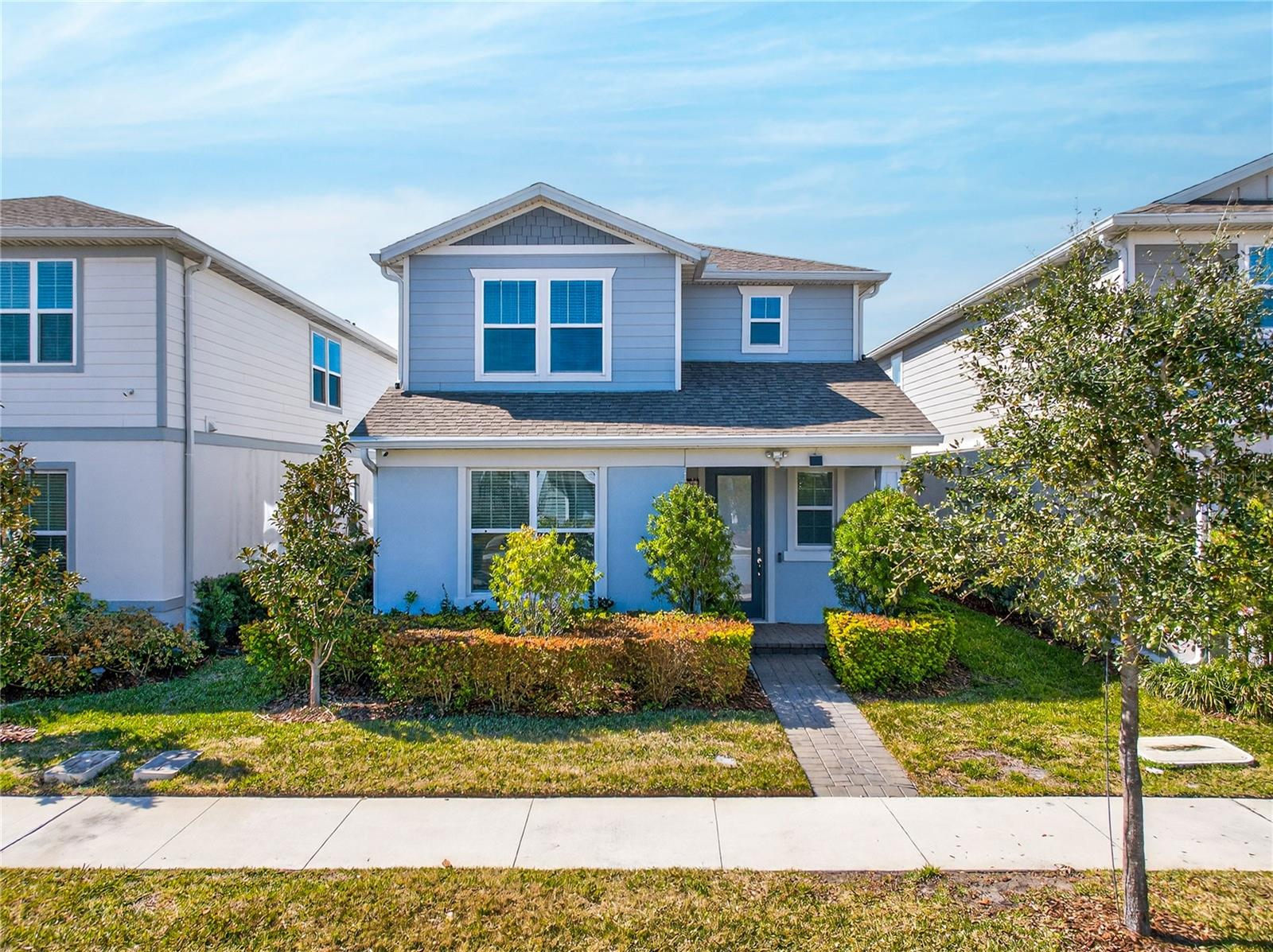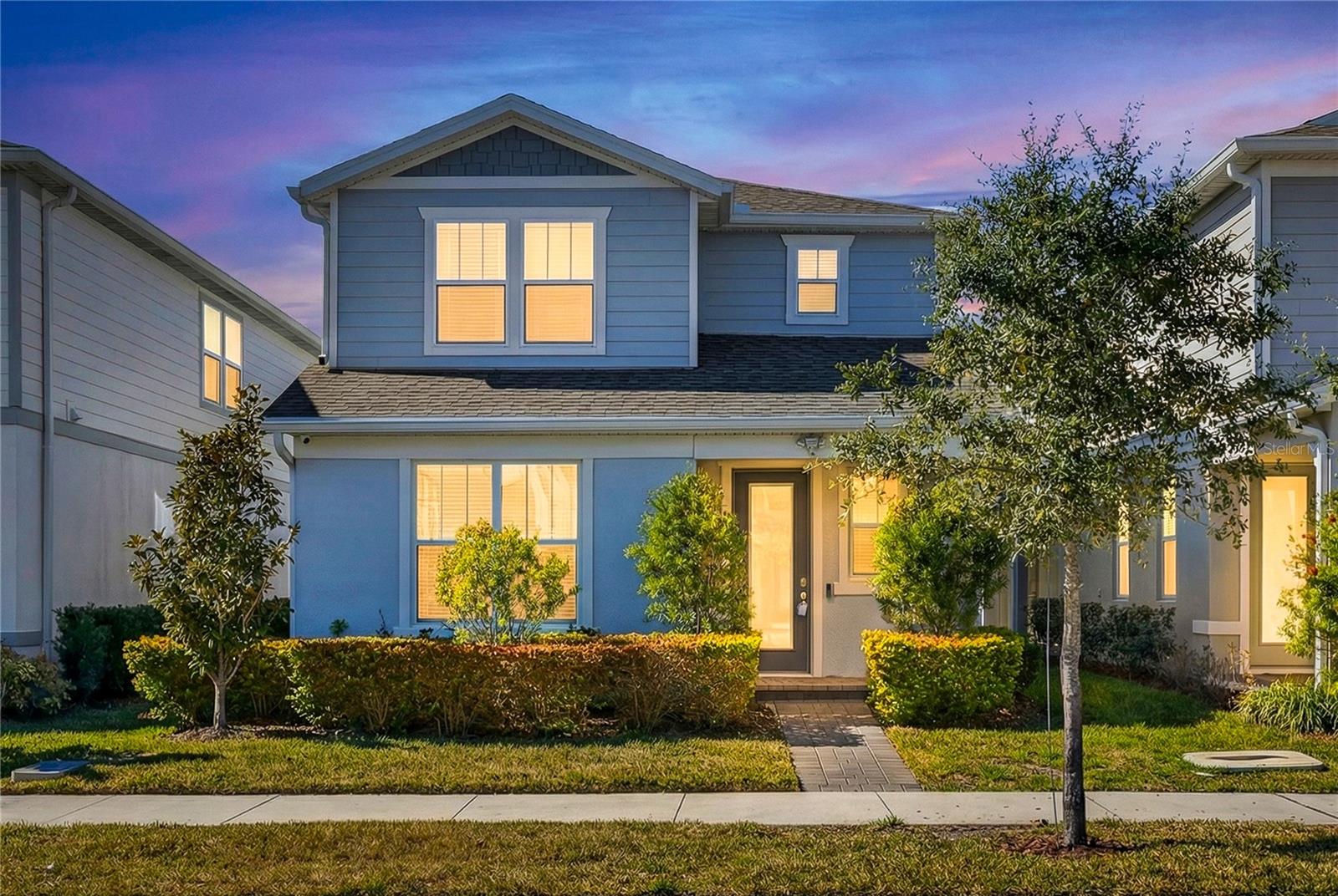 Uma ou mais fotos foram praticamente encenadas. Descubra o epítome do luxo e conforto no modelo Monterey em Isles of Lake Nona. Esta casa apresenta uma planta baixa com um vestíbulo acolhedor que leva diretamente à suíte do proprietário do primeiro andar, que inclui uma vaidade dupla, chuveiro de stand-up e closet no banheiro da suíte. The main level is designed for entertaining, showcasing an open kitchen with 42" upgraded cabinets, quartz countertops, and wood-look ceramic tile, flowing seamlessly into the dining and living areas. Step outside to enjoy the covered lanai or access the 2-car garage with its durable epoxy floor. Upstairs, a versatile loft area—perfect for game nights—complements the additional bedrooms and shared bath, with access to Um baralho de alto nível. Entrada.