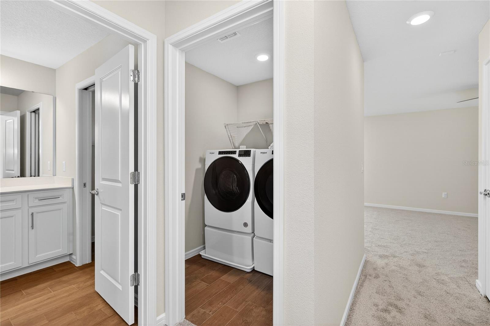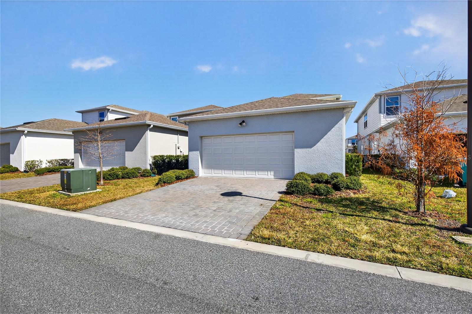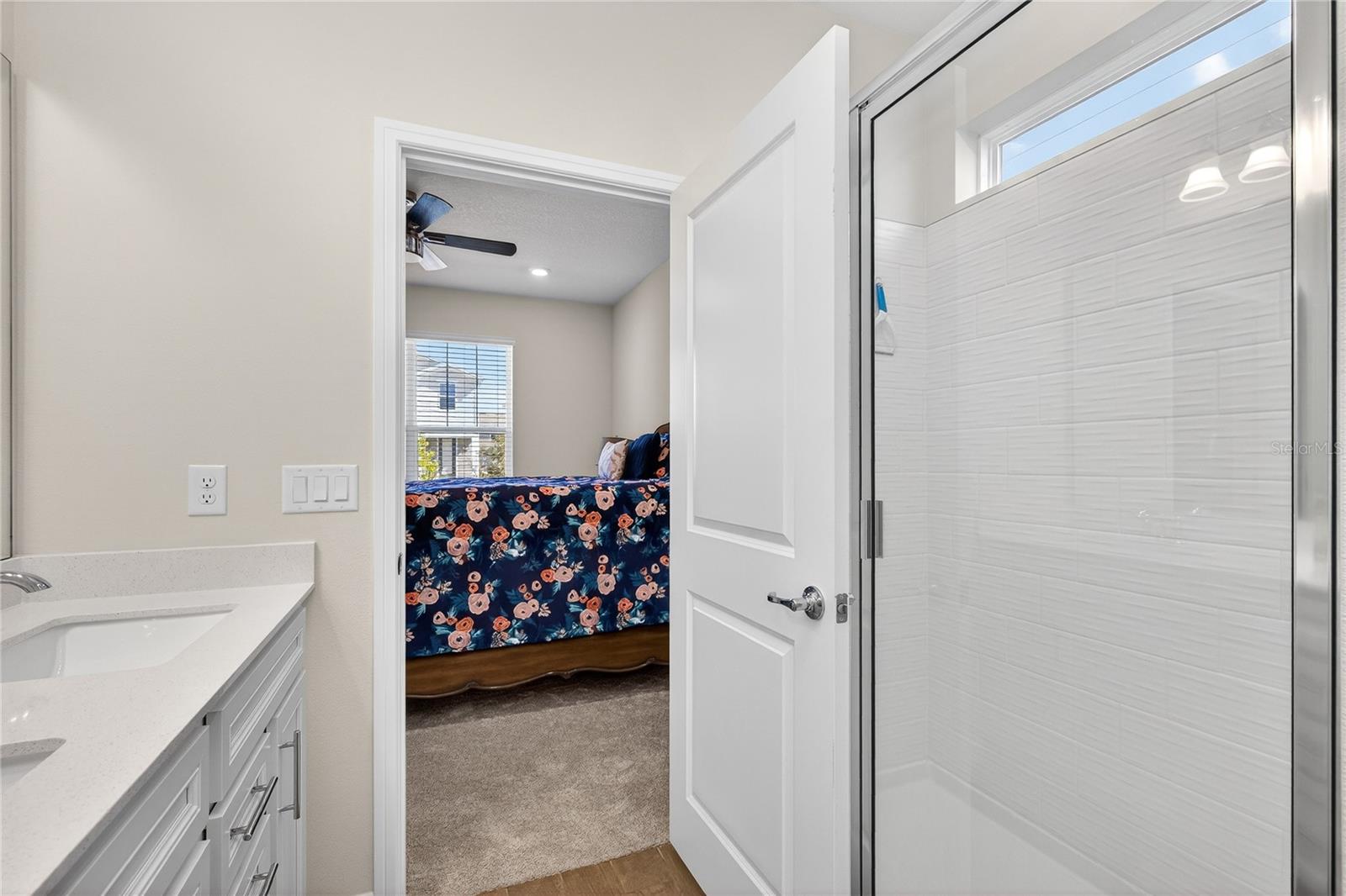 Uma ou mais fotos foram praticamente encenadas. Descubra o epítome do luxo e conforto no modelo Monterey em Isles of Lake Nona. Esta casa apresenta uma planta baixa com um vestíbulo acolhedor que leva diretamente à suíte do proprietário do primeiro andar, que inclui uma vaidade dupla, chuveiro de stand-up e closet no banheiro da suíte. The main level is designed for entertaining, showcasing an open kitchen with 42" upgraded cabinets, quartz countertops, and wood-look ceramic tile, flowing seamlessly into the dining and living areas. Step outside to enjoy the covered lanai or access the 2-car garage with its durable epoxy floor. Upstairs, a versatile loft area—perfect for game nights—complements the additional bedrooms and shared bath, with access to Um baralho de alto nível. Entrada.