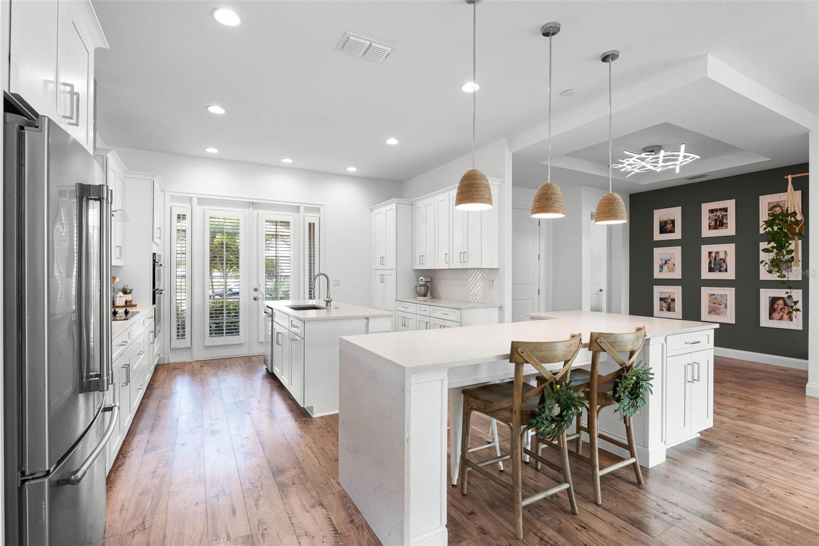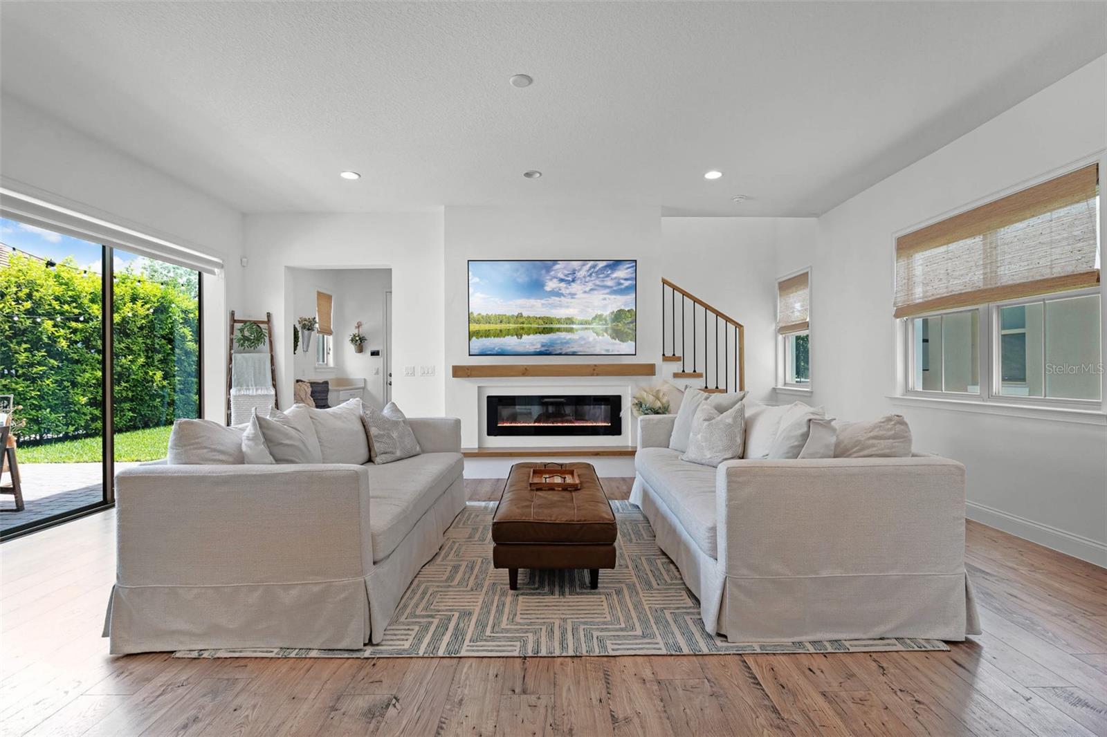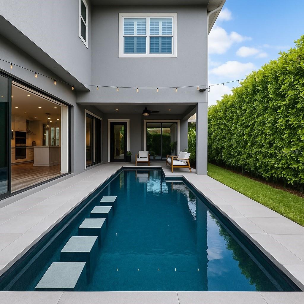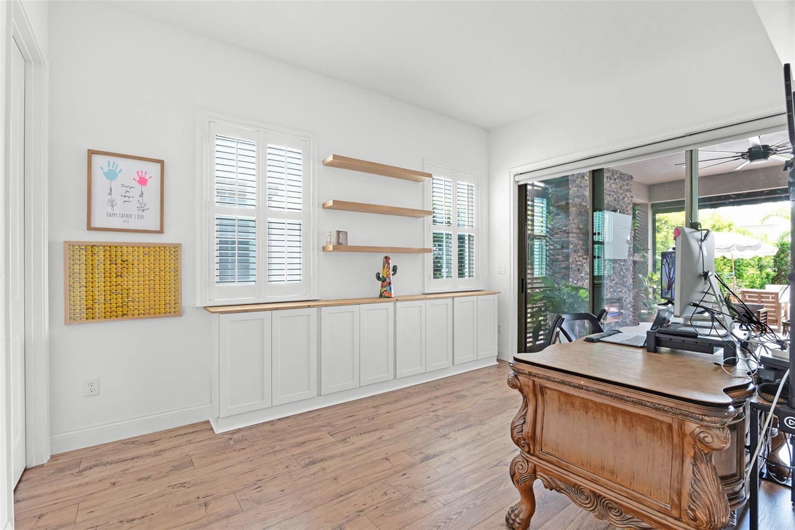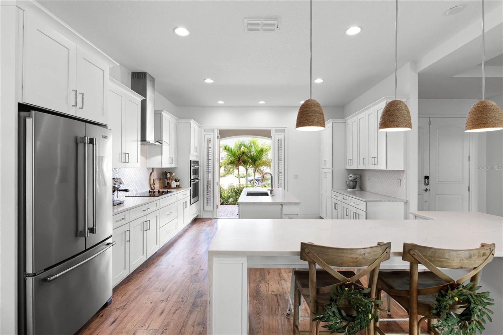 Uma ou mais fotos foram praticamente encenadas. Escondido na comunidade de golfe de Eagle Creek, esta residência impressionante reúne elegância, conforto e um retiro de quintal. Este impressionante casa de 5 quartos e 4 banheiros se estende por 4.211 pés quadrados e oferece uma mistura perfeita de luxo, conforto e design atencioso. Entre em uma varanda frontal coberta de dois andares e seja recebida por uma extensa planta aberta cheia de luz natural. O nível principal mostra o piso de Mohawk Revwood - uma superfície durável e elegante que traz calor e elegância para a casa. A cozinha gourmet é uma verdadeira peça, cuidadosamente projetada para inspirar a criatividade culinária e o entretenimento sem esforço. Possui ilhas duplas-uma dedicada a preparar e cozinhar com uma pia embutida e armazenamento abundante, e o outro ideal para refeições casuais e hóspedes. O espaço é elevado por bancadas de quartzo luxuosas, armários de agitadores brancos com hardware inoxidável e combinação de forno de parede/microondas de topo de linha de topo e geladeira, todos banhados em luz natural. Seja preparando um jantar tranquilo em família ou entretendo uma multidão, esta cozinha oferece elegância, função e fluxo. A sala da família gira em torno de uma lareira elétrica embutida com uma manto de madeira e apresenta portas deslizantes duplas completamente retráteis que se abrem para um espaço tranquilo ao ar livre. Saia de um espaço de estar ao ar livre excepcional que parece seu próprio retiro privado. O pátio coberto é perfeito para diversão durante todo o ano, com uma segunda lareira elétrica emoldurada por pedra empilhada elegante e ladeada por plantadores personalizados de madeira. A área flui sem esforço para o quintal lindamente paisagístico, aprimorado com palmeiras exuberantes, sebes doces de viburno e muito espaço para uma futura piscina personalizada, criando um cenário pitoresco para relaxar, divertir ou jantar sob as estrelas. The backyard is fully fenced with 5” black aluminum fencing and enhanced by sweet viburnum shrubs for a natural hedge and palm trees in the front and back. The first floor includes a bedroom and full bath, perfect for guests or a home office, complete with built-in cabinets and floating shelves & private access to a side courtyard. A custom drop zone, located just inside from the garage, adds everyday convenience. Upstairs, you'll find a spacious loft, a Bônus enorme com portas duplas e uma lavanderia de grandes dimensões com armários embutidos, bancadas de quartzo e uma pia de lavanderia. Para a lavanderia. Perfeito para passeios pacíficos e reuniões de bairro.