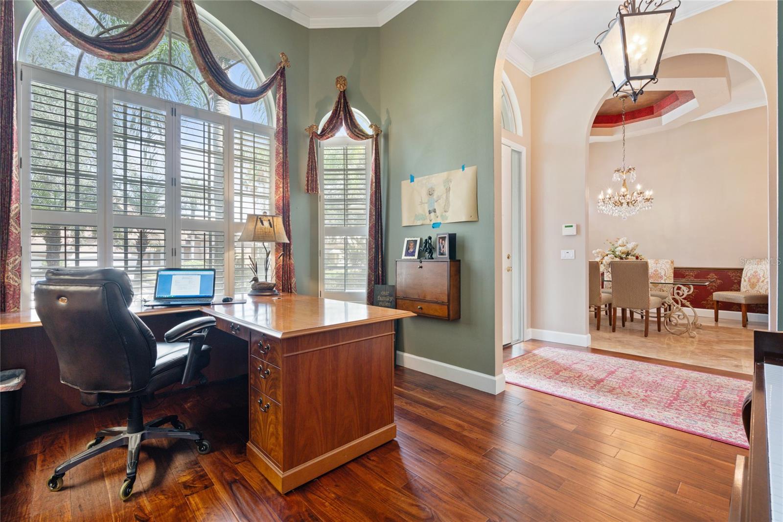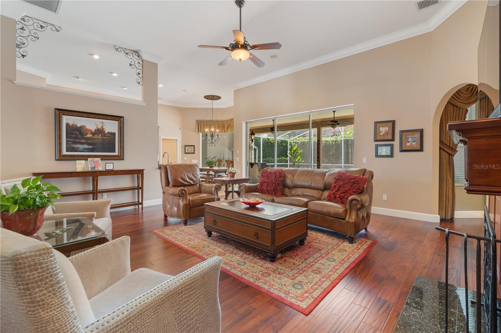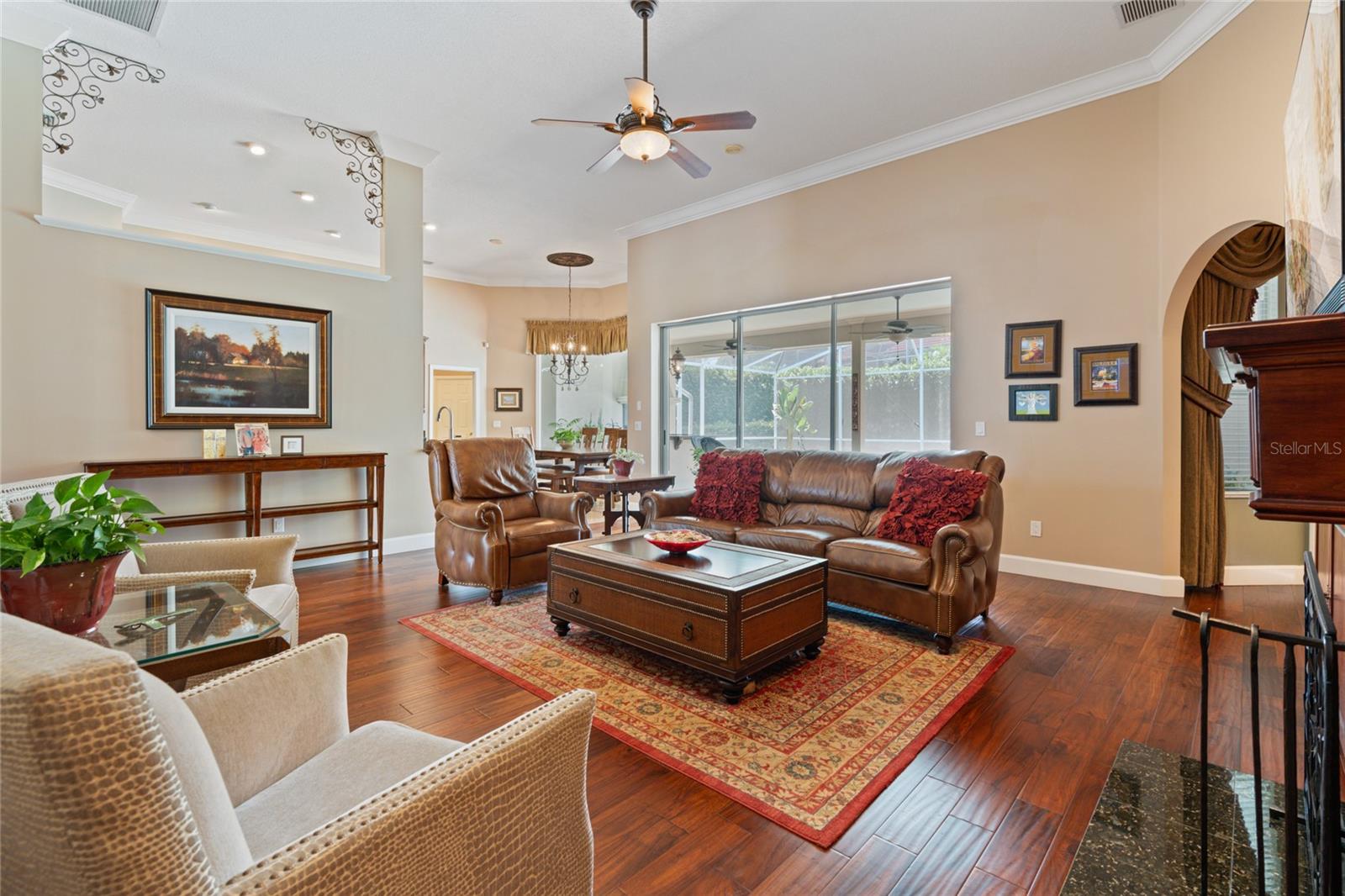 Bem-vindo à sua propriedade personalizada no desejável e virtual portão de guarda Palma Vista, situado no imaculado Campo de Golfe Metrowest Country Club. Apresentando uma piscina privada murada com tela que não é negligenciada por nenhum dos vizinhos e uma vista imponente, este lote elevado tem quase 1/3 de acre e leva você a um hall de entrada acolhedor e um piso plano aberto com ricos pisos de travertino e madeira realçados por sancas e motivos florais de videira em ferro forjado personalizados que adornam os arcos arquitetônicos. A entrada é ladeada pela sala de estar formal que servia de escritório e pela sala de jantar formal que está convenientemente localizada ao lado da cozinha. Sua cozinha gourmet bem equipada e atualizada apresenta eletrodomésticos de aço inoxidável atualizados, uma ilha de cozinha, despensa, armários de cerejeira sólidos e bancadas atualizadas que se estendem até uma barra de café da manhã que é ideal para servir aos seus convidados suas criações culinárias mais tentadoras; tornando esta planta aberta ideal para entretenimento. O recanto de café da manhã adjacente tem vista para o sereno quintal privativo e para a piscina e se abre para a acolhedora sala de família com uma aconchegante lareira a lenha ladeada por estantes personalizadas de madeira trabalhada com portas de arame de latão cruzadas personalizadas; o espaço ideal para exibir seus itens colecionáveis e artefatos mais valiosos. O espaçoso retiro principal sereno está localizado em uma configuração de planta dividida e possui 2 closets espaçosos e vistas serenas de sua piscina cintilante e quintal privativo. O banheiro principal da suíte possui 2 pias altas separadas de granito, armários de madeira personalizados, banheira de hidromassagem e toalete e chuveiro separados com piso de mosaico, chuveiros duplos e paredes de travertino do chão ao teto. O quarto 2 está escondido no lado oposto e possui um banheiro adjacente, tornando-o ideal para seus quartos de hóspedes. Os quartos 3 e 4 compartilham o terceiro banheiro e são adjacentes à lavanderia e à enorme garagem com entrada lateral para 3 carros. A varanda espaçosa com sombra e tela possui portas de vidro deslizantes dobráveis que abrem toda a planta baixa para a varanda; ideal para entretenimento. O charmoso deck de pedra do rio leva você a uma piscina cintilante com uma nova bomba de piscina e uma cozinha de verão totalmente equipada e churrasqueira e exaustor infravermelho Solaire; seu oásis privado ideal para escapar e desfrutar de sua bebida favorita. Tudo isso em uma excelente localização para escolas com classificação A e perto das principais rodovias, atrações da área, lojas, Campus Oeste do Valencia Community College e a poucos minutos do Aeroporto Internacional de Orlando. Agende hoje mesmo sua exibição privada...