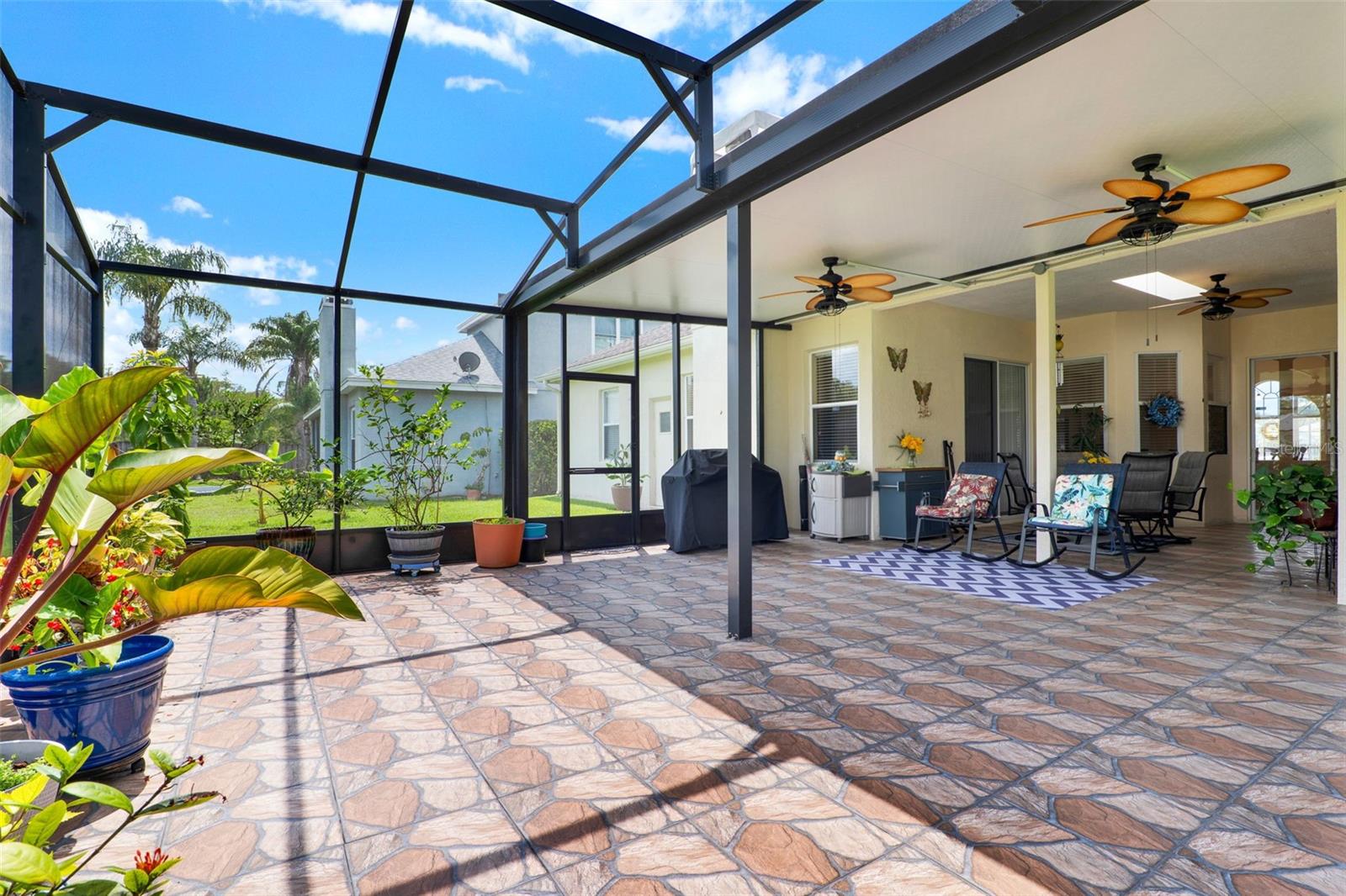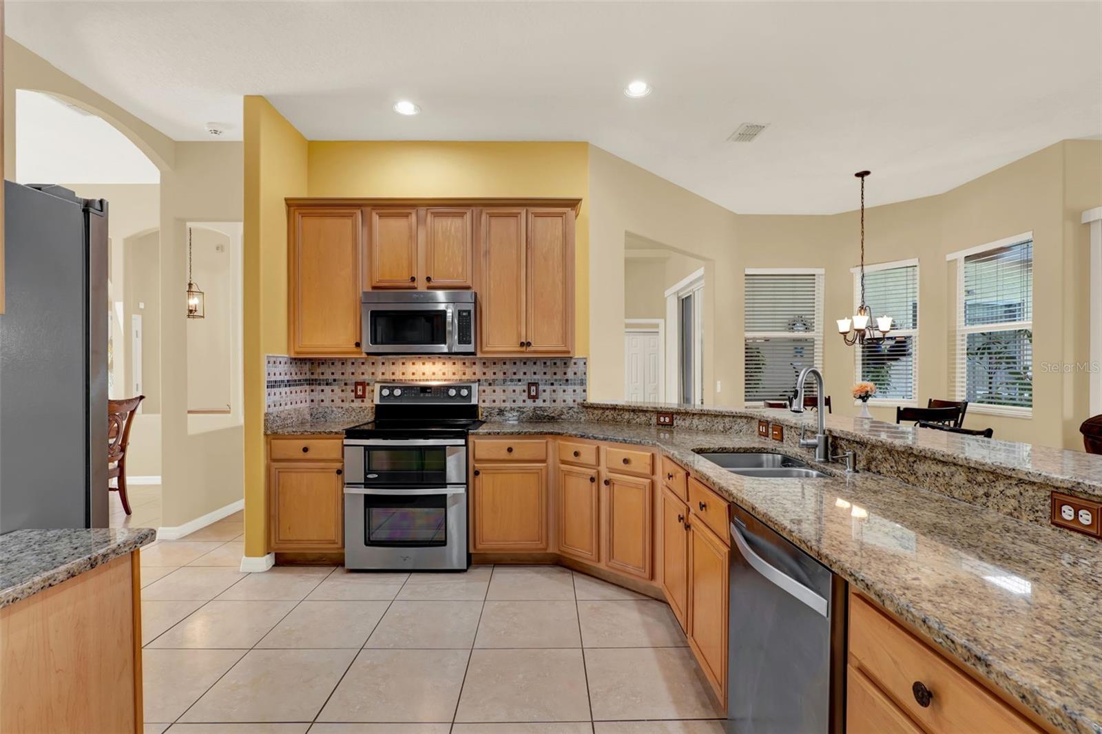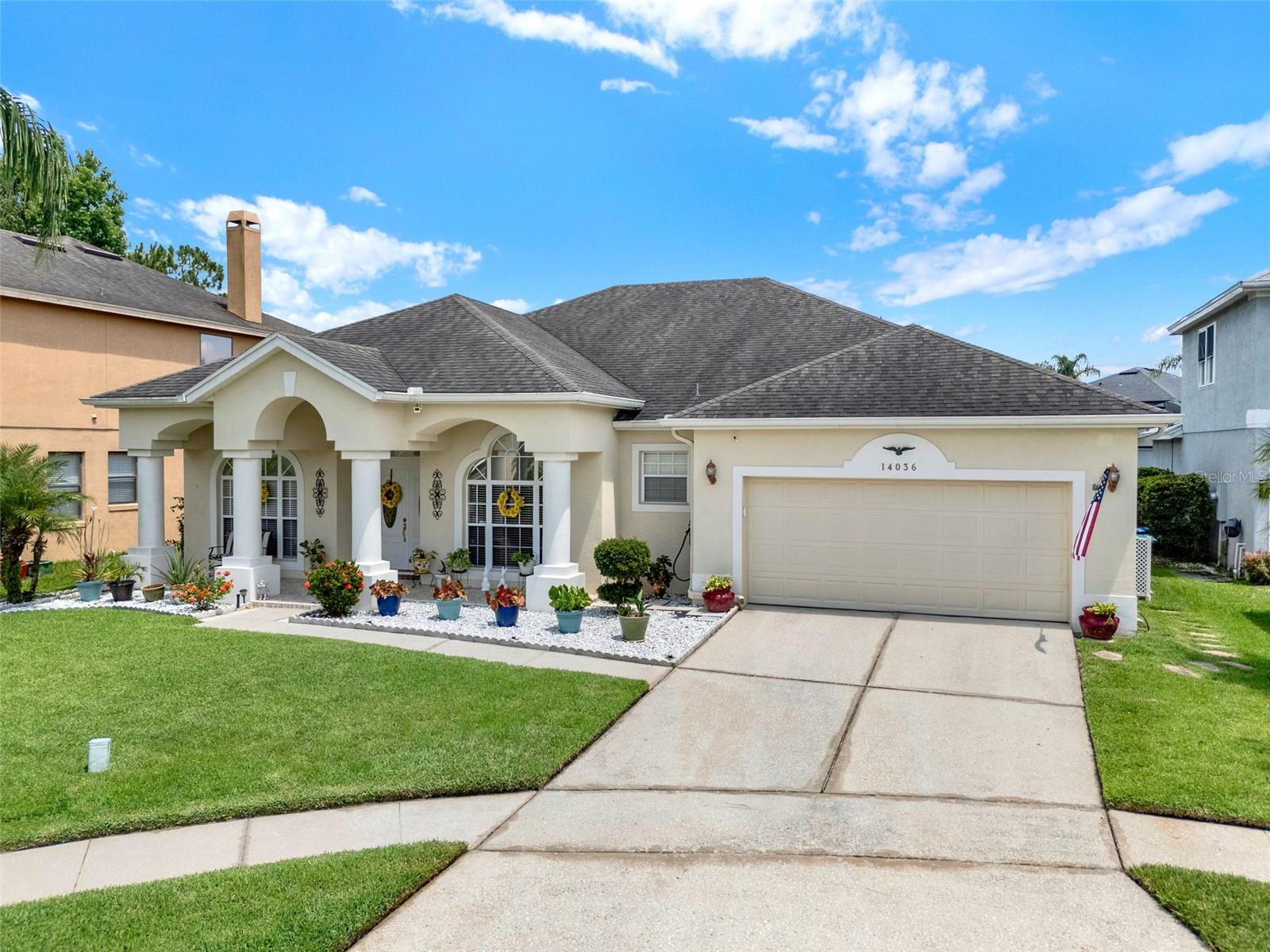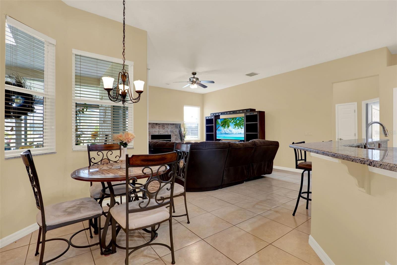 Este lindo lar de 4 quartos/2 banheiros, um andar, está localizado em um beco sem saída tranquilo na adorável comunidade de reserva de Waterford Chase. Esta casa foi meticulosamente mantida e oferece uma planta aberta e dividida com muita luz natural. Possui tetos altos e lindos ladrilhos de piso. The spacious kitchen features 42" maple cabinets, granite countertops, Stainless Steel Appliances, built-in desk, and a large breakfast bar. It overlooks the family room with a beautiful fireplace and sliding glass doors overlooking the Lanai. The recently added covered and screened Lanai provides lots of extra living space to enjoy the beautiful Florida weather and sunsets. The large Primary Bedroom has a big walk-in closet, and the ensuite bathroom is HUGE with an oversized O armário de linho, um chuveiro separado e uma vaidade dupla.