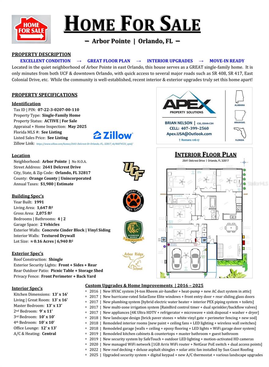O vendedor está oferecendo US $ 5.000 para os custos de fechamento do comprador! Localizado no bairro tranquilo de Arbor Pointe, em East Orlando, esta casa serve como uma maravilhosa casa unifamiliar. A apenas alguns minutos da UCF e do centro de Orlando, com acesso rápido a várias estradas principais, como SR 408, SR 417, East Colonial Drive, etc. Enquanto a comunidade está bem estabelecida, as recentes atualizações interiores e externas realmente diferenciam esta casa! Esta casa meticulosamente mantida passou por uma série de atualizações e reformas de alta qualidade de 2016 a 2025, tornando-a pronta para a mudança e embalada com recursos modernos. Os principais destaques incluem um sistema HVAC de 2016 com um manipulador de ar Rheem de 4 toneladas, bomba de calor e novos dutos do sótão. Em 2017, a casa foi fortificada com janelas de elite solarzona com classificação de furacões, uma nova porta de entrada frontal e portas de vidro deslizantes traseiras. Desfrute de paz de espírito com um sistema de encanamento totalmente atualizado, aquecedor de água elétrica híbrido e nova tubulação PEX. As características ao ar livre brilham com um sistema de irrigação arco-arco de uma zona, paisagismo fresco com pedras de pavimentação, cercas de perímetro e um portão de vinil branco (2018). O interior possui salas remodeladas, tinta atualizada, ventiladores de teto, iluminação LED e interruptores de parede sem fio. A garagem foi completamente atualizada com pisos epóxi, controles de porta habilitados para Wifi e iluminação moderna. Uma reforma de cozinha e banheiro (2019) traz estilo contemporâneo, complementado por novos aparelhos, incluindo uma HDTV 4K, geladeira, microondas, lavadora e secadora. Um sistema de segurança SafeTouch com câmeras HD e iluminação de movimento ao ar livre garante conforto e segurança. Os compradores com experiência em tecnologia apreciarão a rede WiFi gerenciada de 1 GB com pontos de acesso duplo (2020) e o novo telhado (2022) com telhas de asfalto de luxo e um ventilador de sótão solar. Em 2025, outras atualizações incluem um sistema de segurança aprimorado, teclado digital, termostato inteligente e atualizações de paisagismo. Esta casa combina a conveniência moderna com a durabilidade - perfeita para os compradores que buscam estilo, segurança e conforto.