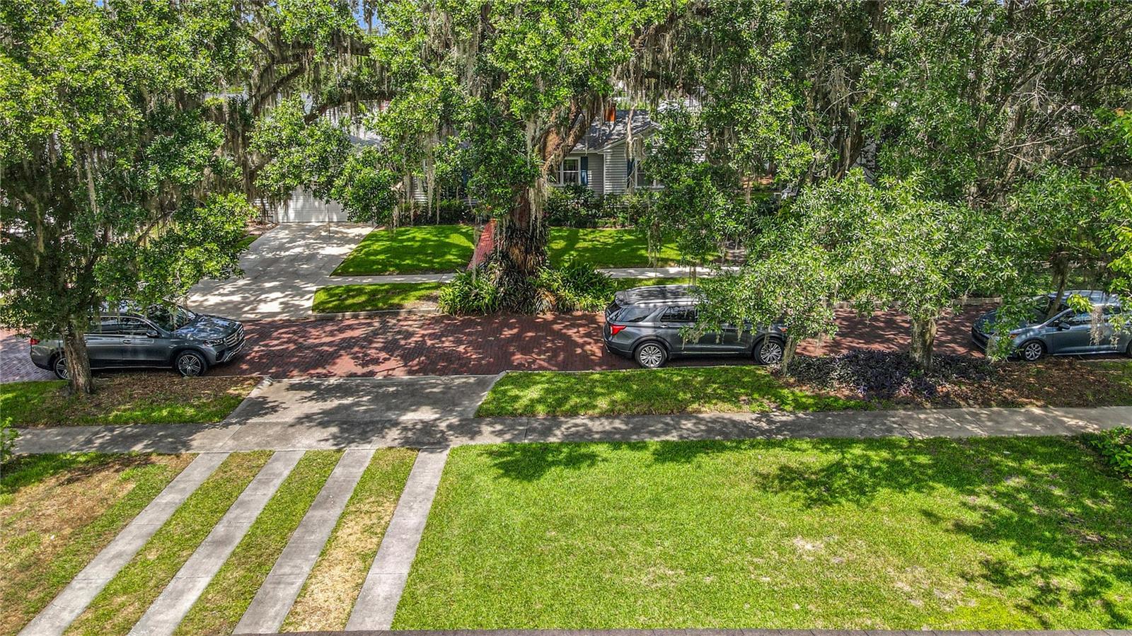 Terreno paisagístico, grande, calçada, tijolo de rua
