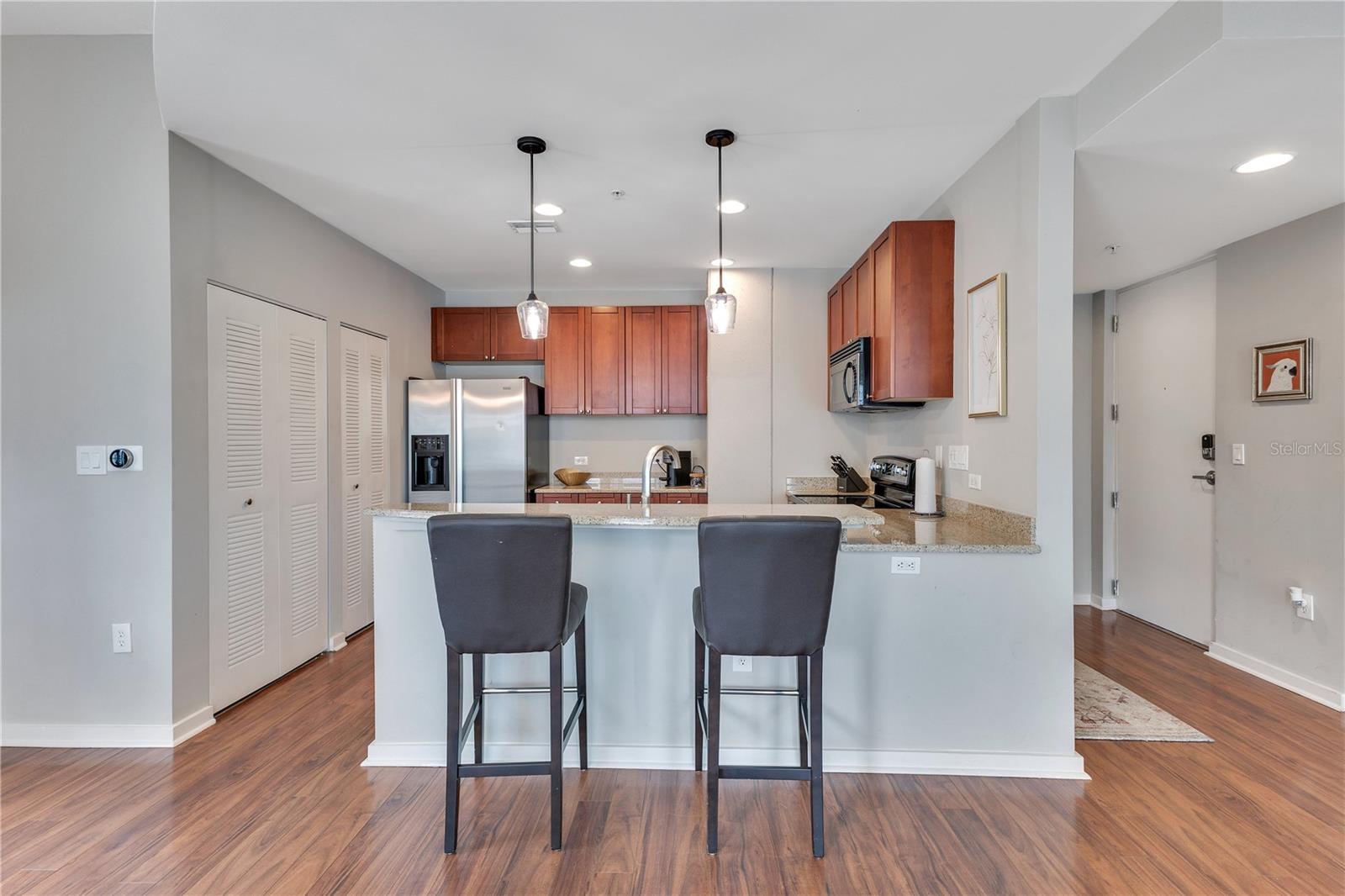 O condomínio exclusivo do meio do Jackson, bem no coração de Thornton Park-um dos bairros mais procurados do centro de Orlando. Esta unidade de canto de 1 quarto e 1 banheiro oferece uma espaçosa áreas de estar de layout aberto. A cozinha flui para o espaço, tornando -o ideal para entretenimento, com bancadas em granito, utensílios de aço inoxidável e muito espaço para se reunir. Grandes janelas na área principal trazem luz natural e abertas a um pátio privado. Aproveite as noites fora ou aproveite o baralho na cobertura com churrasqueiras comunitárias. O quarto principal também possui janelas de grandes dimensões com vista para a varanda e um banheiro na suíte com pias duplas e um grande chuveiro de vidro. O quarto de hóspedes fica no lado oposto da unidade para maior privacidade. A lavanderia possui armários embutidos com contadores de granito e backsplash correspondentes para armazenamento e espaço de trabalho extras. Este condomínio inclui dois lugares de estacionamento de garagem seguros e segurança de construção 24/7. A poucos minutos do Lago Eola, o Dr. Phillips Performing Arts Center, Jantar, Lojas e tudo o que o centro de Orlando tem a oferecer.