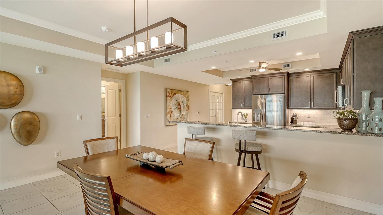 QUE VISTA e as fotos não fazem justiça! O VENDEDOR ESTÁ OFERECENDO o pagamento antecipado de três (3) meses de taxas HOA em nome do comprador no fechamento. UNIDADE TOTALMENTE MOBILIADA/CHAVE NA MÃO!!! Prepare-se para ser cativado pelo pôr do sol de cair o queixo em sua enorme varanda privativa com tela, oferecendo vistas desobstruídas de Little Sarasota Bay até a pacífica ilha barreira de Casey Key. Bem-vindo ao Edgewater em Hidden Bay – um condomínio fechado de 12 acres em estilo resort perfeitamente posicionado entre o charme da Veneza histórica e a vibração cultural do centro de Sarasota. Esta residência impecavelmente mantida de três quartos, dois banheiros e um salão oferece vistas panorâmicas do mar e um estilo de vida costeiro fácil e elegante. Entre em um layout claro e de conceito aberto com uma espaçosa área de estar e jantar - perfeita para entreter ou relaxar enquanto aprecia a paisagem. A cozinha gourmet é o sonho de um chef, com eletrodomésticos KitchenAid de aço inoxidável, bancadas de granito, armários de madeira real de 42", assentos na altura do balcão e armazenamento abundante. Tetos em caixotões e rodapés de 5 polegadas adicionam detalhes arquitetônicos refinados por toda parte. A ampla suíte principal é um retiro tranquilo com acesso direto à varanda, closets duplos e um banheiro inspirado em spa com pias duplas e um chuveiro com box de vidro. Um layout de quarto dividido oferece privacidade ideal, enquanto o a lavanderia completa inclui armários embutidos e uma pia para maior comodidade. Destaques adicionais incluem encanamentos Kohler, janelas e portas contra o impacto do furacão e uma abundância de luz natural por toda parte. Oferecida mobiliada, esta casa está pronta para morar. (atualmente em reconstrução). Desfrute de acesso incomparável a praias premiadas (apenas 6,5 milhas de Siesta Key e Nokomis Beach), Bay Street Park, Legacy Trail, Oscar Scherer State Park, lojas, restaurantes, marinas, golfe e instalações médicas de primeira linha.
