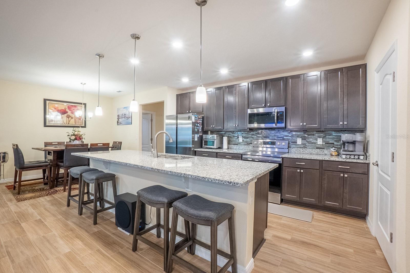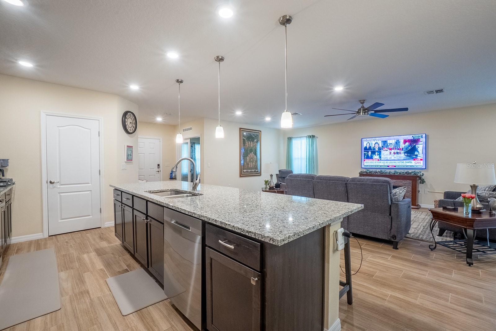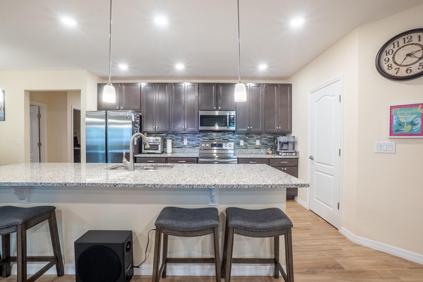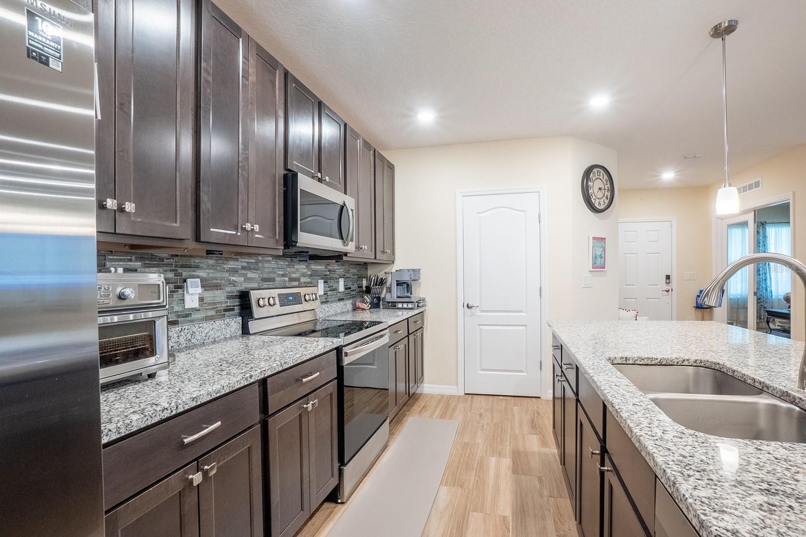 Construído em 2020, esta impressionante casa de 3 quartos/2 banheiros oferece a mistura perfeita de design moderno, atualizações luxuosas e funcionalidade cotidiana. Situado em um lote de canto de grandes dimensões com um lanai exibido (o piso é revestido de epóxi) e muito espaço para adicionar sua piscina dos sonhos. Entre em um layout de conceito aberto com piso de luxo, iluminação atualizada e uma cozinha gourmet completa com bancadas em granito, utensílios de aço inoxidável, armários personalizados e uma barra de café da manhã todo o tamanho da cozinha, conceito aberto completo. A suíte primária oferece um retiro sereno, vaidade de pia dupla, chuveiro espaçoso (azulejo). Recursos adicionais são uma saída de carregamento de EV na garagem de grandes dimensões, as calhas de chuva adicionadas, uma cobertura e cerca combinadas para privacidade, tomada de gerador para conectar o gerador, painel elétrico atualizado com um protetor de surto de casa inteira, incluindo sistema de irrigação com um poço. Esta casa é melhor que a nova.