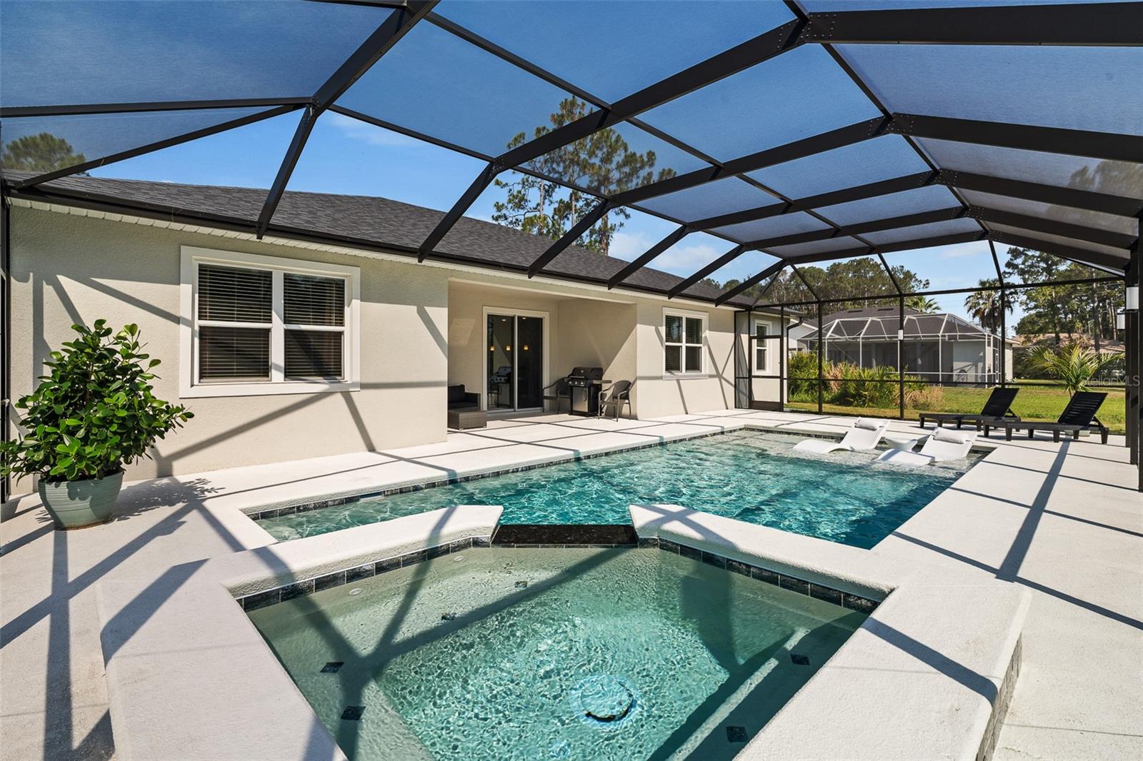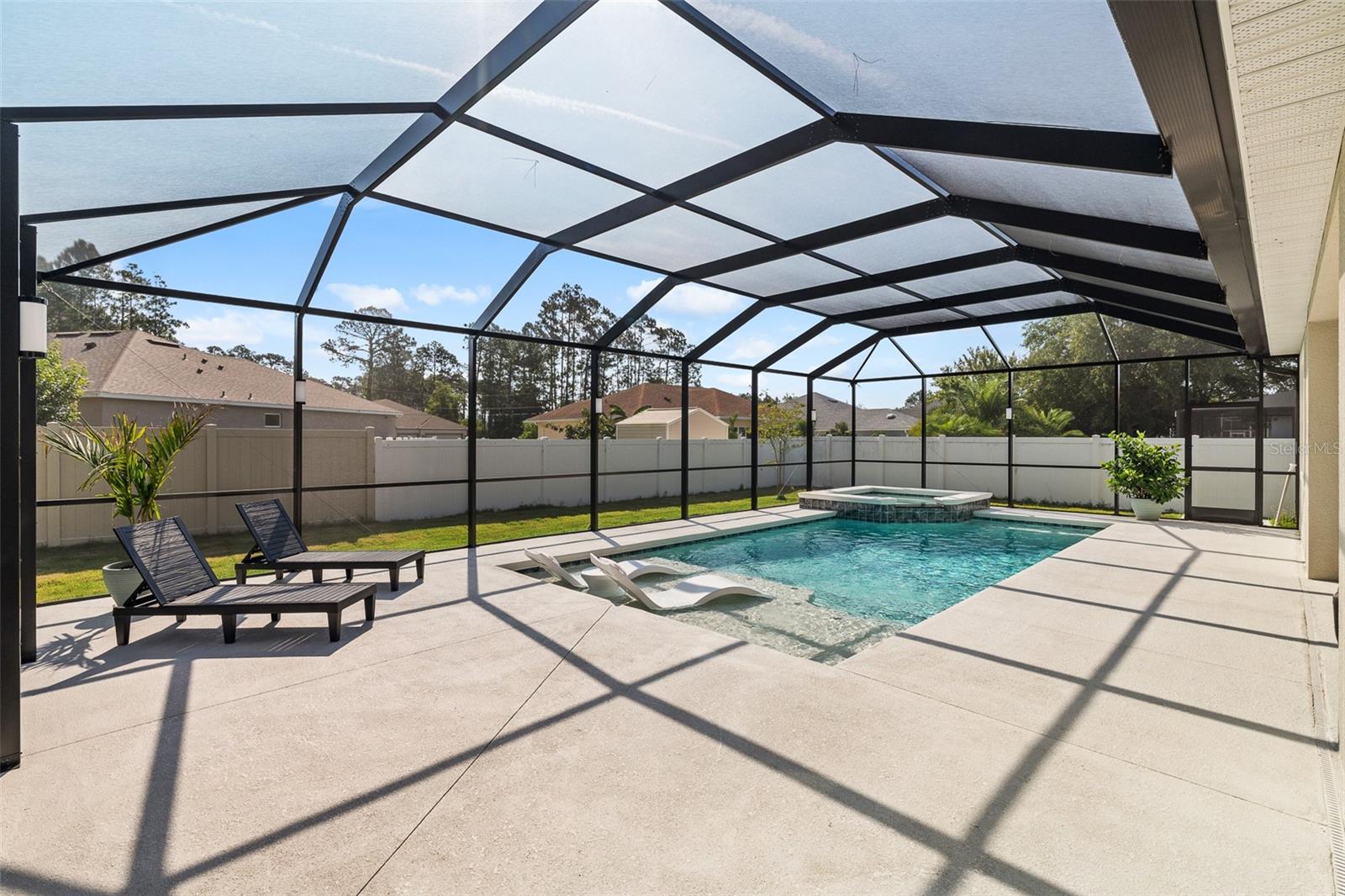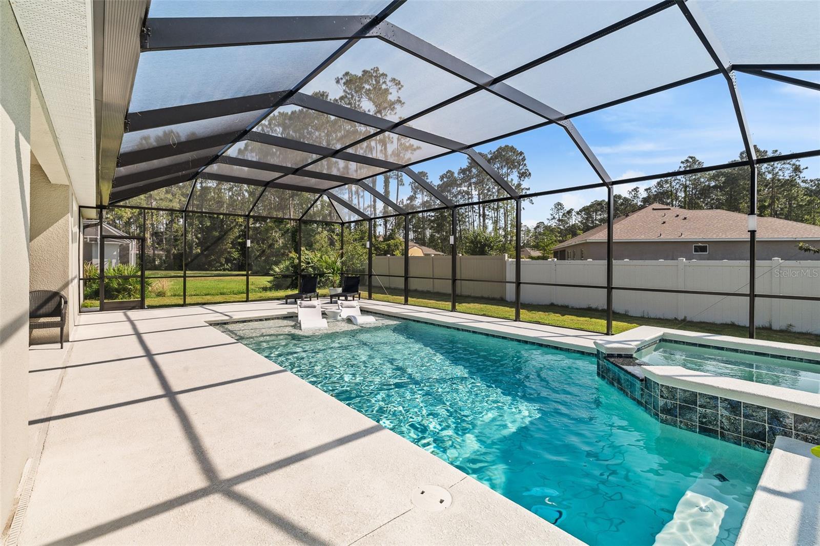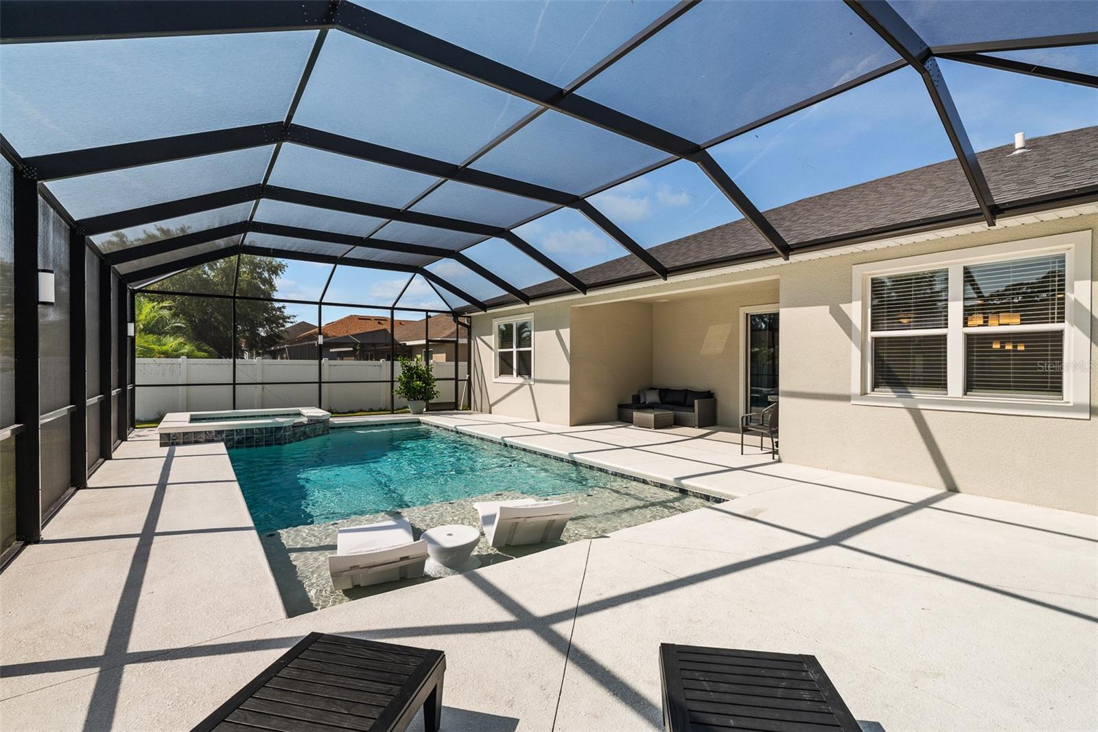 A sua casa dos sonhos aguarda e agora é oferecida a um preço fantástico !!! Você saberá que sua pesquisa é o momento em que você entra nessa casa moderna de tirar o fôlego construída em 2023, completa com uma nova piscina e spa novinhos! Meticulosamente mantido, esta casa de bloqueio de concreto Brite oferece uma espaçosa planta aberta, com mais de 2.300 pés quadrados, que inclui quatro quartos, três banheiros completos e um escritório versátil ou espaço flexível. O design do conceito aberto mostra uma espaçosa área de estar que inclui uma abertura deslizante de grandes dimensões para o Lanai coberto. Um amplo gabinete rastreado envolve a piscina e o spa de água salgada de primeira linha, completa com uma prateleira solar, tornando esta casa perfeita para entretenimento! Notable features include quartz countertops throughout, stainless steel appliances, 42-inch real wood soft-close cabinets, luxury tile plank flooring throughout the entire home, an irrigation system, an oversized garage, and 9'4" ceilings with a tray ceiling in the primary suite. The primary suite also boasts a spacious walk-in closet that is so large it could be mistaken for an additional bedroom. One of the secondary bedrooms even features its own Banho de segurança! Praia.