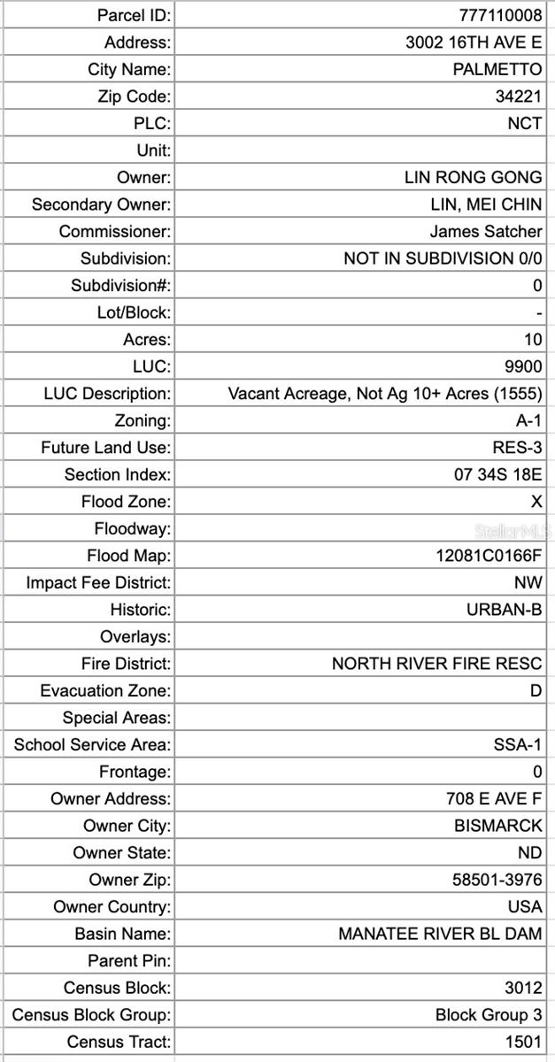 Grande oportunidade para o desenvolvimento da terra. Temos 10 acres localizados em East Palmetto, ao norte da 301N/10th St. Property tem um futuro uso da terra do RES-3. Grande oportunidade para o desenvolvedor residencial. A propriedade não está atualmente subdividida. Não há serviços públicos na propriedade neste momento. A propriedade está sendo vendida como está. Uma parte da propriedade é considerada áreas úmidas. O comprador é responsável por toda a due diligence e confirmando que isso é adequado para o seu objetivo. Foi concluído um passo ambiental de alto nível (não um estudo). Por favor, veja fotos.