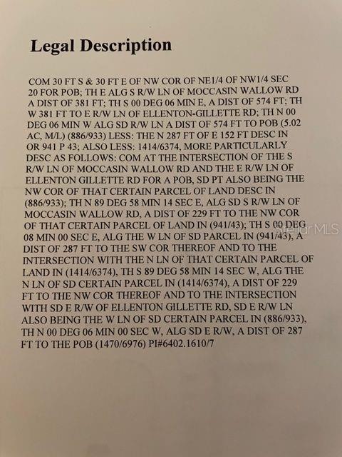 Com30 pés e 30 pés de NW do NE1/4 do NW1/4 seg 20 para POB; O alg s r/w ln de mocassin wallow rd um distante de 381 pés; Th s 00 graus 06 min e disti de 574 pés; Th w 381 pés a r/w ln de Ellenton-Gellette Rd; Th n 00 graus 06 min Veja a imagem anexada para obter uma descrição legal completa!