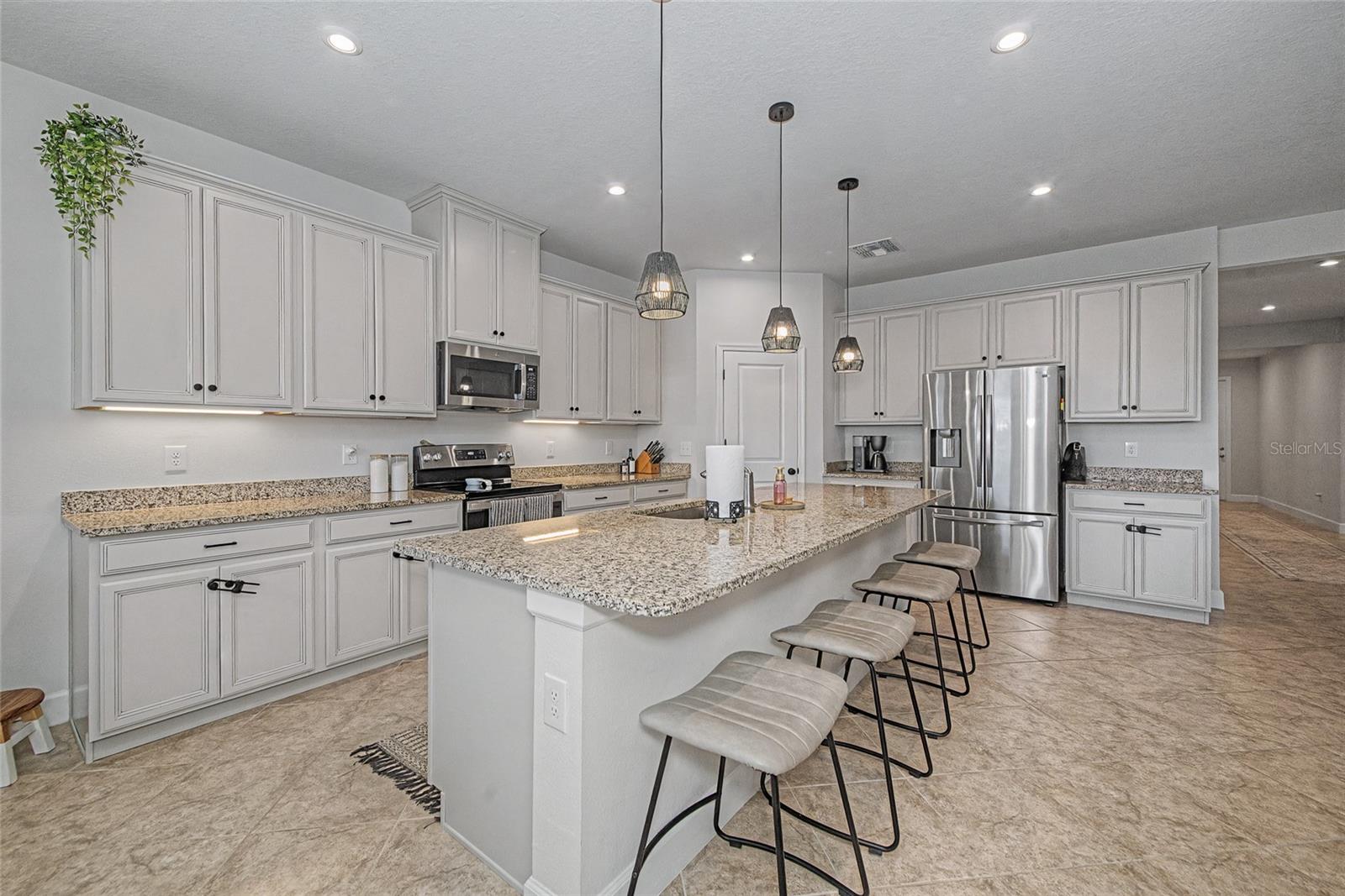 Desde a impressionante atratividade até inúmeras atualizações modernas, esta casa excepcional certamente impressionará! No momento em que você entrar, você apreciará o layout claro e de conceito aberto, com piso de cerâmica colocado diagonalmente em todas as áreas principais, ventiladores de teto de design atualizados em todos os quartos e um grande controle deslizante duplo que leva a vistas panorâmicas e serenas do lago. Perto do hall de entrada, dois quartos espaçosos apresentam um generoso armário de armazenamento e compartilham um banheiro no corredor lindamente decorado com pia dupla, banheira de imersão e armários premium. Do outro lado do corredor, passando pela lavanderia de grandes dimensões com inúmeras opções de armazenamento, você encontrará uma suíte privativa, perfeita para hóspedes ou familiares. A cozinha inspirada no chef apresenta uma grande ilha central, eletrodomésticos de aço inoxidável - incluindo uma geladeira Samsung French Door - e recursos de iluminação elegantes com chapéus altos embutidos, luminárias pendentes e iluminação sob o armário, criando o ambiente perfeito para entretenimento e reuniões familiares. A zona de refeições iluminada pelo sol, rodeada de janelas, preenche o espaço com luz natural. Lindos acabamentos de design complementam os armários, balcões de granito e tons de parede, combinando harmoniosamente por toda parte. A luxuosa suíte do proprietário possui um teto retangular que acrescenta interesse arquitetônico, janelas amplas emoldurando vistas tranquilas do lago e um closet com amplo espaço. O banheiro principal em estilo spa oferece chuveiro romano de vidro sem moldura com assentos embutidos, pia dupla e armários atualizados. Um versátil escritório/escritório atrás de elegantes portas de vidro francesas oferece um ambiente ideal para trabalho ou relaxamento. Saia para a varanda com janelas em estilo aquário, onde você pode relaxar e apreciar a paisagem deslumbrante da Flórida, aprimorada pela iluminação do quintal traseiro para diversão noturna. Um quintal cercado oferece privacidade, segurança e tranquilidade, além de um espaço seguro para os animais de estimação brincarem livremente. A garagem para três carros oferece bastante arrumação e flexibilidade de estacionamento. Sem taxas de CDD e taxas BAIXAS de HOA, os residentes têm acesso a uma piscina comunitária, área de recreação, trilhas para caminhada e parque para cães. Convenientemente localizada perto de escolas, lojas e restaurantes de primeira linha, esta casa oferece a combinação perfeita de conforto, estilo e localização. Evite a espera: a casa dos seus sonhos está pronta hoje!