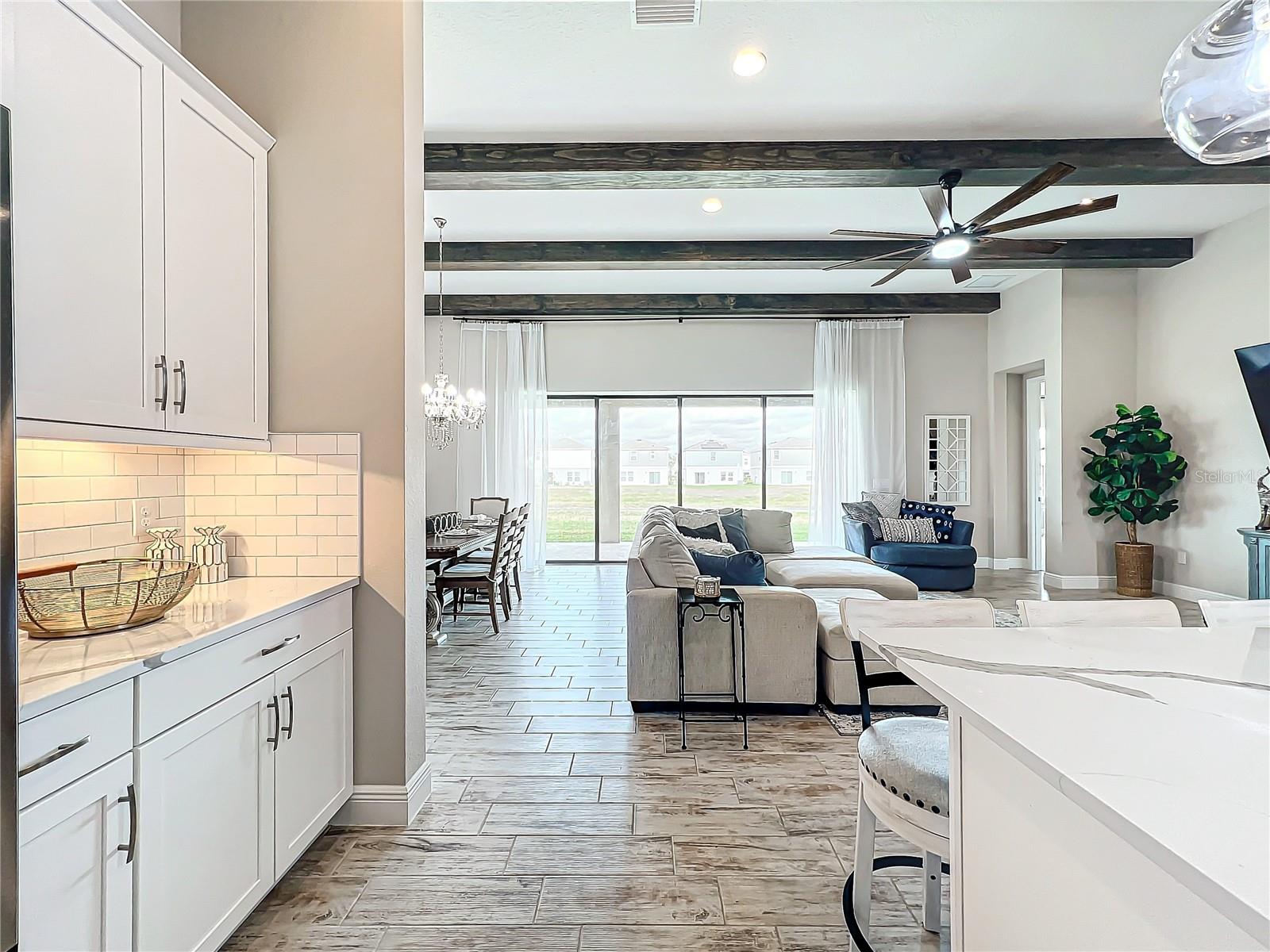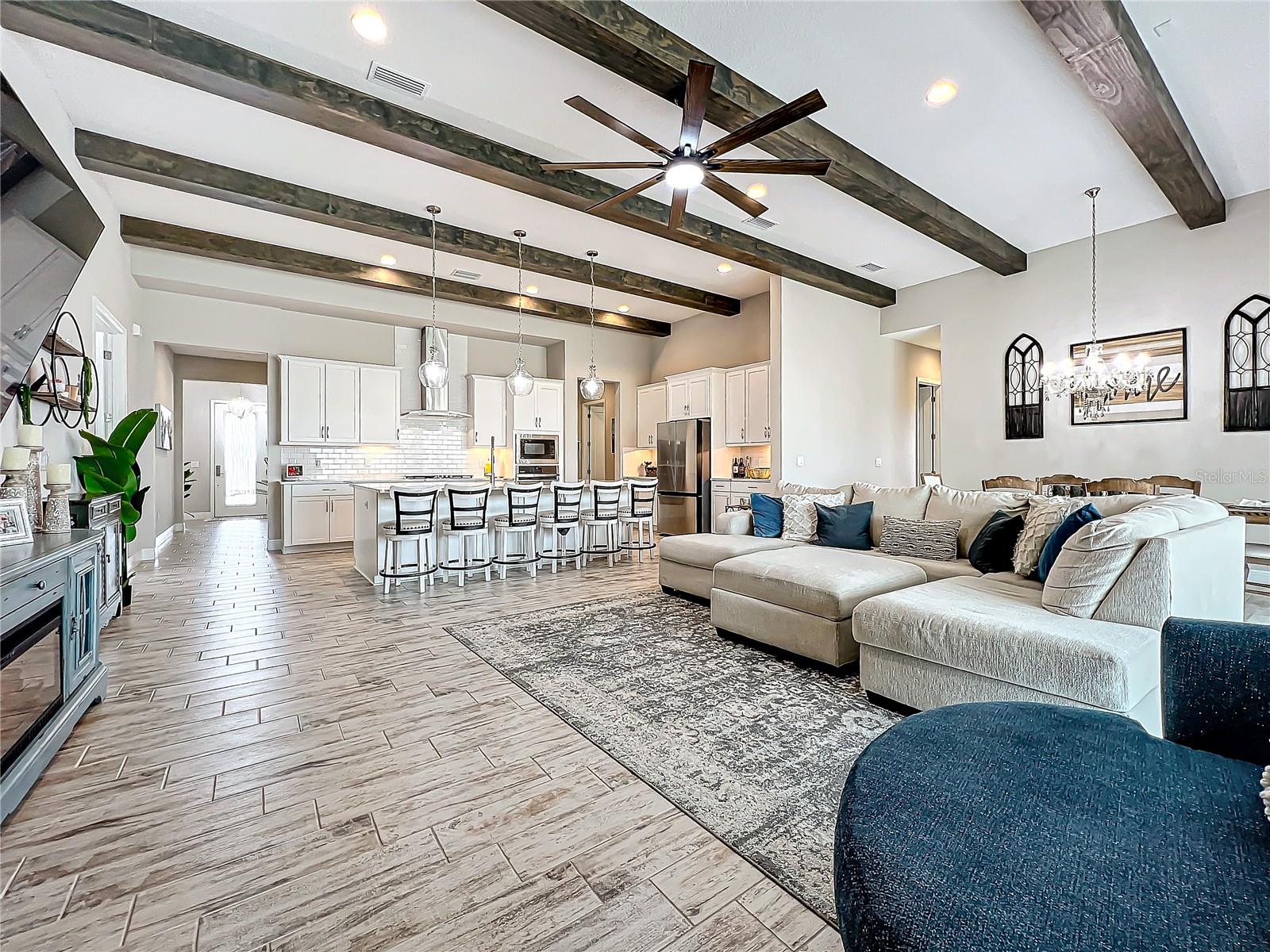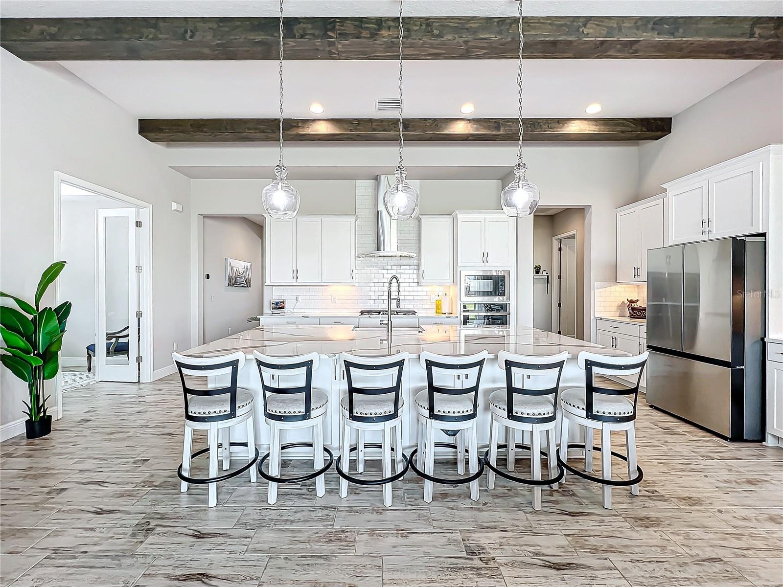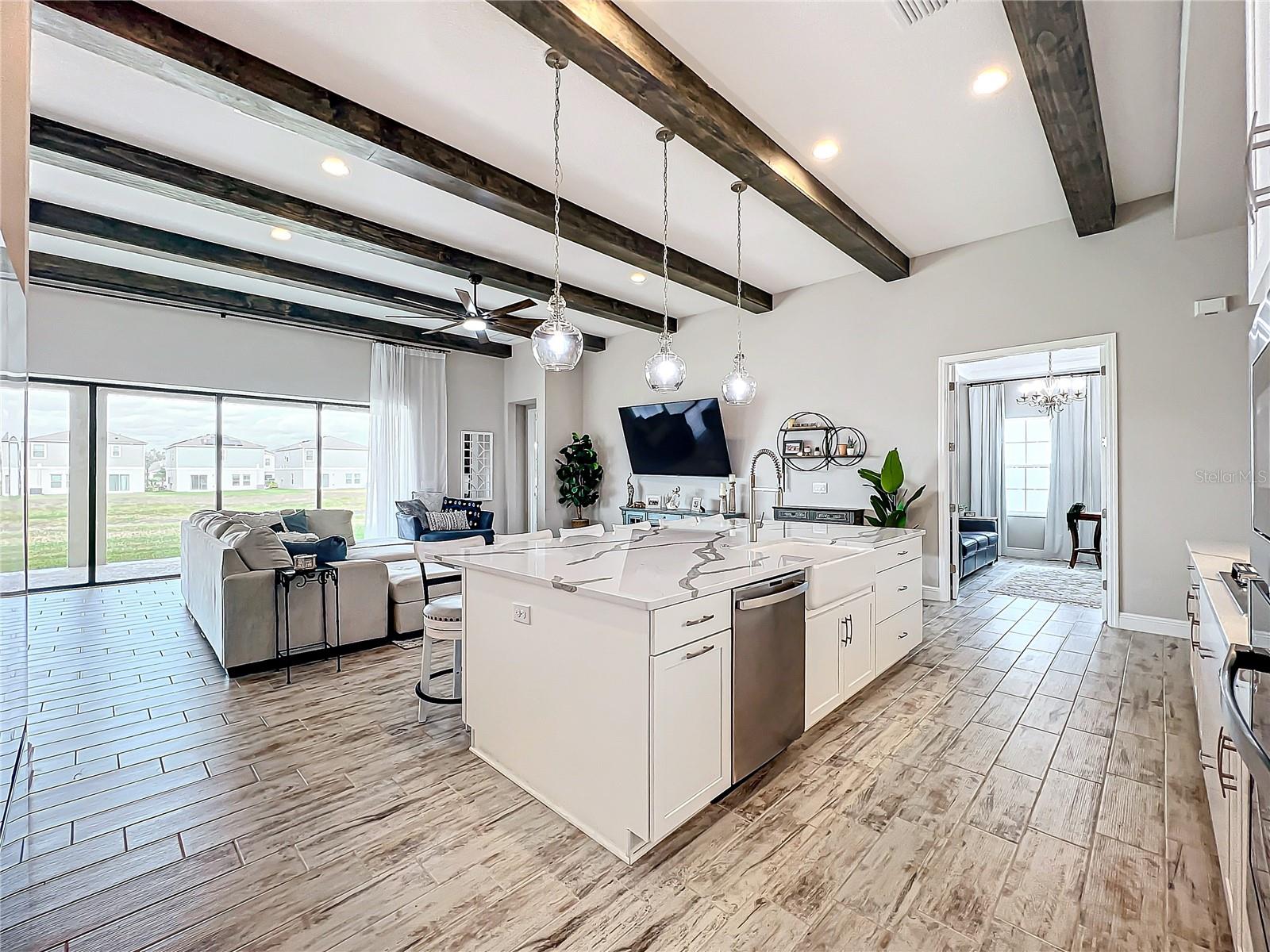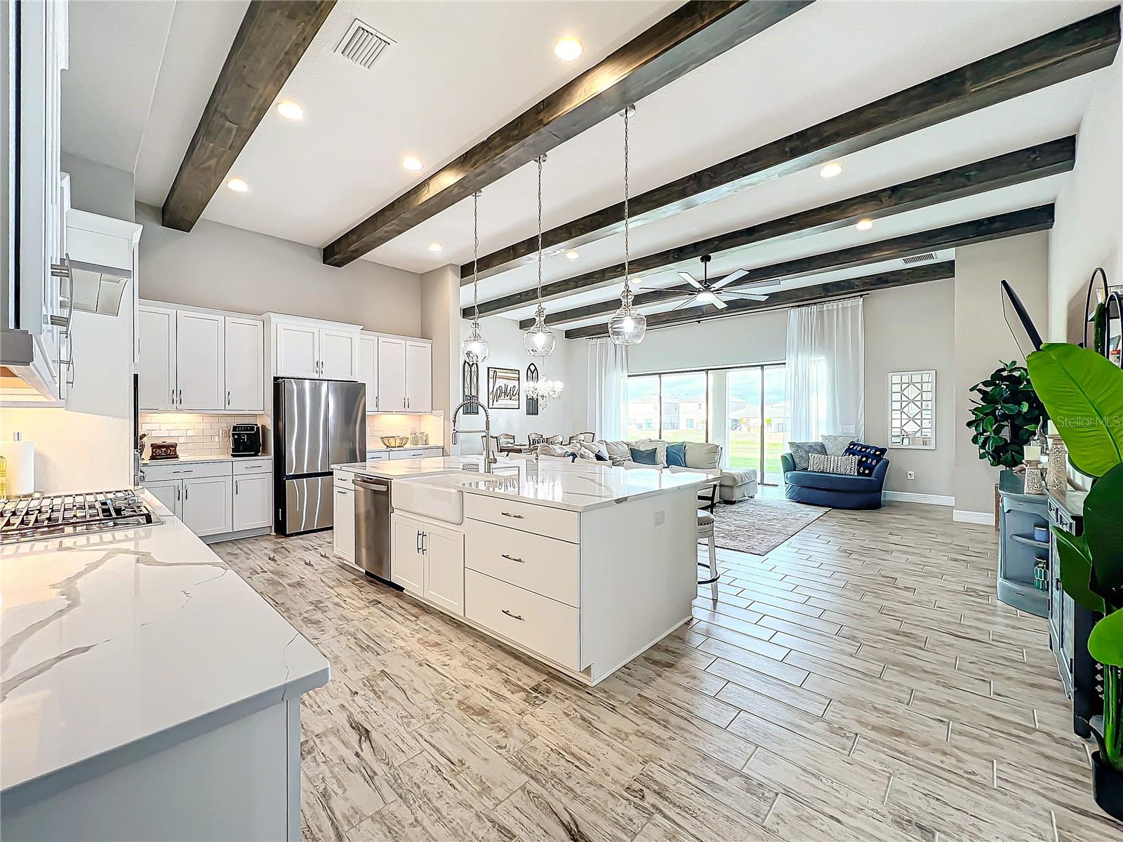 ** Melhoria de preços! ** O vendedor ajudará nos custos de fechamento! Após a entrada, este plano de piso de 2.535 pés quadrados o cumprimenta com um vestíbulo alongado que flui para a impressionante sala, uma cozinha cuidadosamente projetada, sala de estar e combinação de sala de jantar que cria um layout aberto e convidativo perfeito para a vida entre entretenimento e cotidiano. Os tetos altos de 12 pés são lindamente acentuados com vigas impressionantes de teto, acrescentando um toque grandioso e refinado ao espaço, enquanto as portas de bolso de vidro deslizantes de quádruplos inundam a área com luz natural ao longo do dia. Esta incrível casa de um andar destaca acabamentos elegantes, incluindo pisos de ladrilhos de tábuas de madeira de luxo, portas internas de 8 'e luminárias requintadas que adicionam um toque de sofisticação a todos os quartos. The gourmet kitchen is a true centerpiece, showcasing stainless steel appliances, stunning quartz countertops, subway tile backsplash, modern range hood, gas cooktop, microwave wall oven combo, undercounter lighting, and upgraded 42” wood cabinets with crown molding - supplying the chef with all the necessary tools to create culinary masterpieces. An oversized island allows for extra eating space and doubles as an additional O Breakfast Bar, fornecendo amplo assento para todos. Banheiro, tornando-o um espaço ideal para hóspedes ou sogros. Um chuveiro de chuva montado no teto e um chuveiro montado na parede para uma experiência personalizada e indulgente. O pôr do sol, misturando perfeitamente a vida interna e externa. Sarasota, Tampa ou São Petersburgo.