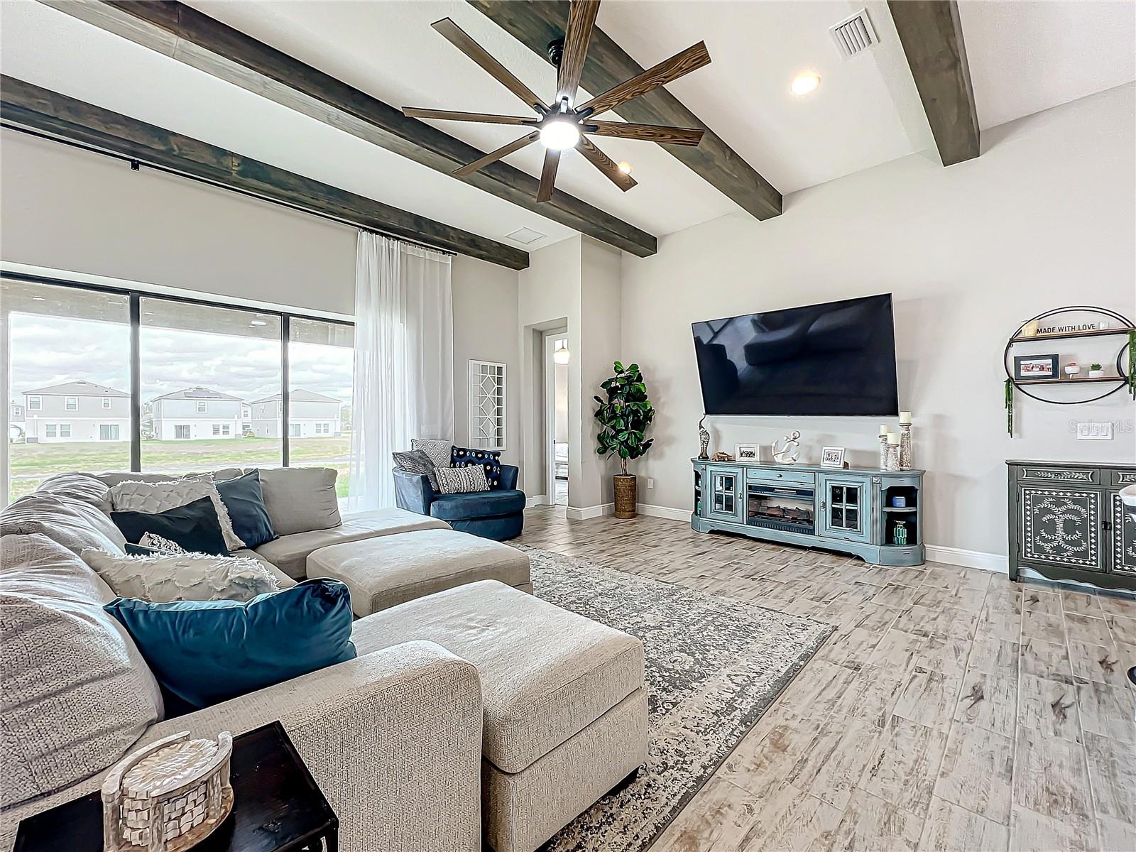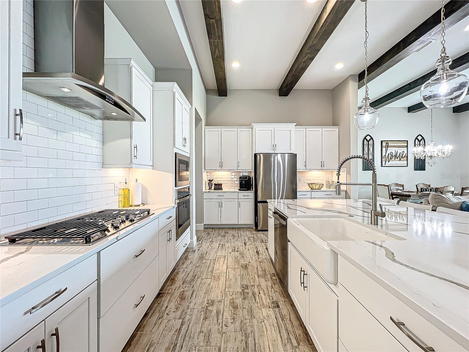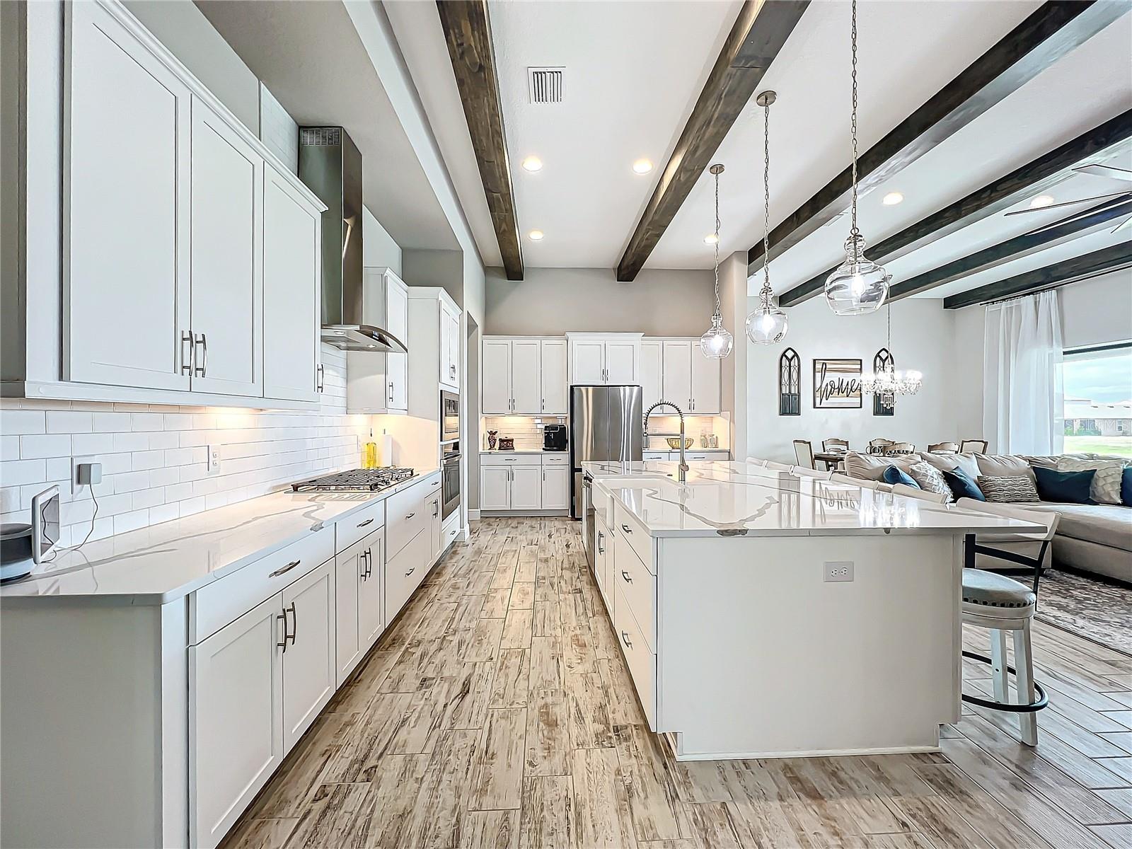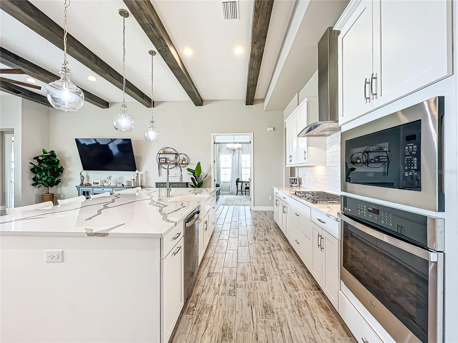 ** Melhoria de preços! ** O vendedor ajudará nos custos de fechamento! Após a entrada, este plano de piso de 2.535 pés quadrados o cumprimenta com um vestíbulo alongado que flui para a impressionante sala, uma cozinha cuidadosamente projetada, sala de estar e combinação de sala de jantar que cria um layout aberto e convidativo perfeito para a vida entre entretenimento e cotidiano. Os tetos altos de 12 pés são lindamente acentuados com vigas impressionantes de teto, acrescentando um toque grandioso e refinado ao espaço, enquanto as portas de bolso de vidro deslizantes de quádruplos inundam a área com luz natural ao longo do dia. Esta incrível casa de um andar destaca acabamentos elegantes, incluindo pisos de ladrilhos de tábuas de madeira de luxo, portas internas de 8 'e luminárias requintadas que adicionam um toque de sofisticação a todos os quartos. The gourmet kitchen is a true centerpiece, showcasing stainless steel appliances, stunning quartz countertops, subway tile backsplash, modern range hood, gas cooktop, microwave wall oven combo, undercounter lighting, and upgraded 42” wood cabinets with crown molding - supplying the chef with all the necessary tools to create culinary masterpieces. An oversized island allows for extra eating space and doubles as an additional O Breakfast Bar, fornecendo amplo assento para todos. Banheiro, tornando-o um espaço ideal para hóspedes ou sogros. Um chuveiro de chuva montado no teto e um chuveiro montado na parede para uma experiência personalizada e indulgente. O pôr do sol, misturando perfeitamente a vida interna e externa. Sarasota, Tampa ou São Petersburgo.
