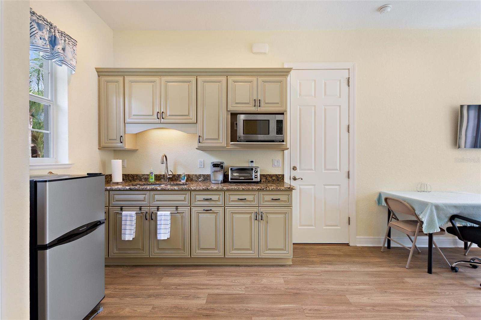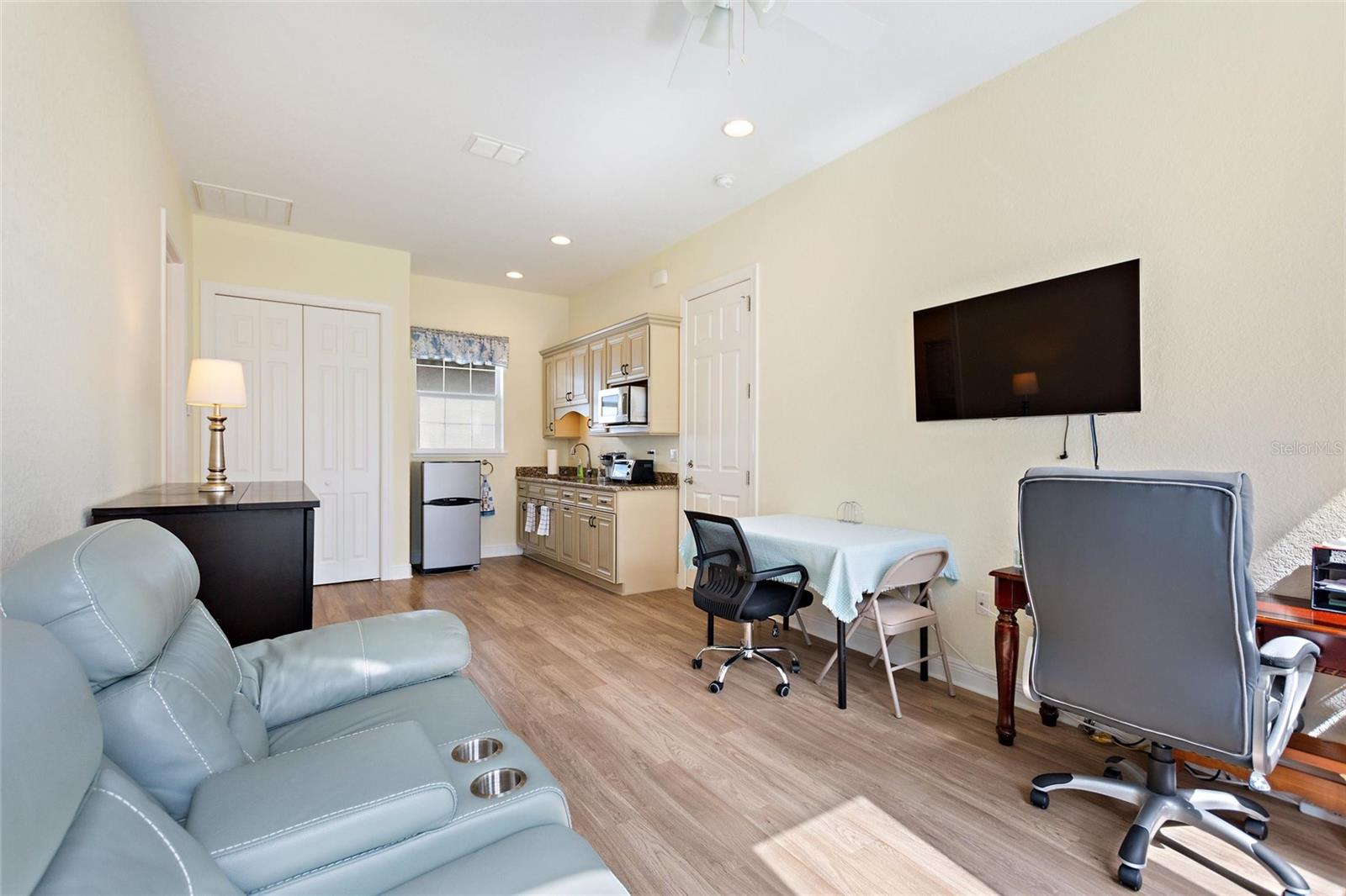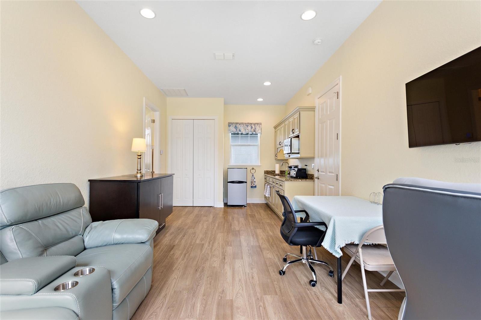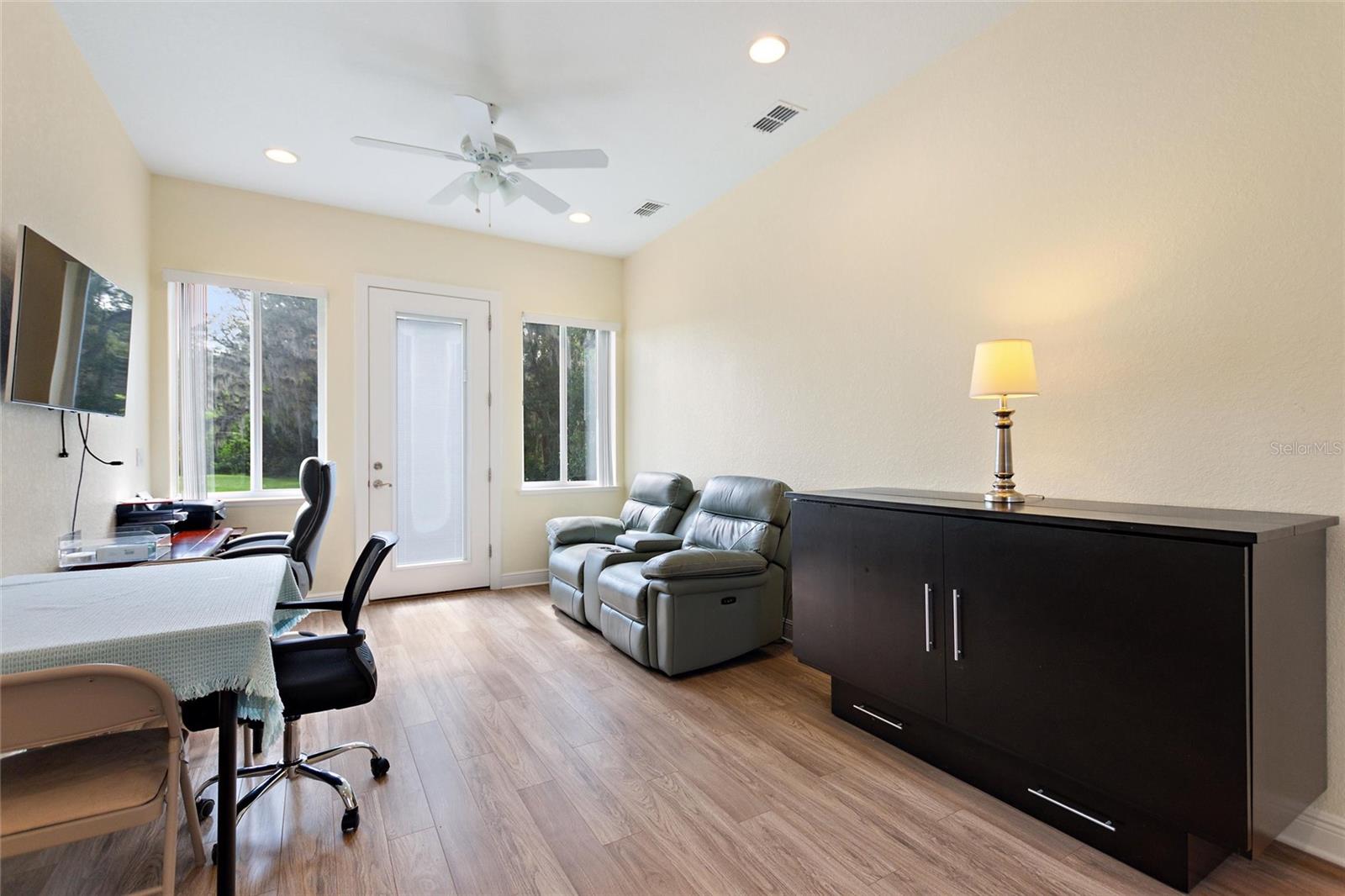 Este pequeno estúdio bem projetado é perfeito para viver em seu trailer e ao mesmo tempo ter a capacidade de entreter ou receber visitas de empresas. Poderia dobrar para um escritório doméstico. A casa de banho completa está muito bem equipada e tem uma enorme lavandaria. Tem também garagem para carrinhos de golfe ou pode ser usada para arrumos. tem quintal privativo e espaço para ampliação e construção lateral na restante área disponível do lote.