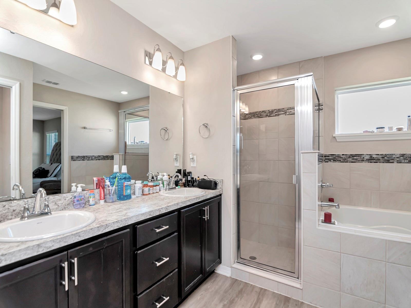 Esta casa requintada oferece 4 quartos e 2 banheiros localizados em Auburn Cove. Esta planta aberta é ideal para entretenimento. Desfrute desta espaçosa cozinha com armários Expresso de 36", eletrodomésticos Samsung em aço inoxidável, uma ilha espaçosa e uma despensa. A área de estar, a lavanderia e os banheiros incluem luxuoso piso de tábuas de vinil de madeira, enquanto o resto da casa apresenta manchas. carpete resistente. A suíte do proprietário dispõe de closet e banheiro privativo com pia dupla, chuveiro de azulejos, banheira de jardim e banheiro privativo fechado. Esta casa dispõe de varanda coberta, amaciante de água, telhas arquitetônicas e. isolamento e janelas com eficiência energética.