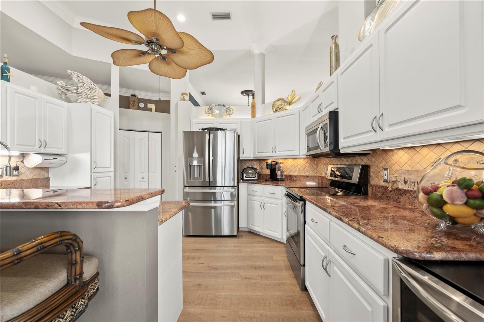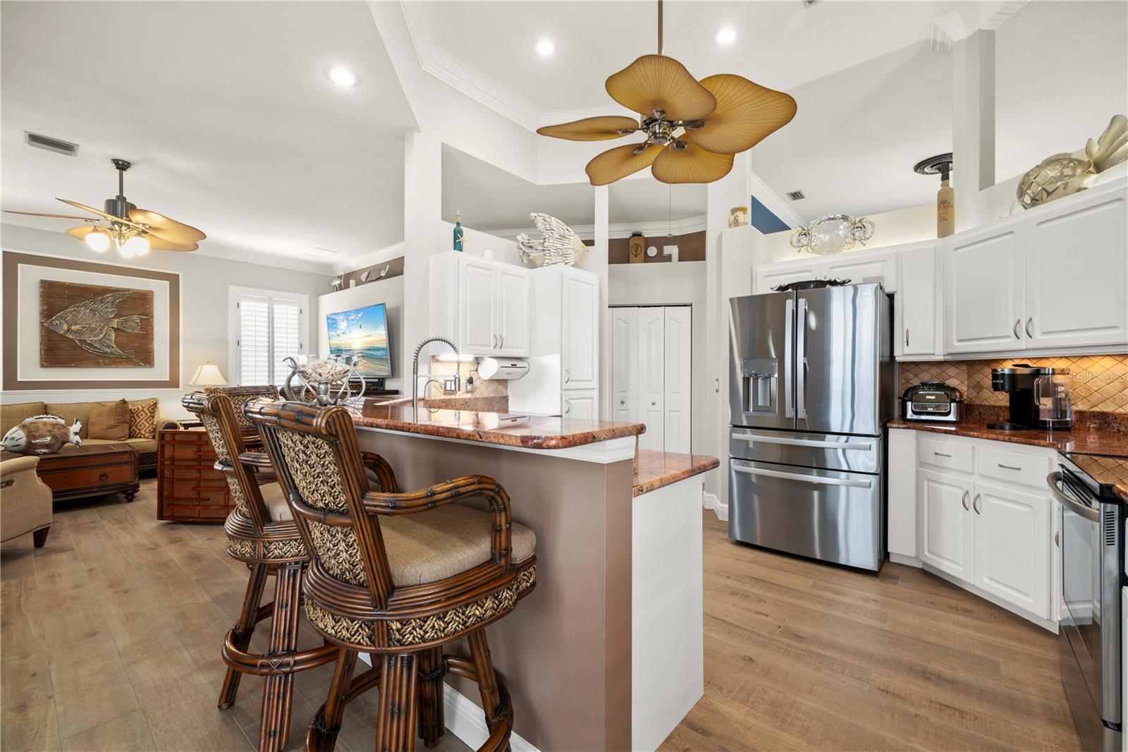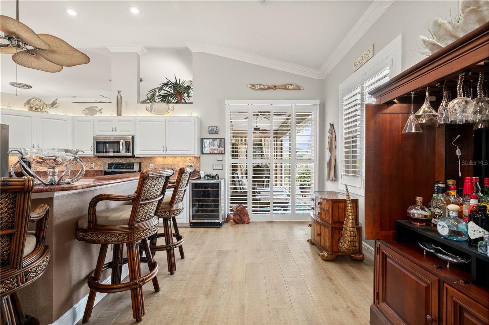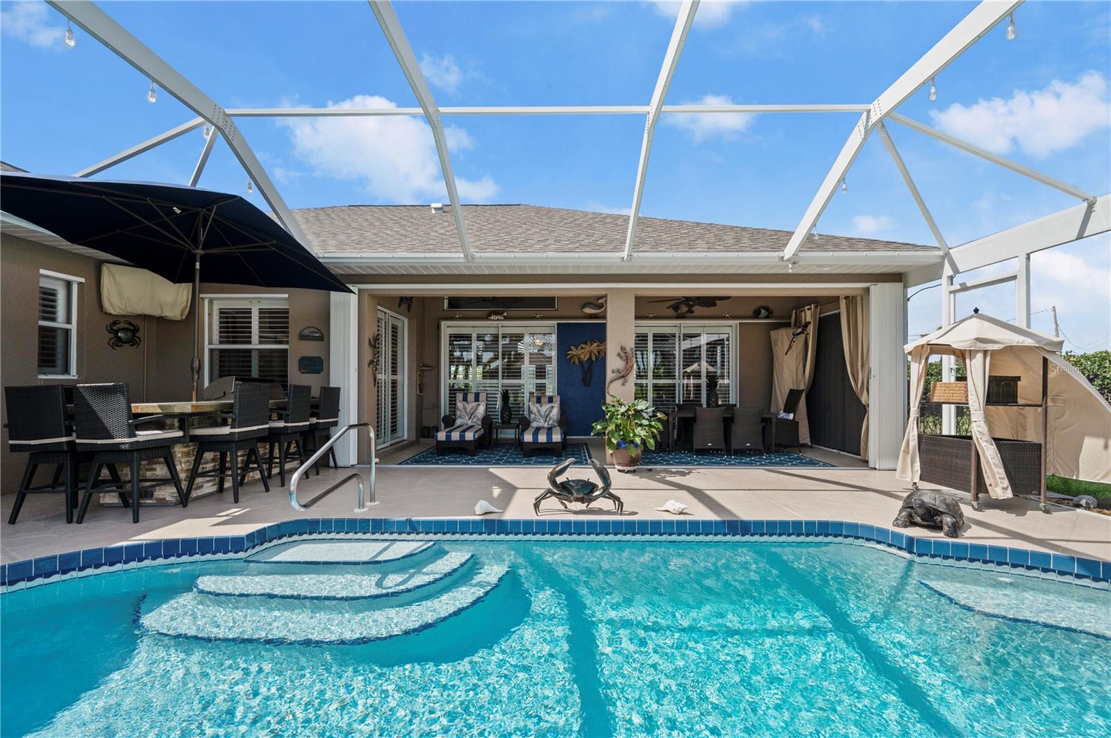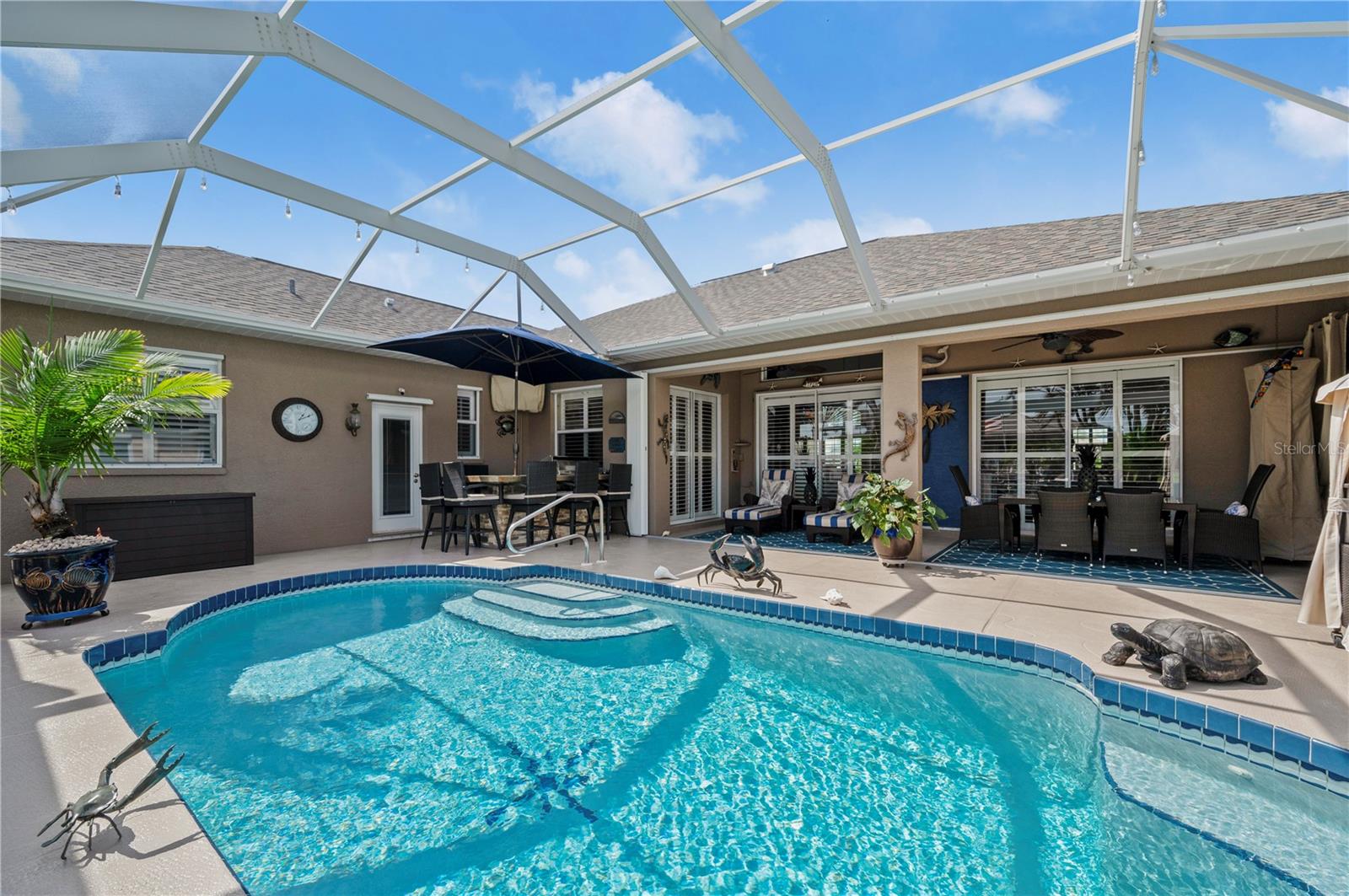 Bem-vindo a esta luxuosa propriedade à beira-mar em Port Charlotte, que oferece 25 metros de frente de água salgada e acesso sem ponte ao rio Myakka, ao porto de Charlotte e ao Golfo do México - perfeito para velejadores ávidos e entusiastas da pesca. Com um telhado novo (2021) e sem restrições de HOA ou escritura, esta casa combina uma vida refinada com total flexibilidade. Ao chegar, a entrada de automóveis pavimentada com tijolos e o paisagismo meticulosamente mantido com iluminação de destaque criam uma primeira impressão convidativa. Passe pelas portas frontais de vidro com chumbo para uma área de estar aberta e iluminada, com tetos altos, sancas de três peças e venezianas personalizadas que adicionam elegância a toda a casa. A cozinha remodelada é o coração da casa, com bancadas de granito, backsplash elegante de azulejos, eletrodomésticos de aço inoxidável e uma grande ilha com balcão para café da manhã - perfeita para hospedagem e vida cotidiana. A espaçosa suíte master se abre diretamente para a varanda, oferecendo um retiro privativo com closets personalizados da Closets by Design e um luxuoso banheiro privativo com pia dupla e um moderno box com chuveiro. Dois quartos adicionais, ambos com closets, compartilham um banheiro de hóspedes com acesso direto à piscina, tornando-o ideal para visitantes ou familiares. O espaço ao ar livre é um verdadeiro oásis. Desfrute da cozinha exterior blindada e relaxe junto à piscina aquecida, equipada com um novo sistema solar e de bomba de calor (2021), tudo isto enquanto aprecia as serenas vistas para o mar. A nova doca composta com fiação e estacas para elevador de barco garante acesso rápido e fácil à água, sem pontes no caminho para o Golfo ou o local ideal para sentar e apreciar o pôr do sol da Flórida. As características adicionais incluem um sistema de sprinklers bem alimentado, descalcificador de água e osmose reversa, e uma espaçosa garagem para 2 carros com armazenamento abundante e nova porta de tela de garagem. Todos localizados a uma curta distância de carro da US 41, lojas, restaurantes, praia e aeroporto de Punta Gorda. Esta casa oferece uma mistura perfeita de luxo, conveniência e estilo de vida à beira-mar. Não perca a oportunidade de experimentar esta propriedade excepcional!