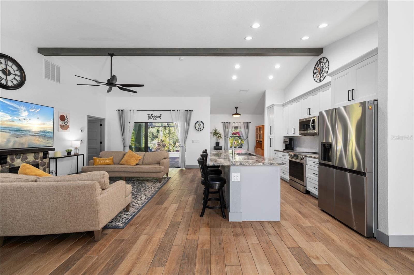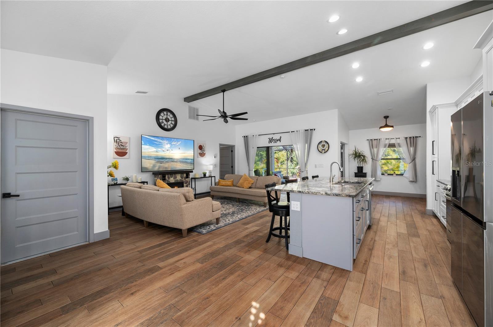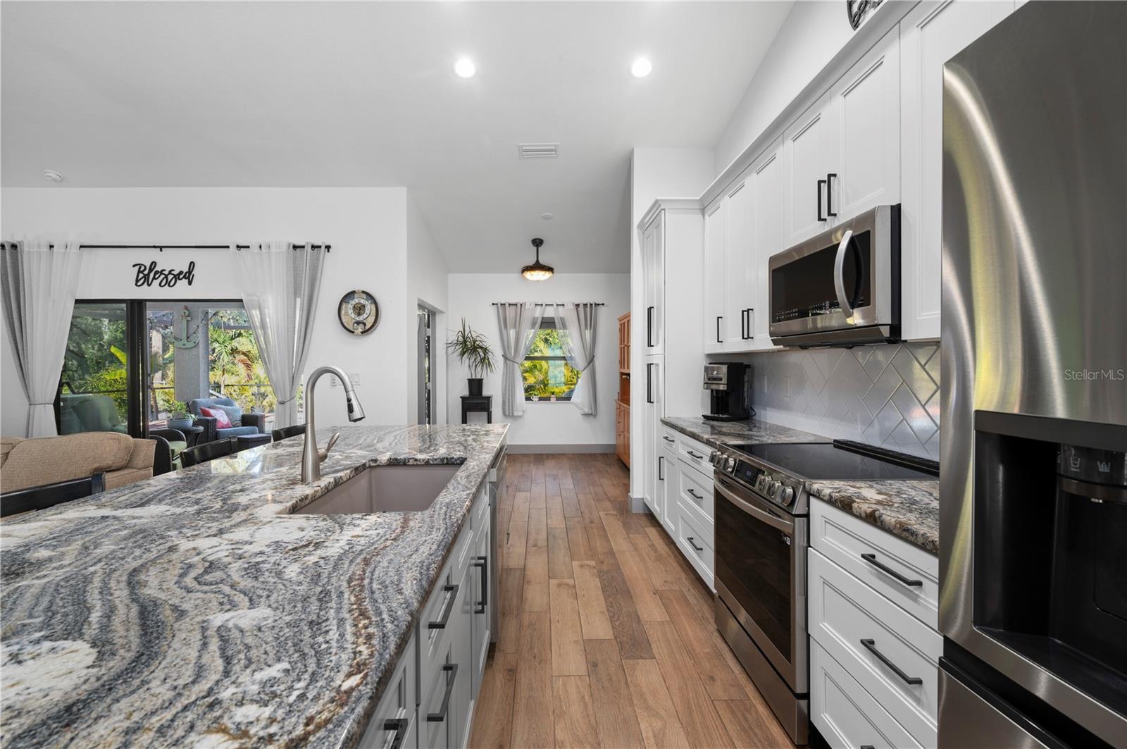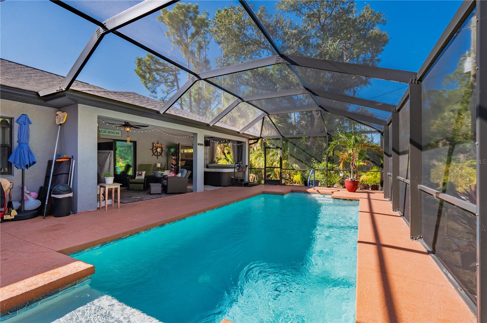Não é necessário seguro contra inundações! Esta casa personalizada quase nova de 2022 oferece 3 quartos, 2 banheiros e uma garagem para 2 carros, 1.445 pés quadrados, com forte ênfase em materiais de qualidade e design raramente disponível com foco em ADA. A propriedade fica em um terreno privativo com paisagismo com palmeiras Areca e Calusias, e está cercada pela natureza. Dentro da entrada frontal com tela, a planta aberta flui graciosamente com todo o piso de porcelanato, teto com vigas de catedral e cozinha com um distinto balcão e bar de granito cinza com pia de fazendeiro, luminárias atualizadas, armários de design com fechamento suave e backsplash de azulejos de metrô em espinha de peixe. A despensa possui estantes extraíveis e saídas duplas, eletrodomésticos LG em inox e iluminação embutida com dimmer para completar o espaço de trabalho. Na sala principal, portas de vidro deslizantes abrem o espaço para a varanda e uma convidativa piscina de água salgada com aquecimento elétrico de 12 x 24 pés. A grande varanda coberta amplia o espaço de estar e um spa Smokey Mountain para 5 pessoas está disponível. A piscina tem degraus de um lado e uma espreguiçadeira Baja do outro, ideal para se bronzear ou relaxar. A vegetação rodeia a piscina protegida para maior privacidade. As portas francesas abrem da área da piscina para o quarto principal ou sala de jantar, e também há acesso à banheira da piscina. Ambos os banheiros têm chuveiros de azulejos, balcões de granito com pias montadas embaixo, corrimãos, portas de 36" de largura - refletindo os recursos personalizados adequados para ADA embutidos no design. O quarto principal também possui uma bandeja de teto e ventiladores atualizados são encontrados por toda parte, assim como portas de design de luxo. Um aquecedor de água sem tanque fornece eficiência, e o ar condicionado Ruud está bem conservado e na garantia. A lavadora e secadora Whirlpool permanecem na garagem, mas as rampas de entrada serão removidas. A casa também está conectada para um gerador para toda a casa, tem uma entrada extra larga e, no geral, a propriedade reflete escolhas cuidadosas, acabamentos duráveis e artesanato que favorecem o conforto e a facilidade de vida a longo prazo.