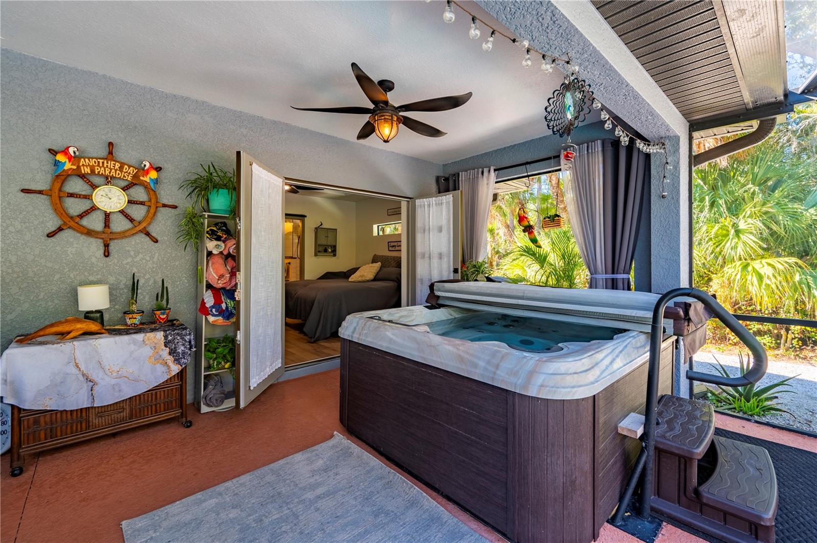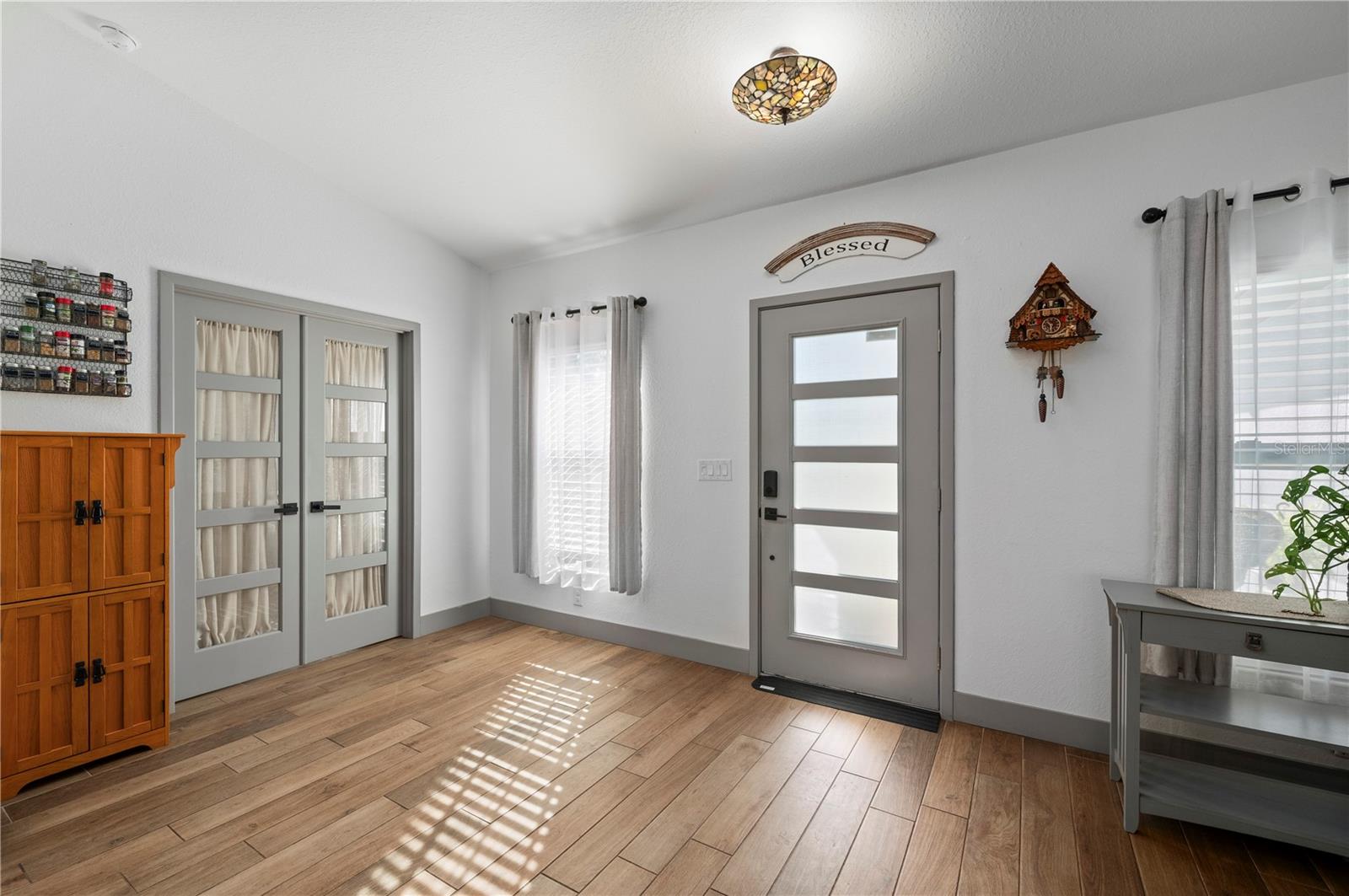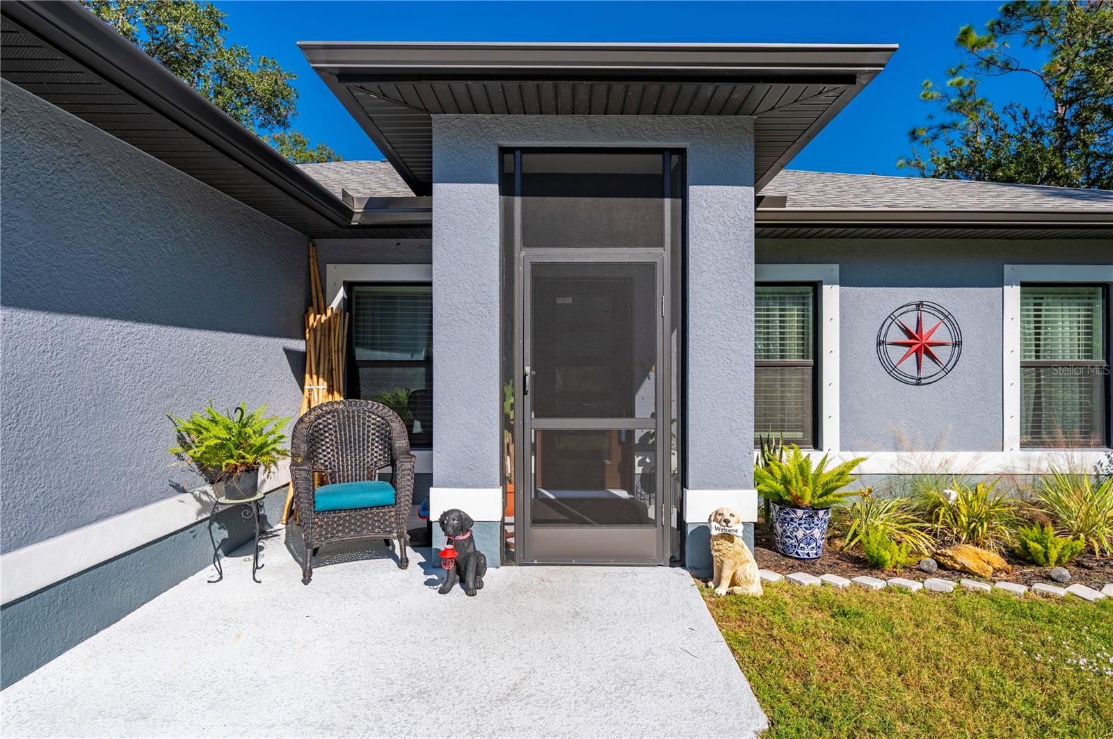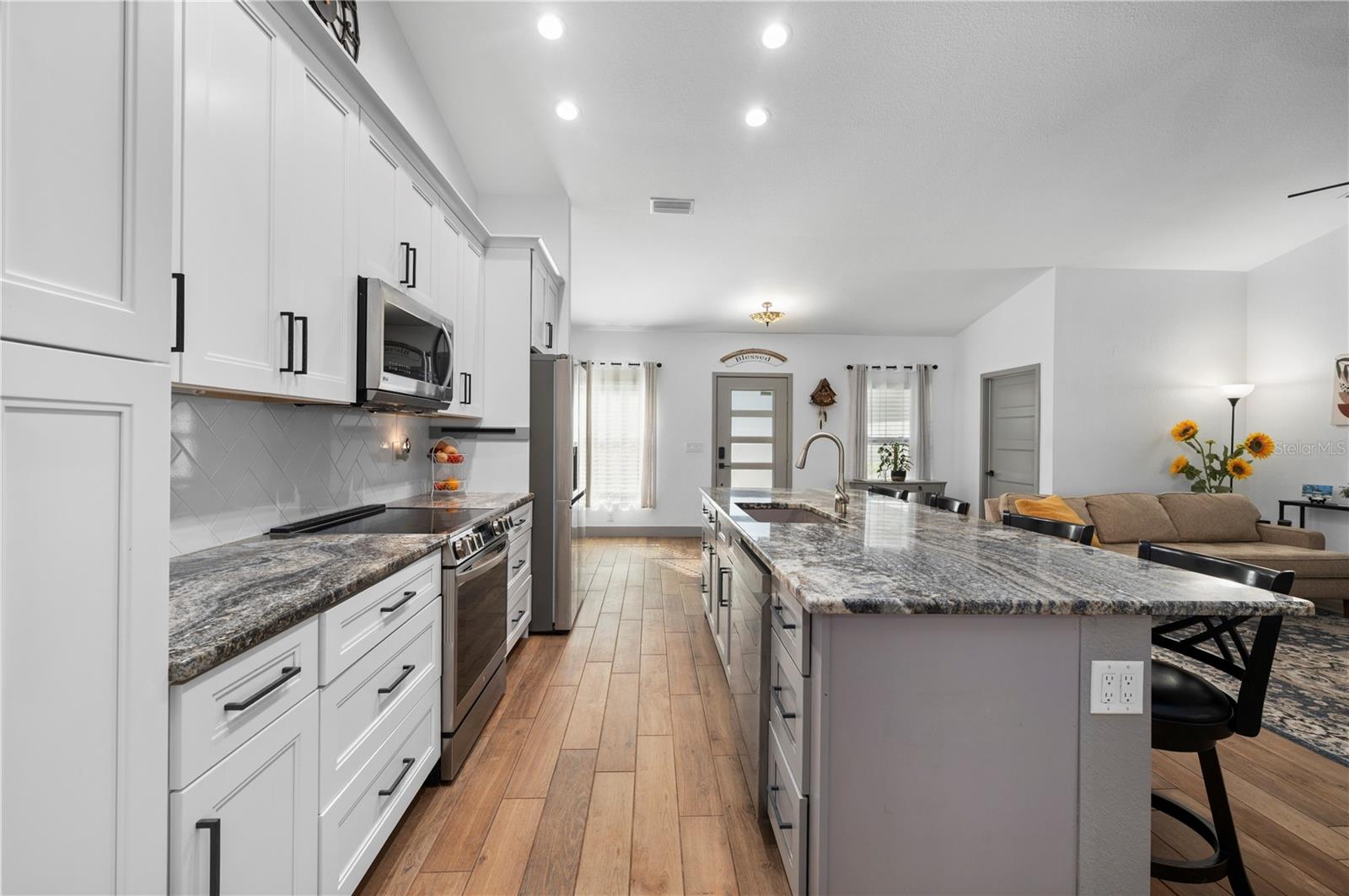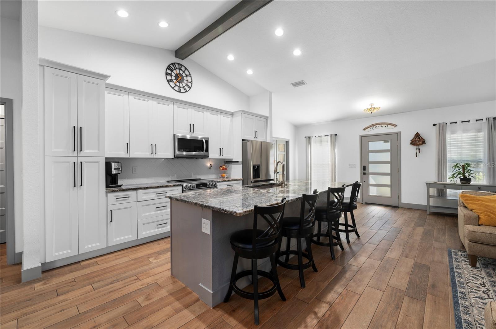 Não é necessário seguro contra inundações! Esta casa personalizada quase nova de 2022 oferece 3 quartos, 2 banheiros e uma garagem para 2 carros, 1.445 pés quadrados, com forte ênfase em materiais de qualidade e design raramente disponível com foco em ADA. A propriedade fica em um terreno privativo com paisagismo com palmeiras Areca e Calusias, e está cercada pela natureza. Dentro da entrada frontal com tela, a planta aberta flui graciosamente com todo o piso de porcelanato, teto com vigas de catedral e cozinha com um distinto balcão e bar de granito cinza com pia de fazendeiro, luminárias atualizadas, armários de design com fechamento suave e backsplash de azulejos de metrô em espinha de peixe. A despensa possui estantes extraíveis e saídas duplas, eletrodomésticos LG em inox e iluminação embutida com dimmer para completar o espaço de trabalho. Na sala principal, portas de vidro deslizantes abrem o espaço para a varanda e uma convidativa piscina de água salgada com aquecimento elétrico de 12 x 24 pés. A grande varanda coberta amplia o espaço de estar e um spa Smokey Mountain para 5 pessoas está disponível. A piscina tem degraus de um lado e uma espreguiçadeira Baja do outro, ideal para se bronzear ou relaxar. A vegetação rodeia a piscina protegida para maior privacidade. As portas francesas abrem da área da piscina para o quarto principal ou sala de jantar, e também há acesso à banheira da piscina. Ambos os banheiros têm chuveiros de azulejos, balcões de granito com pias montadas embaixo, corrimãos, portas de 36" de largura - refletindo os recursos personalizados adequados para ADA embutidos no design. O quarto principal também possui uma bandeja de teto e ventiladores atualizados são encontrados por toda parte, assim como portas de design de luxo. Um aquecedor de água sem tanque fornece eficiência, e o ar condicionado Ruud está bem conservado e na garantia. A lavadora e secadora Whirlpool permanecem na garagem, mas as rampas de entrada serão removidas. A casa também está conectada para um gerador para toda a casa, tem uma entrada extra larga e, no geral, a propriedade reflete escolhas cuidadosas, acabamentos duráveis e artesanato que favorecem o conforto e a facilidade de vida a longo prazo.