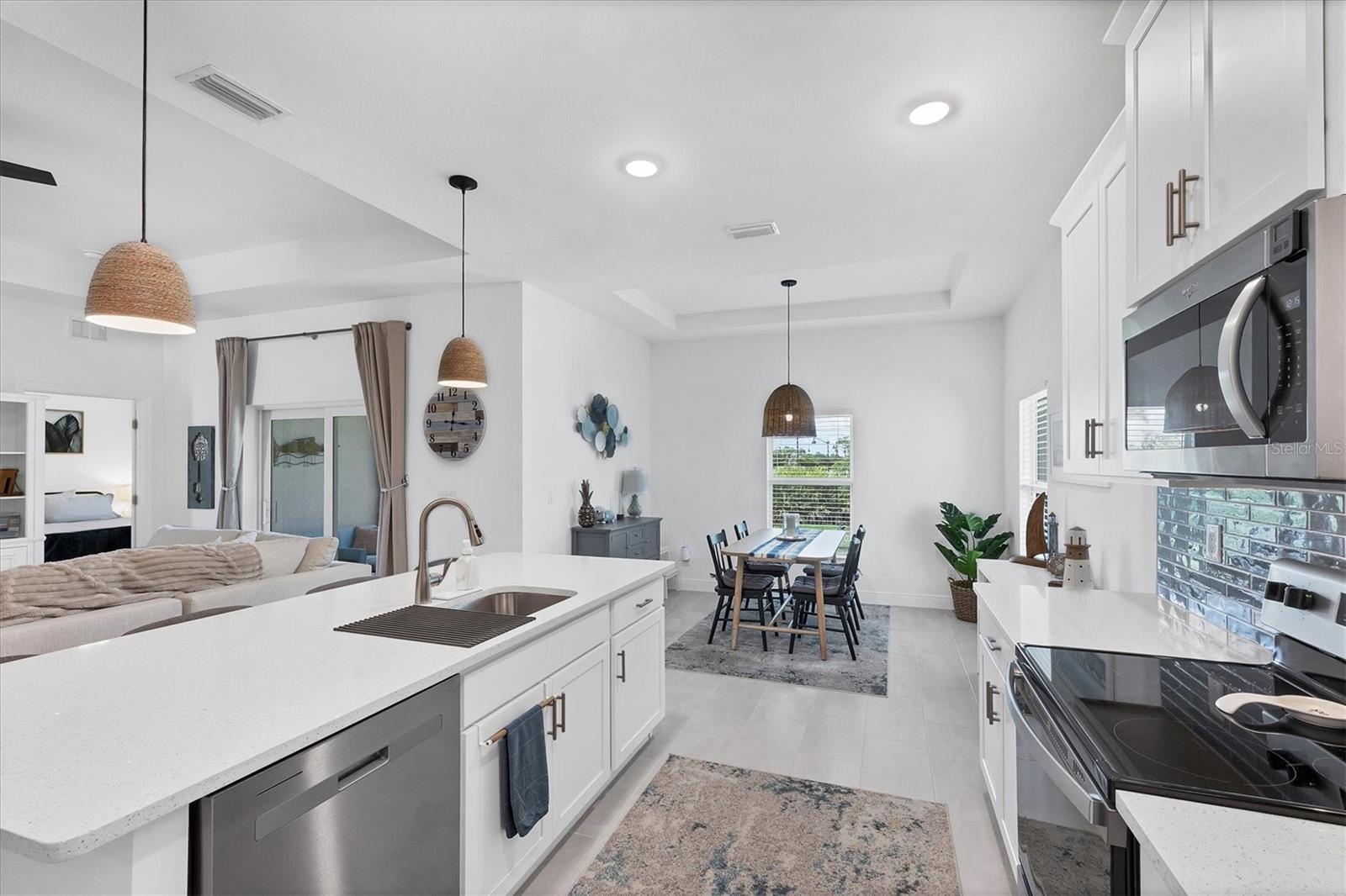 Bem-vindo à vida costeira tranquila no coração do sudoeste da Flórida. Este Palm Model lindamente atualizado de Christopher Alan Homes está pronto para morar e cheio de charme, oferecendo a combinação perfeita de conforto, estilo e paz de espírito. Entre pela porta de vidro e sinta-se em casa no espaço aberto e iluminado, repleto de luz natural. O layout flui perfeitamente da convidativa sala de estar para a área de jantar e para uma cozinha deslumbrante projetada para beleza e funcionalidade. A cozinha possui uma grande ilha com iluminação pendente de vime, um lindo backsplash de azulejos, eletrodomésticos de aço inoxidável e uma DESPENSA WALK-IN completa com armários e bancadas de açougueiro - um sonho para armazenamento e organização. A suíte primária privada oferece um retiro tranquilo, apresentando um espaçoso SISTEMA DE ARMÁRIO PERSONALIZADO com gavetas e prateleiras embutidas, além de um luxuoso banheiro privativo com pias duplas de quartzo e um box amplo com box de vidro. Os quartos de hóspedes são igualmente convidativos e separados por uma elegante casa de banho completa com acabamentos em quartzo. Saia para sua varanda com tela e desfrute de vistas do quintal cercado com NOVO SOD E PAISAGEM, proporcionando o espaço perfeito para relaxar ou se divertir. A casa também inclui lavanderia acabada, piso de garagem revestido com epóxi e é construída com JANELAS DE IMPACTO, PORTAS E PORTA DE GARAGEM para maior segurança e eficiência energética. O melhor de tudo é que está localizado em uma ZONA X FLOOD, oferecendo maior segurança e menores custos de seguro. Situado na desejável comunidade de West Port, você desfrutará de mais de 450 acres de comodidades, incluindo um novo centro aquático, campos de futebol, um campo de golfe de 18 buracos, playgrounds e quilômetros de trilhas panorâmicas para caminhada e ciclismo - tudo a poucos minutos de lojas, restaurantes, cuidados de saúde, Charlotte Sports Park e das praias do Golfo.