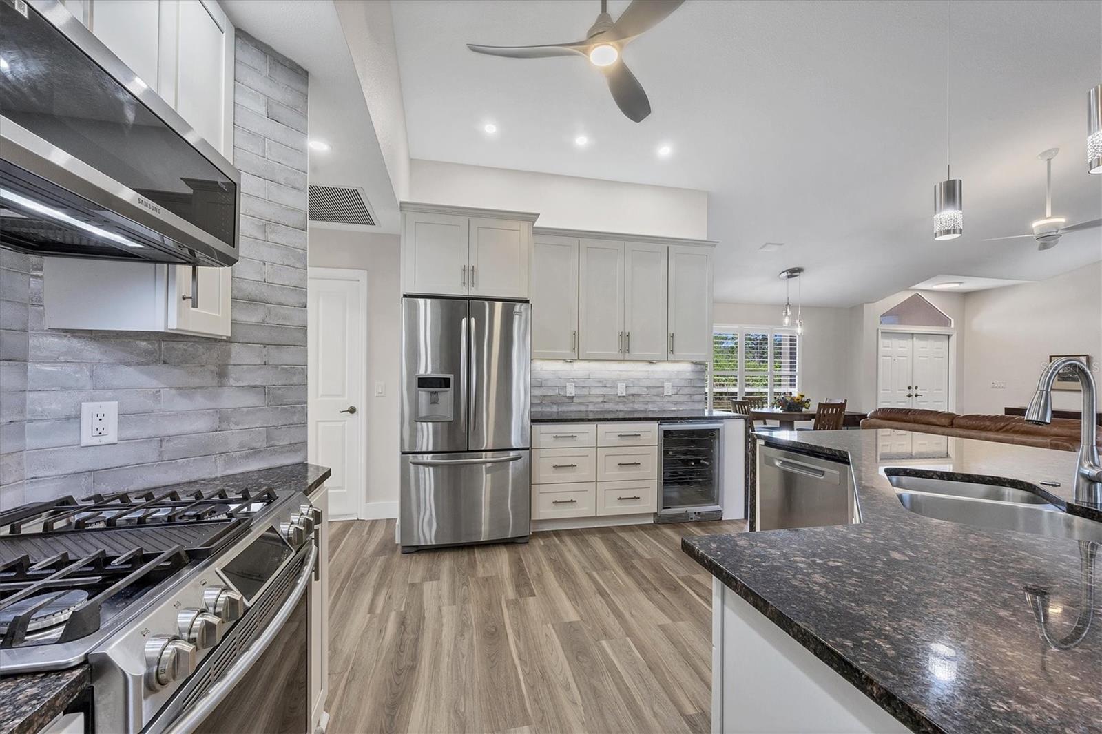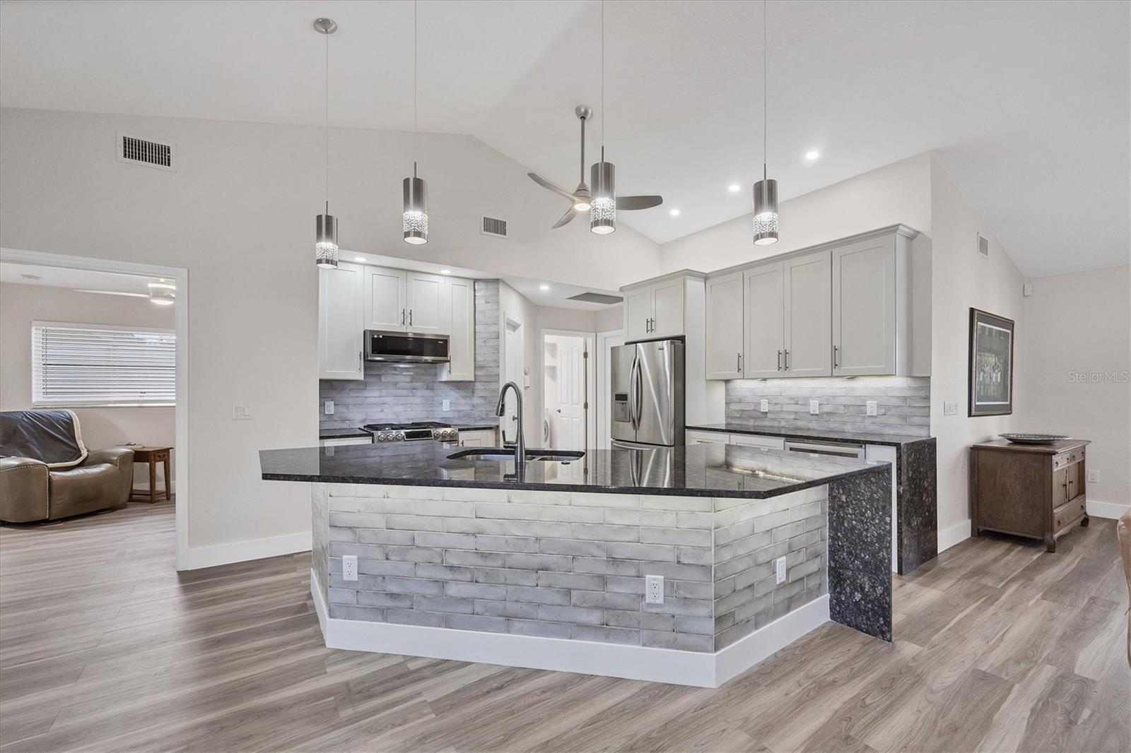PREÇO PARA VENDER! LOCALIZAÇÃO! LOCALIZAÇÃO! BEIRA-MAR! ELEVADOR DE BARCO e DOCA! Esta propriedade absolutamente deslumbrante à BEIRA-MAR fica em um canal SEM pontes. GRANDE ELEVAÇÃO. Você pode até querer pescar um pouco à noite no barco ou no cais! Esta casa tem uma bela planta aberta que tem um fluxo maravilhoso de um cômodo para o outro e foi totalmente remodelada por dentro com pintura nova, por dentro e por fora, além de um novo telhado de metal e sistema de água RO para toda a casa. Tudo, desde iluminação LED e piso totalmente novo. Enorme novo banheiro master com banheira vitoriana, grande box de vidro e pia flutuante. Os visitantes vão adorar o banheiro de hóspedes, totalmente atualizado com uma grande ducha de vidro. A pièce de résistance é a cozinha, o coração da casa, e para os cozinheiros gourmet caseiros, você encontrará uma grande ilha com tampo de granito para preparar todas as suas refeições, armários extra altos com armazenamento extra e, o melhor, um forno/fogão a gás, um achado raro na Flórida. Todos os aparelhos de aço inoxidável. E para aqueles belos dias e noites da Flórida, relaxe na varanda e tome uma bebida na grande piscina/spa enquanto a cachoeira flui para relaxar. O Lanai ainda tem uma nova gaiola panorâmica para piscina. E, quando as noites esfriarem, entre na espaçosa sala e acenda a lareira! Melhor ainda, venha e veja por si mesmo. Você não ficará desapontado! Não perca a oportunidade de morar nesta linda casa em um bairro tranquilo e com tudo ao seu alcance.