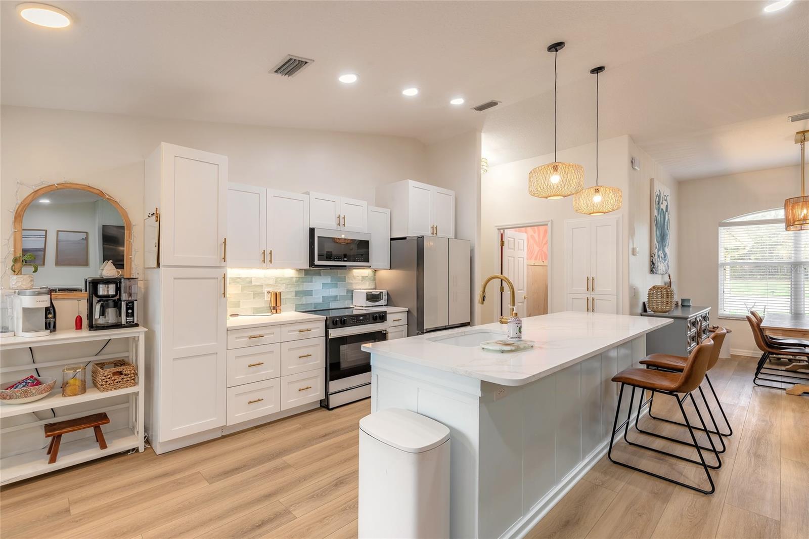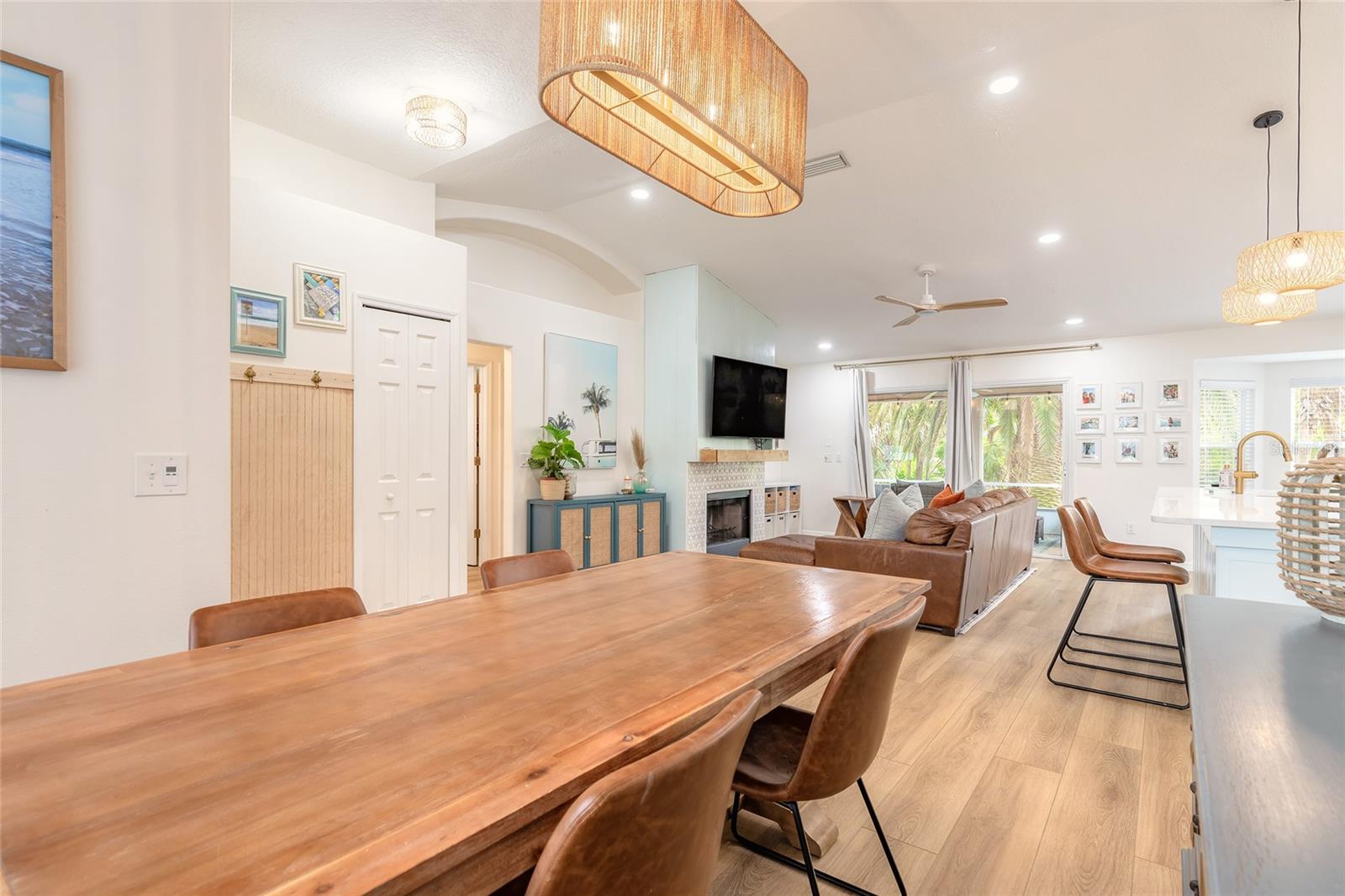 Lindamente atualizado 3/2/2, casa pronta para morar! A cozinha remodelada foi aberta para a família e para a área de jantar, criando um fluxo luminoso e contínuo, perfeito para entretenimento! Os recursos incluem piso LVP de tábuas largas, iluminação embutida, luminárias de design, bancadas de quartzo, detalhes dourados, backsplash de azulejos costeiros e novos eletrodomésticos. A área de estar é ancorada por uma verdadeira lareira a lenha, limpa e recapeada com azulejos personalizados. Desfrute de novos ventiladores de teto, detalhes em madeira, lavanderia interna e garagem para 2 carros com revestimento Shark. Do lado de fora, um quintal privado totalmente cercado e uma varanda oferecem o retiro perfeito em um beco sem saída tranquilo. A planta dividida inclui uma espaçosa suíte principal com banheiro privativo, closet, penteadeira grande, vaso sanitário e chuveiro grande. Com localização central e zoneamento para Sweetwater Elementary, Creekside Middle e Spruce Creek High!