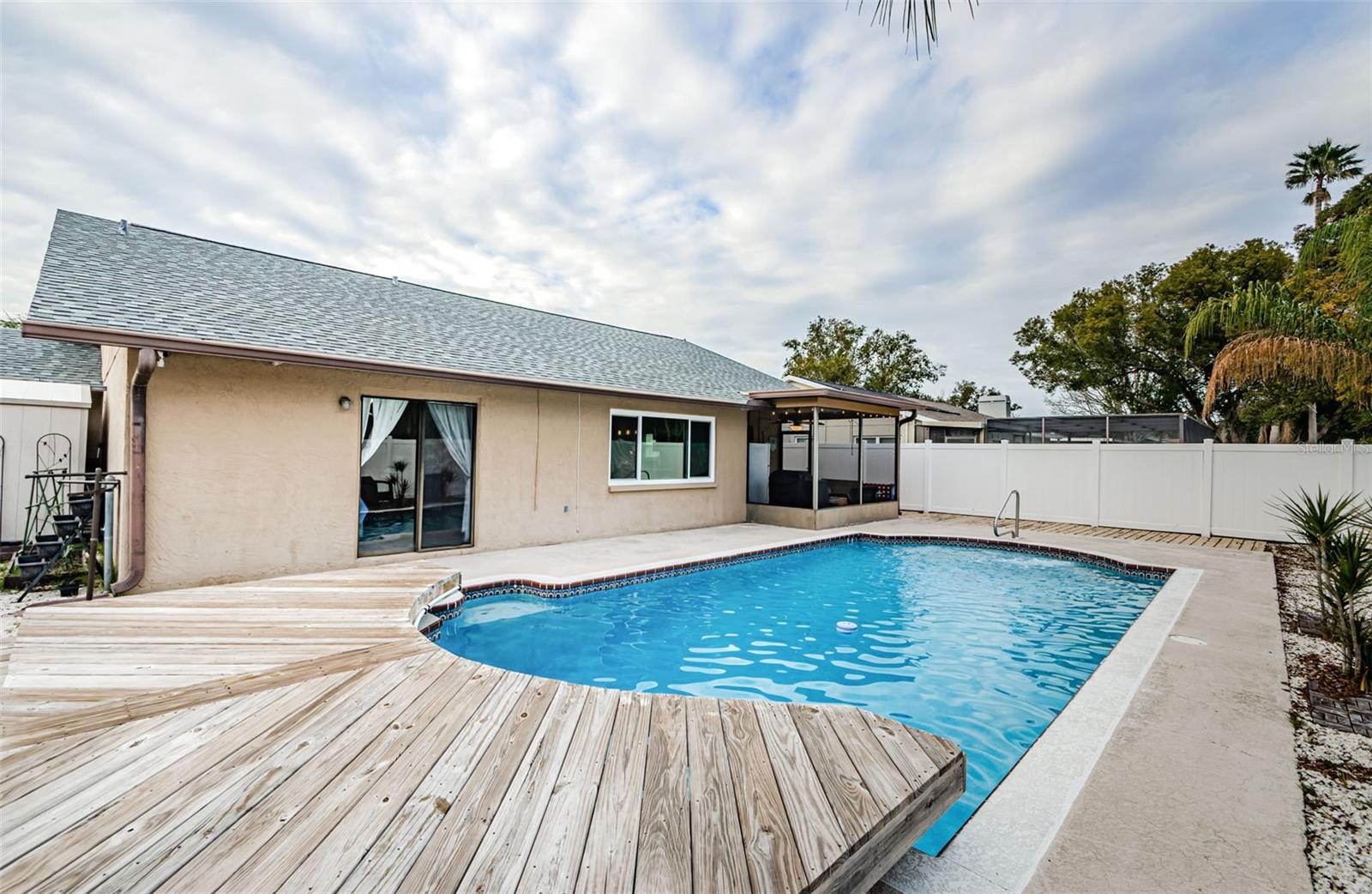 Grande valor nesta casa de piscina localizada em um beco sem saída. Dê um passo para esta casa unifamiliar lindamente atualizada, com uma piscina e um deck deslumbrante. Os ladrilhos de cerâmica de bom gosto compõem o piso, o que leva à cozinha atualizada adornada com bancadas de quartzo, utensílios de aço inoxidável (nova geladeira e lava-louças) com muito espaço para cozinhar e se preparar com uma grande ilha de cozinha. O plano arejado de piso aberto permite que você se conecte com a família e os amigos na sala de estar enquanto ainda está na cozinha. A sala oferece muito espaço para se divertir e para colocar uma TV grande. O espaçoso quarto primário possui um lindo banheiro privativo, bem como um closet. Os quartos secundários são bastante espaçosos e fornecem fácil acesso ao banheiro atualizado adjacente. Relaxe na varanda exibida ou no convés depois de dar um mergulho na piscina. Outras características desta casa incluem 2023 unidade A/C, bomba de piscina 2021, teto mais recente, sistema de vigilância totalmente funcional e nova cerca de PVC que circunda o grande quintal. Fique à vontade, sabendo que você está situado em um bairro tranquilo perto do final de um beco sem saída. A Chasco Elementary & Middle School fica a apenas dez minutos a pé.