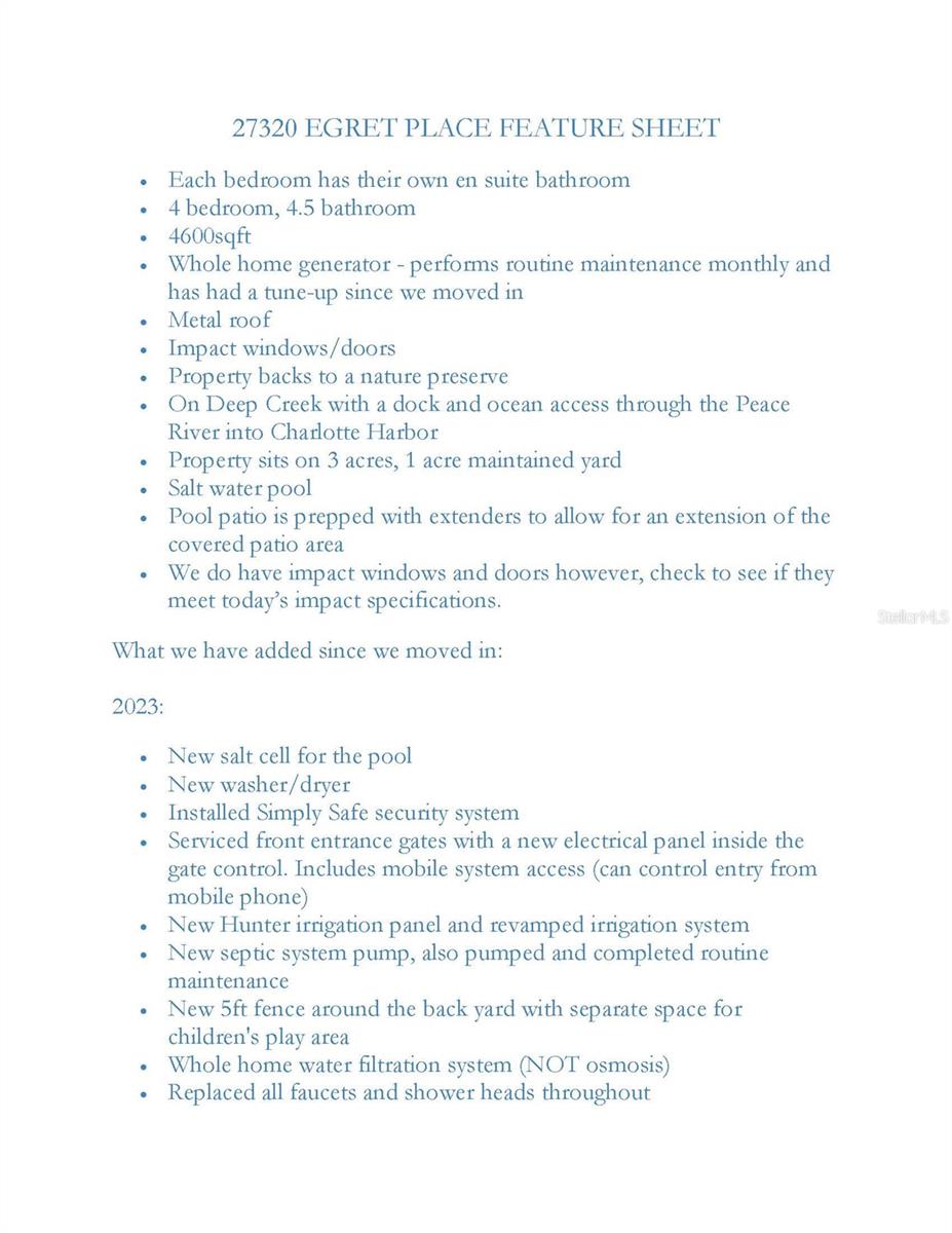 Nenhum dano ao furacão e nenhum seguro contra inundações é necessário é o que você encontrará nesta casa de Huons Cove, um nome que evoca um sentimento de paz, tranquilidade e desfrute de um ambiente sereno natural. Essas são apenas algumas das emoções que chamamos de "qualidade de vida" que você encontrará neste enclave das propriedades do estilo imobiliário. Por trás de um portão de privacidade está esta casa com maestria que captura a essência da influência arquitetônica do estilo country com os refinamentos apresentados nas casas de luxo de hoje. Aninhado em 3,05 acres de beleza natural, este lar de 4 quartos e 4,5 banheiros, a orla piscina à beira-mar, leva você de volta à doce inocência de anos passados, onde inúmeras horas de vida ao ar livre, aventura e descoberta o aguardavam. Após a entrada, você é cativado por tetos altos, atingindo quase 13 pés de altura e a abundância de luz natural que flui através de uma variedade de portas e janelas francesas. A madeira de madeira requintada encontrada nos armários e lareira personalizada aumenta a elegância sofisticada e é apenas o começo dos refinamentos de bom gosto e aprimoramentos sutis que tornam esta casa especial. Um teto coferido octogonal com iluminação ambiente adora a área de jantar aberta e é atendida pela despensa de um mordomo com seus armários de madeira escura, balcões de quartzo e geladeira de vinho. A cozinha de estilo gourmet é a inveja de qualquer chef que apresente uma série de utensílios Jennair de aço inoxidável de alta qualidade que incluem um forno duplo de 46 polegadas, duplo de combustível elétrico e fogão a propano, 2 lava-louças e uma ilha de 5'x7 'com pia de preparação e grande o suficiente para exibir uma grande variedade de lojas-cheias de culinária. Quantidades infinitas de armários de madeira com estilos de cores contrastantes com bancadas e backsplashes de quartzo luxuosos complementam o piso de vinil de luxo de carvalho branco que flui por toda a casa. Ao lado da área da cozinha, há um quarto familiar espaçoso, com som surround e espaço suficiente para sediar grandes grupos de amigos para o cinema ou eventos esportivos. Uma casa divertida perfeita, onde cada área de estar principal se abre para um espaçoso lanchonete ao ar livre, com uma piscina aquecida de água salgada de grandes dimensões e área de estar na lareira de madeira. Dê um passeio pelo caminho do tijolo que o leva à sua doca particular com elevador de 15k por um dia na água ou para desfrutar de uma noite sob as estrelas enquanto se senta ao redor da fogueira! Que melhor maneira de relaxar no ambiente pacífico de cada suíte de quarto, todos com banhos de suíte e armários. A suíte primária é excepcionalmente espaçosa, com um teto de bandeja octogonal iluminada ambiente, uma área de estar envolvente que captura vistas naturais de cenário e um closet de grandes dimensões com cômodas e armazenamento de estilo Butler. Se isso não for suficiente para estragá -lo, sempre há uma banheira jato para relaxar no final dos dias. Finalmente, a garagem de 3 carros de grandes dimensões oferece muito espaço para armazenamento adicional ou para o hobby aprimorar seu ofício. Seja um dia de barco pelas águas traseiras até o porto de Charlotte e as Ilhas do Golfo além, ou a uma curta distância de carro das lojas e restaurantes da histórica Punta Gorda, você não poderia pedir um lugar melhor para ligar para casa. Entre em contato conosco para obter uma lista completa de mais de 25 recursos e atualizações excepcionais que fazem disso uma oportunidade única na vida de aproveitar todas as conveniências modernas com as simplificações de qualidade de vida que tornam essa casa tão especial e onde as memórias ao longo da vida devem ser feitas.